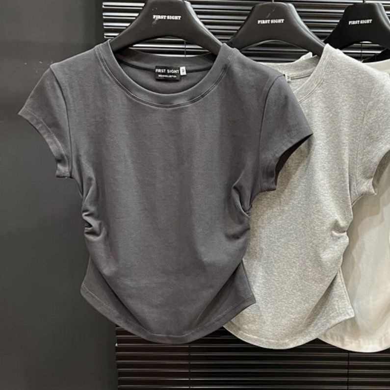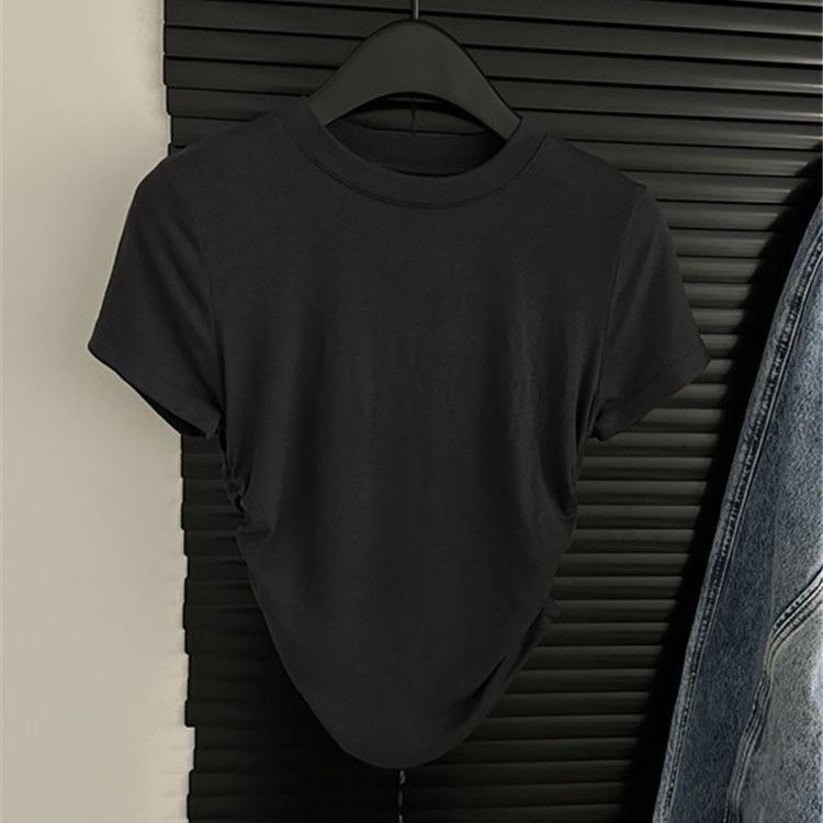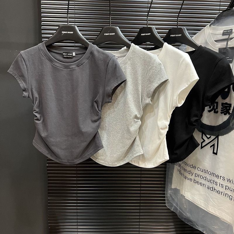 순수한 욕망 뜨거운 여자 슬림 유방 공개 반팔 티셔츠 여성 여름 2025 새로운 주름 디자인 짧은 탑 여성 유행스토어 가기