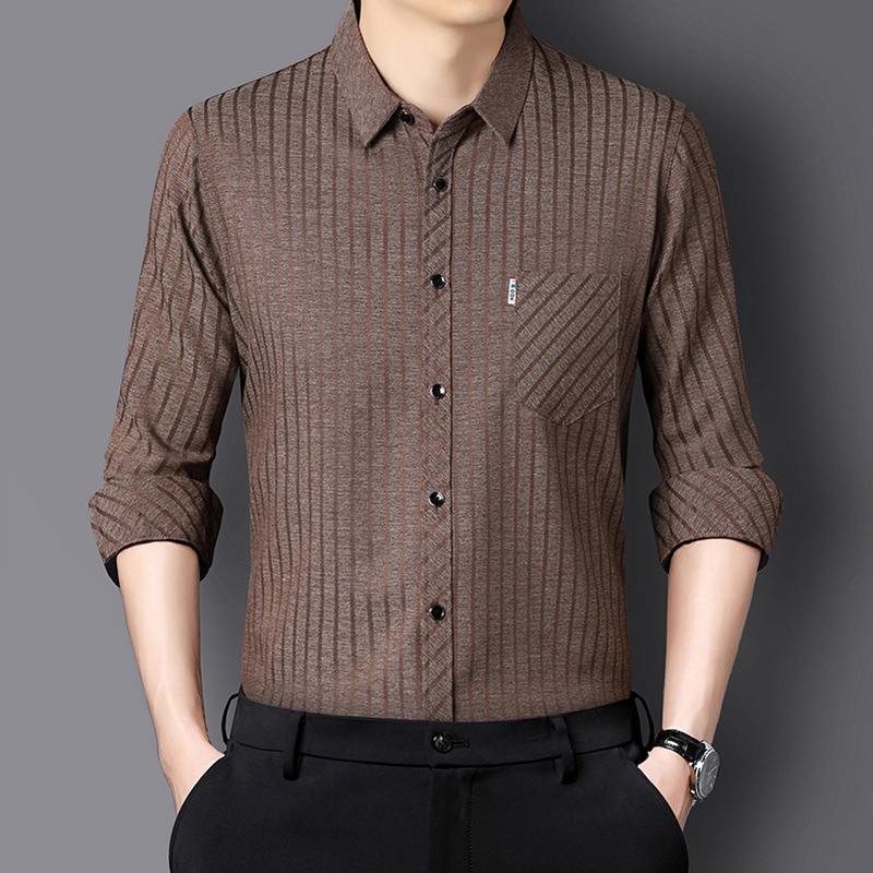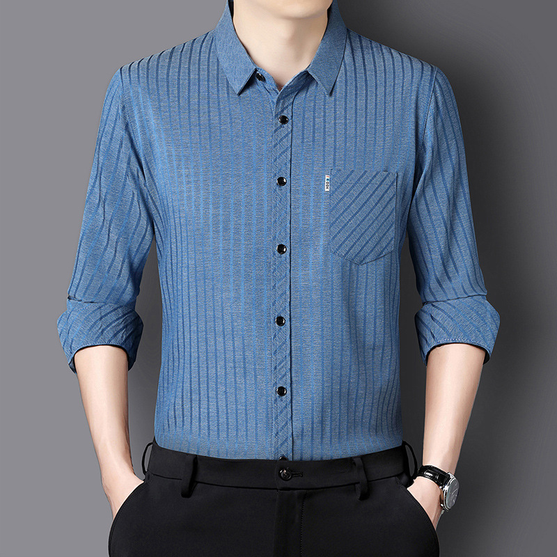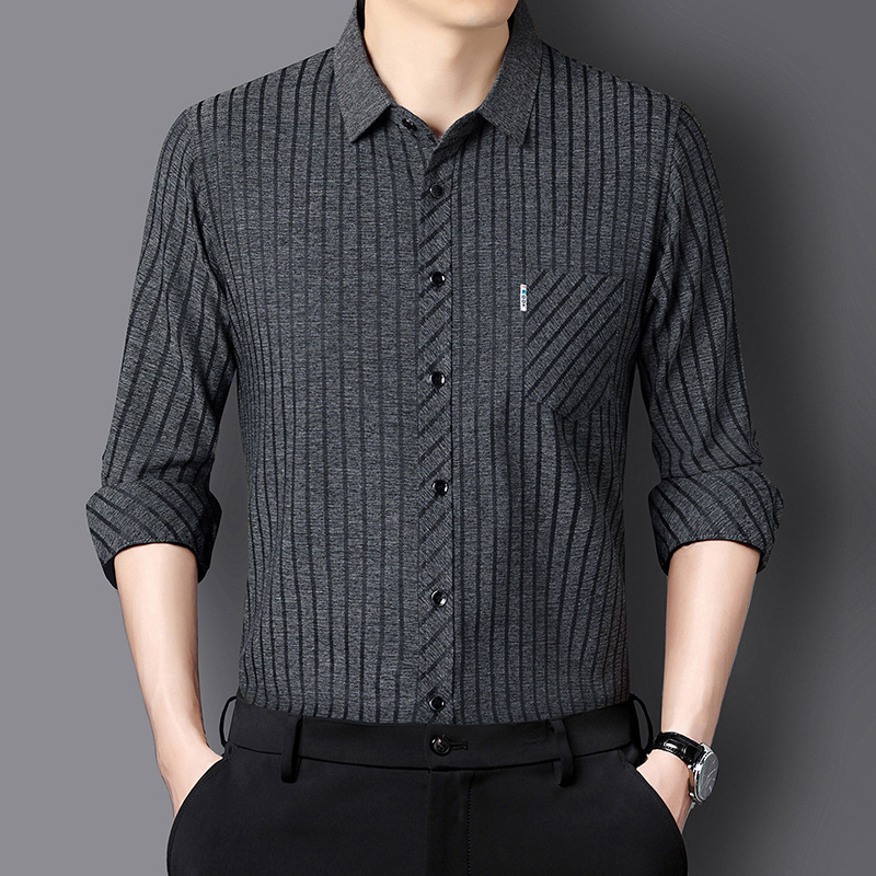 뽕나무 실크 중년 남성 긴팔 셔츠 아빠 스타일 가을 비즈니스 캐주얼 다림질 필요 없는 스트라이프 셔츠 남성 상의스토어 가기