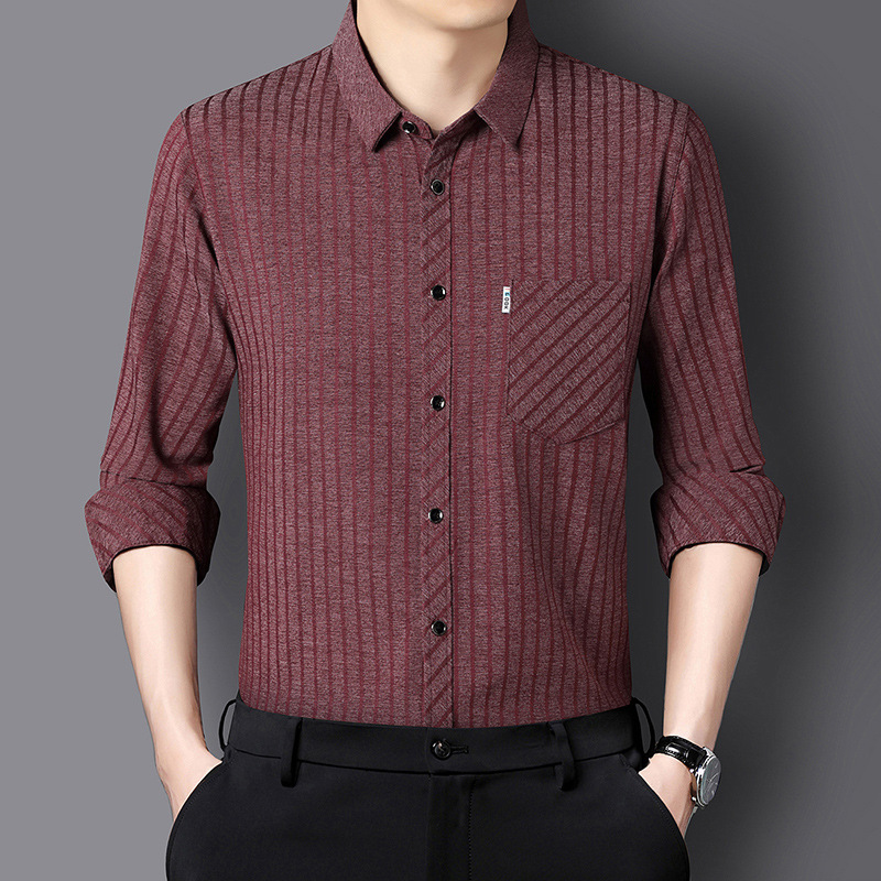뽕나무 실크 중년 남성 긴팔 셔츠 아빠 스타일 가을 비즈니스 캐주얼 다림질 필요 없는 스트라이프 셔츠 남성 상의