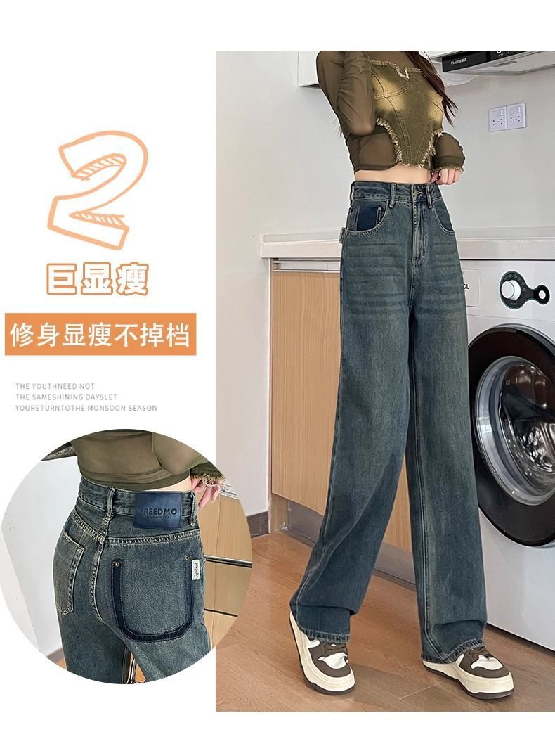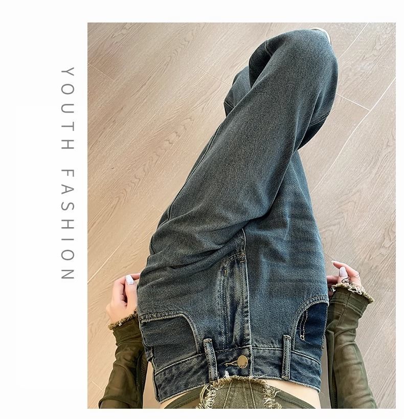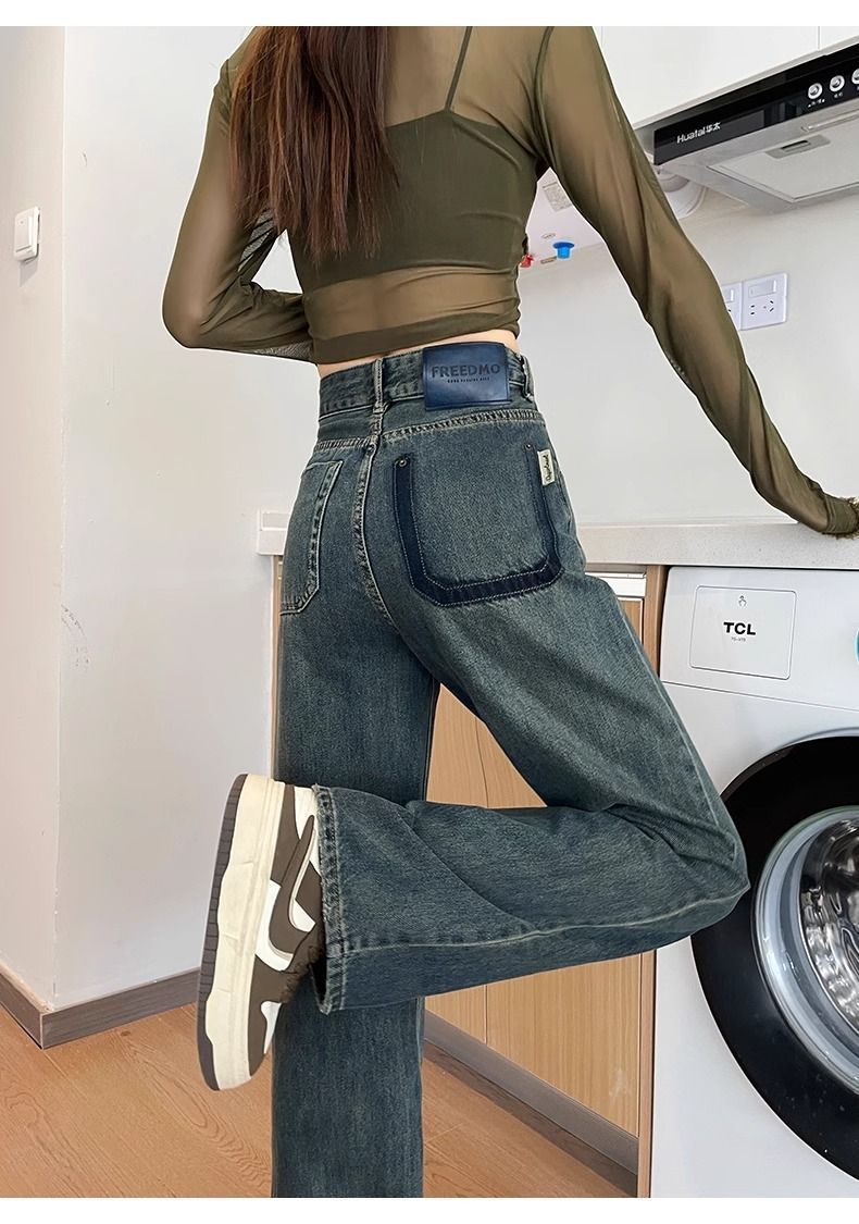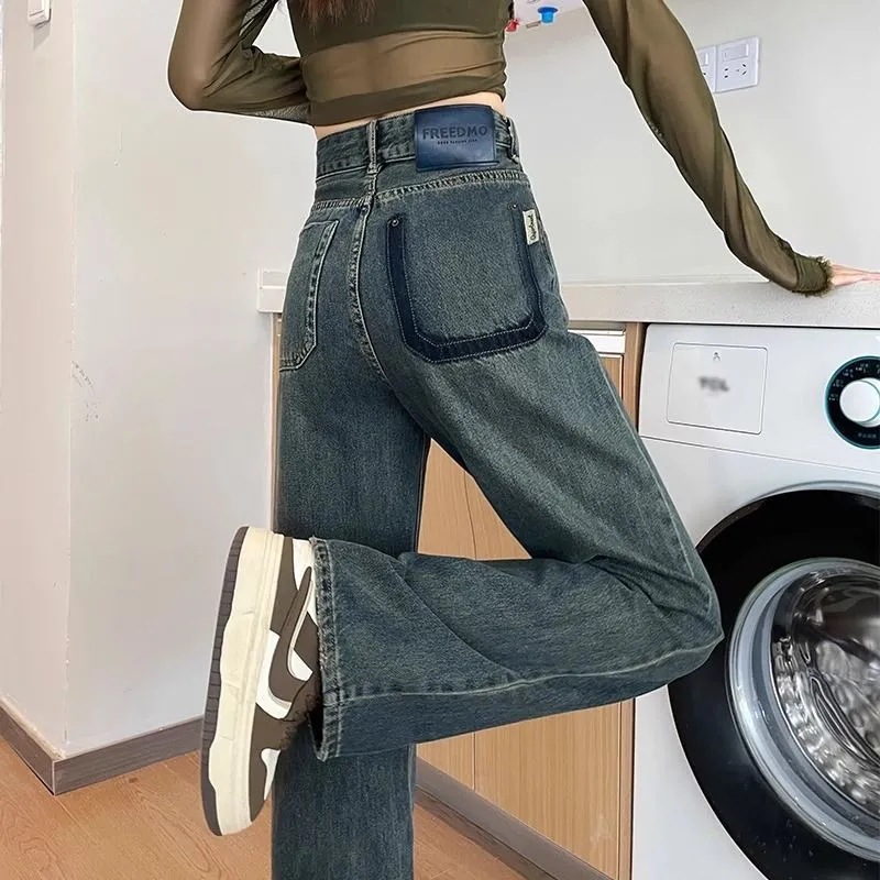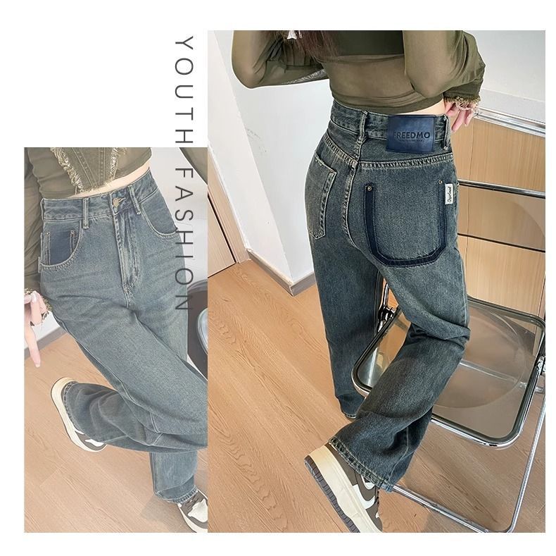 시멘트 회색 얇은 스트레이트 청바지 2024 봄/여름 정사이즈 인기있는 복고풍 대비 색상 작은 넓은 다리 바지