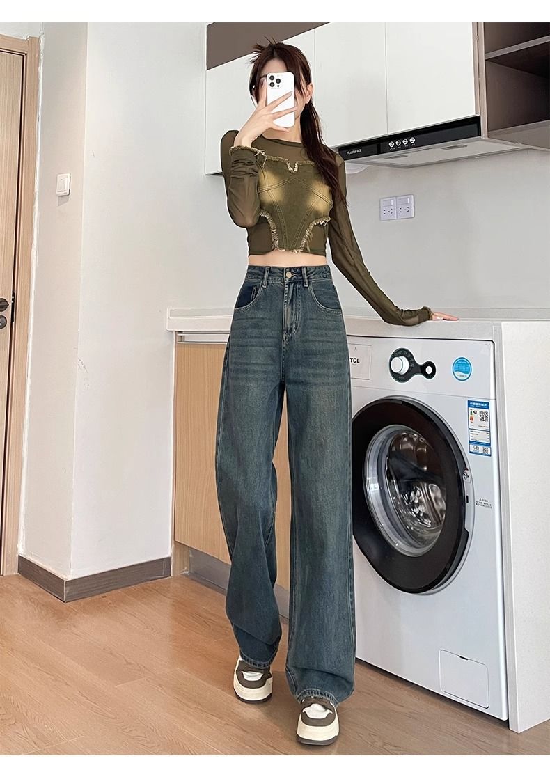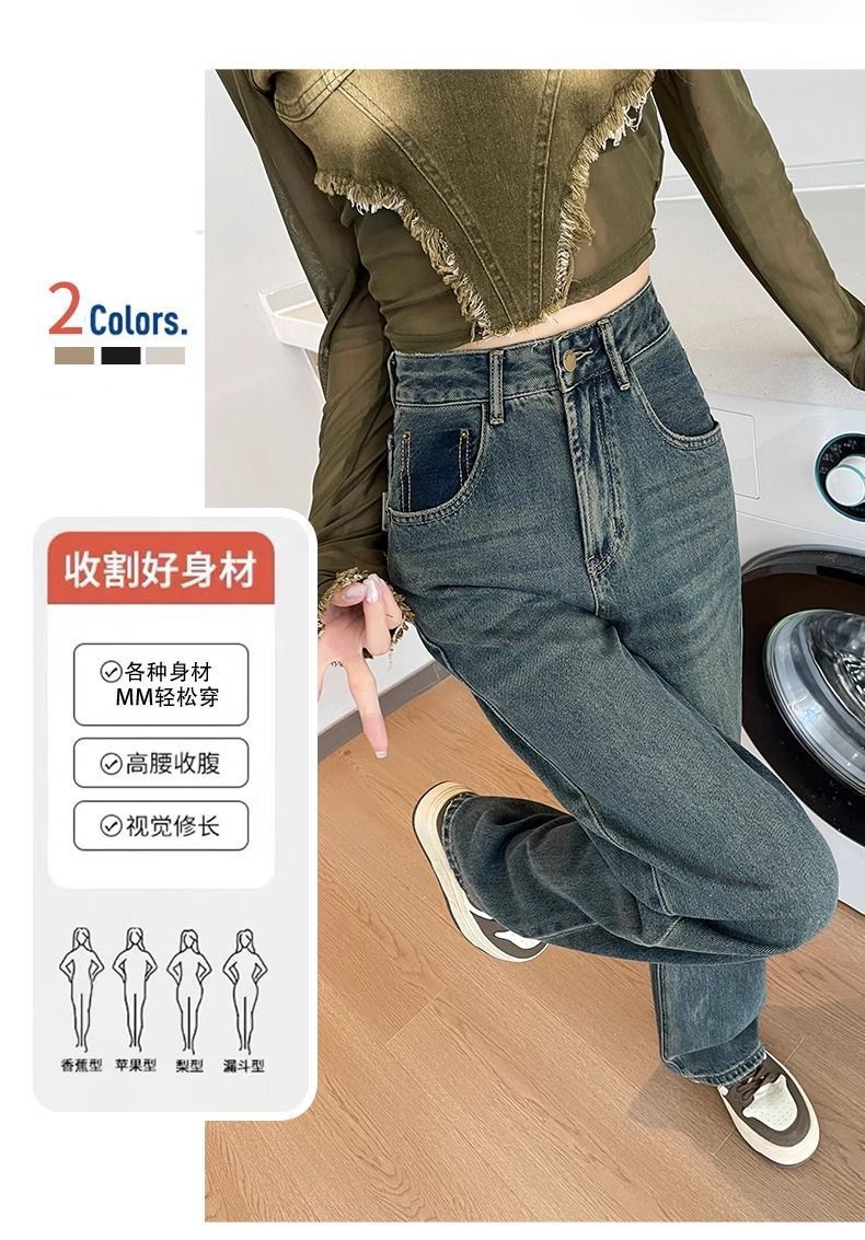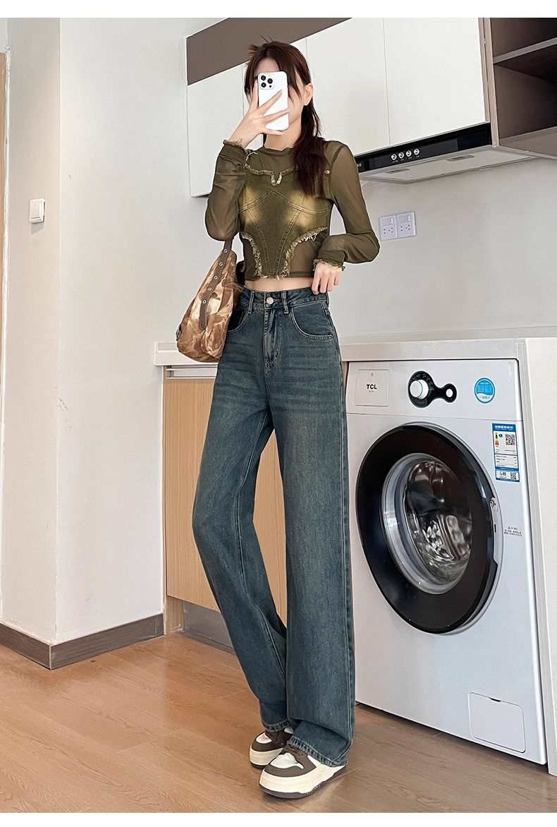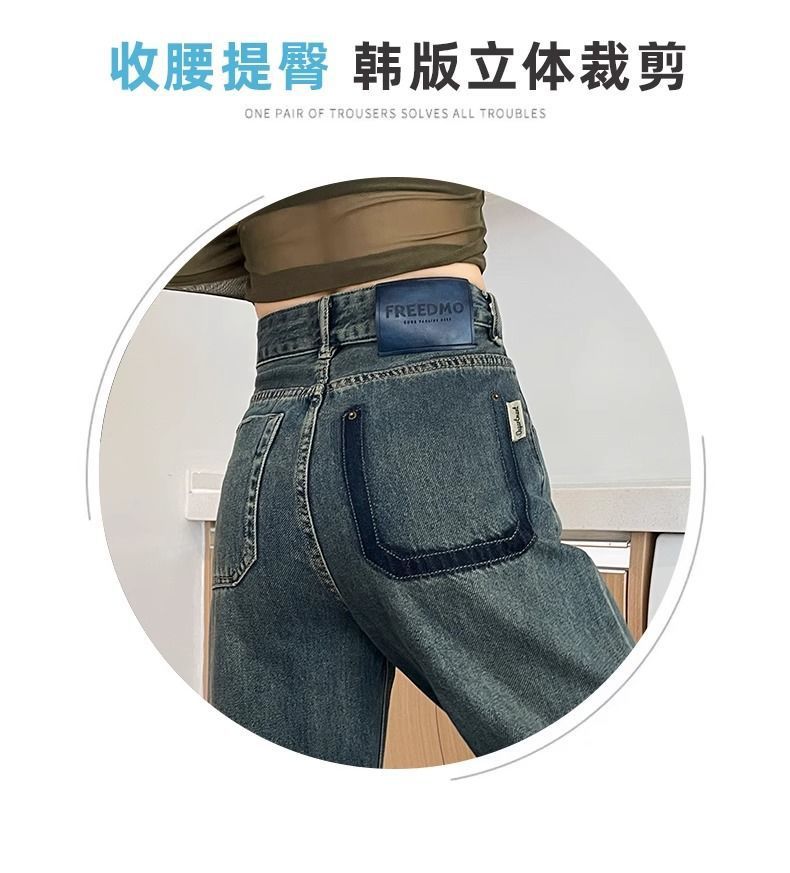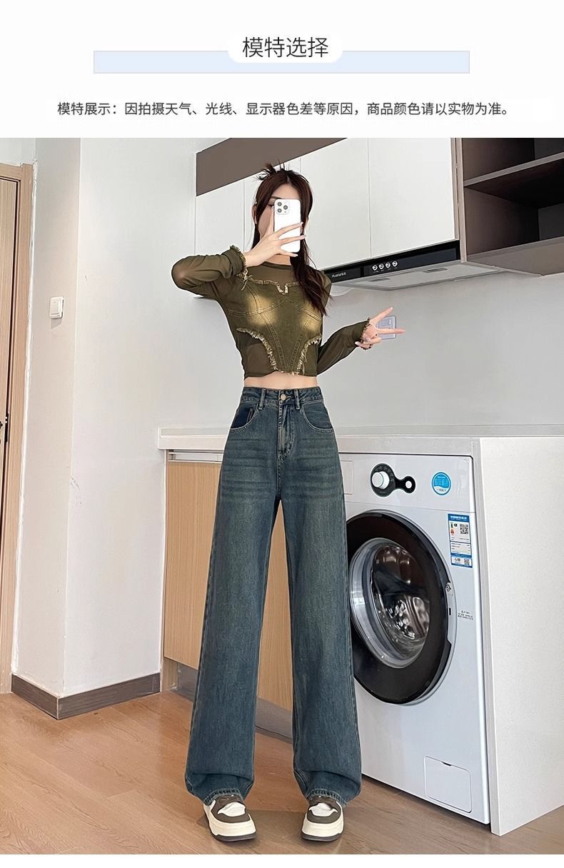 시멘트 회색 얇은 스트레이트 청바지 2024 봄/여름 정사이즈 인기있는 복고풍 대비 색상 작은 넓은 다리 바지