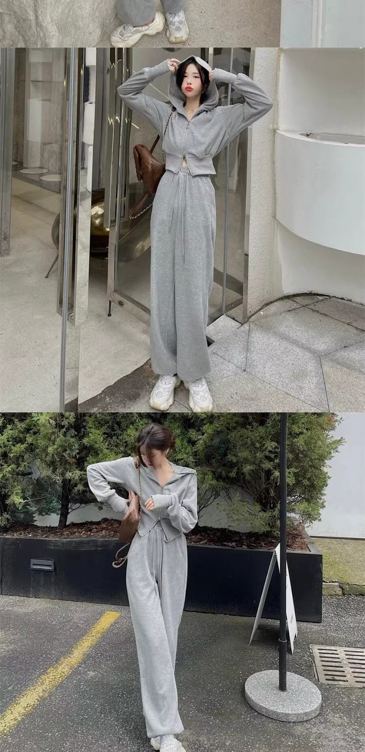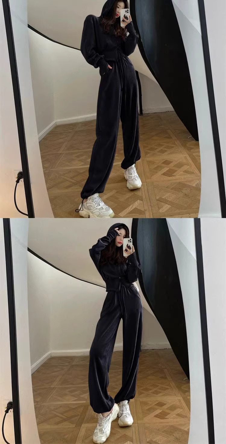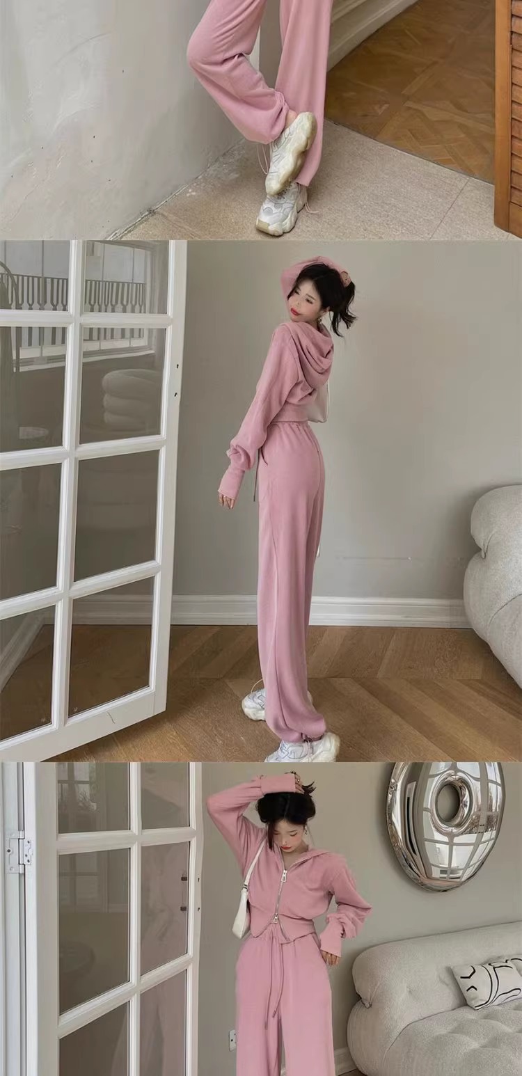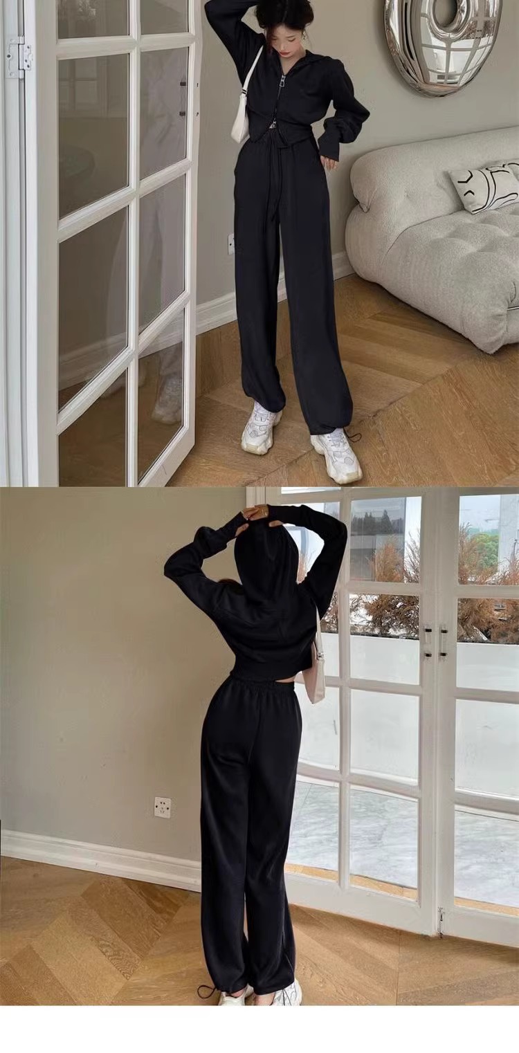 캐주얼 스포츠 세트 여자 2024 이른 봄 새로운 한국식 후드 재킷 높은 허리 드로 스트링 발목 묶인 바지 투피스 세트스토어 가기