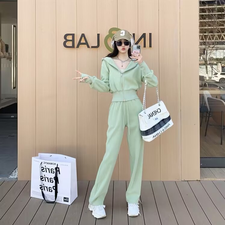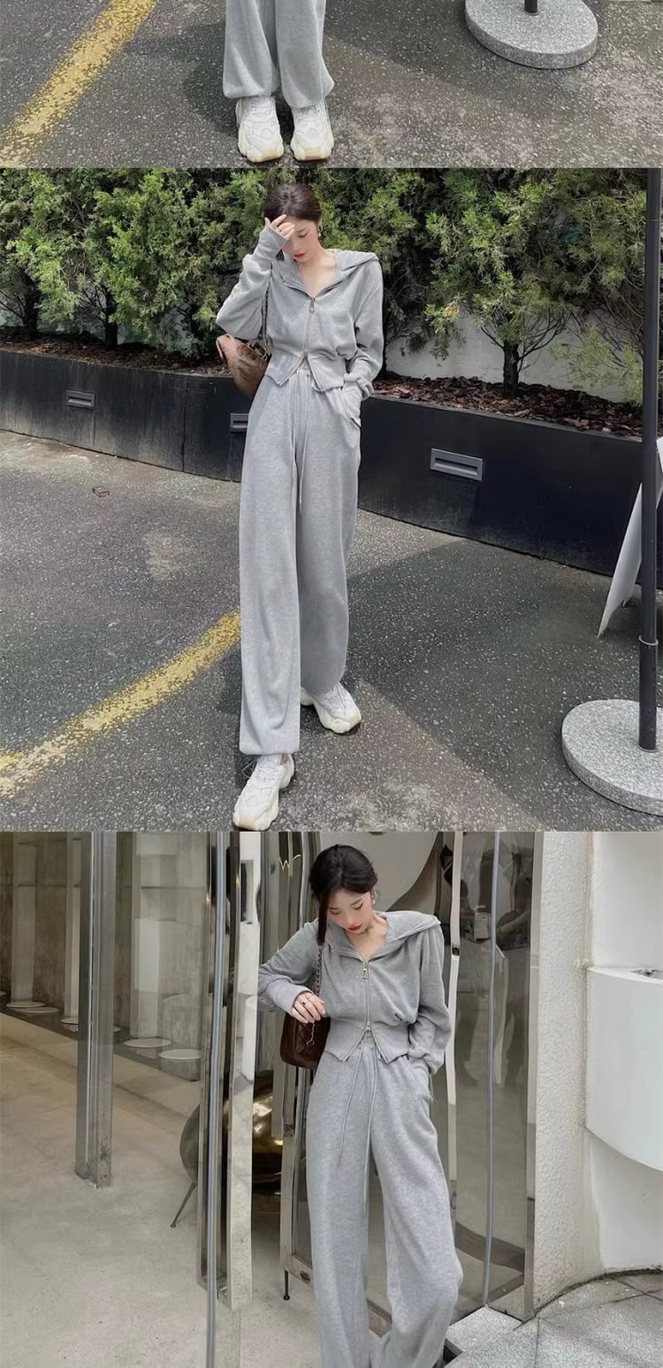 캐주얼 스포츠 세트 여자 2024 이른 봄 새로운 한국식 후드 재킷 높은 허리 드로 스트링 발목 묶인 바지 투피스 세트