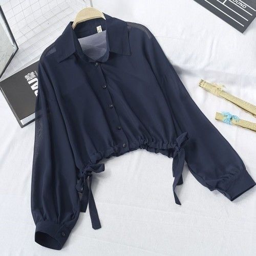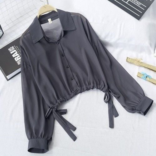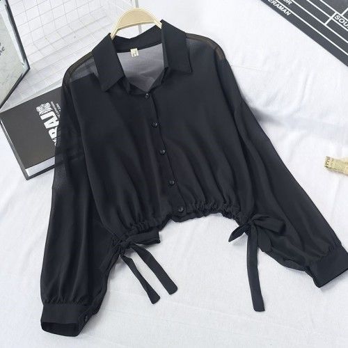 한국식 랜턴 소매 얇은 레이스 업 셔츠 2024 여름 새로운 디자인 짧은 최고 태양 보호 작은 셔츠 코트