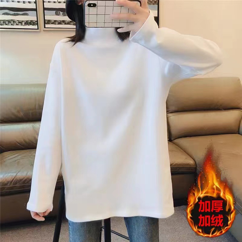 드 벨벳 기모 두껍게 된 중간 길이의 느슨한 내부 티셔츠 바닥 셔츠 여성의 세련된 가을과 겨울 화이트 이너 탑