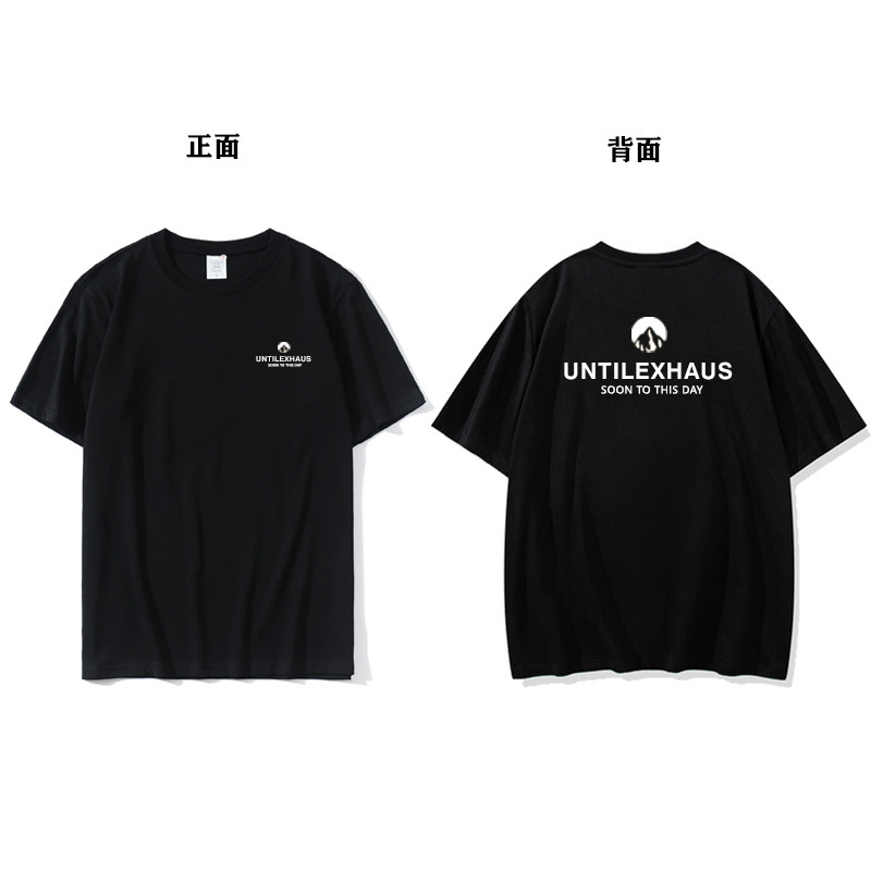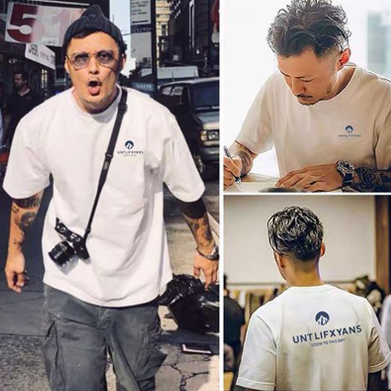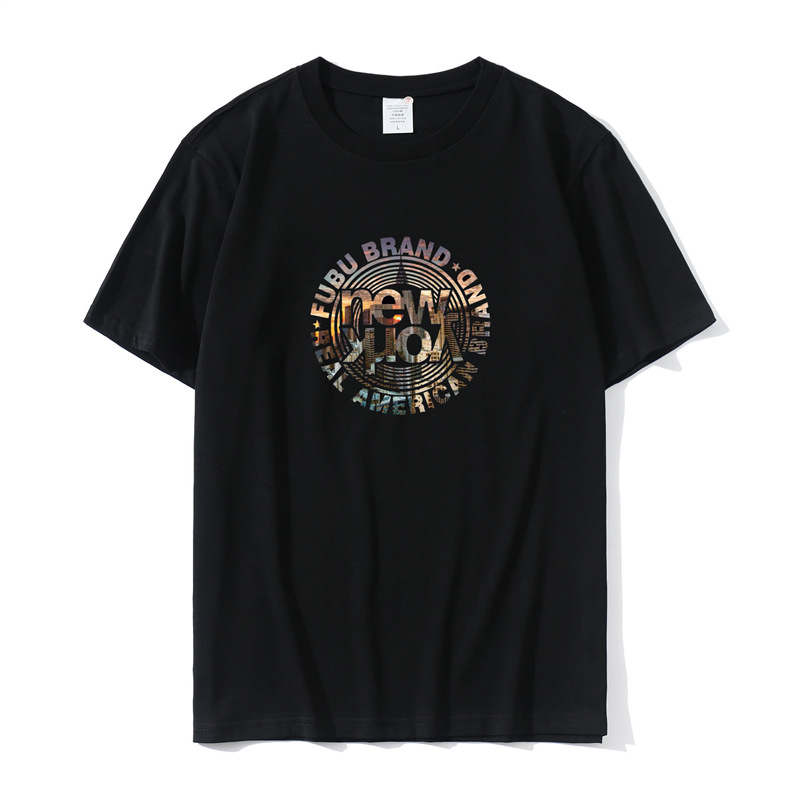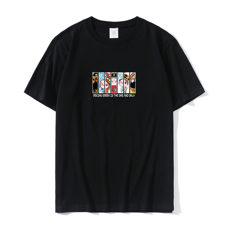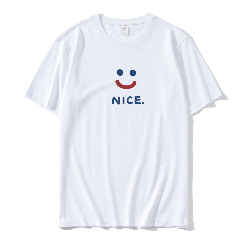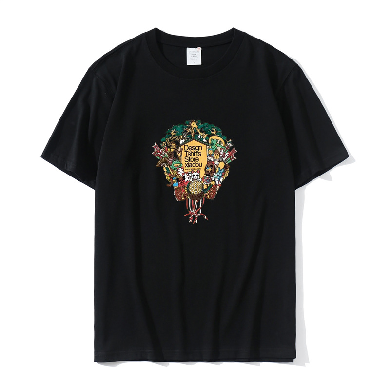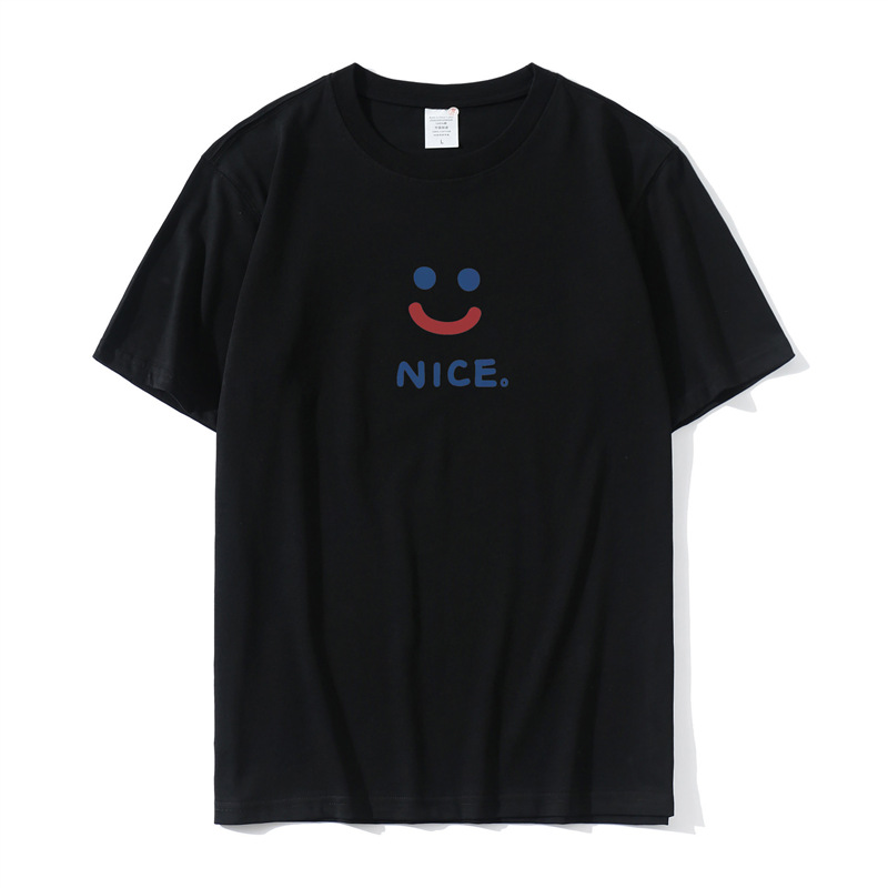 2023 Yu Wenle 반소매 패션 브랜드 남성용 간단한 웃는 얼굴 블랙 티셔츠 남성용 둥근 목 프린트 느슨한 반소매 여름