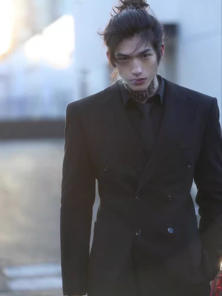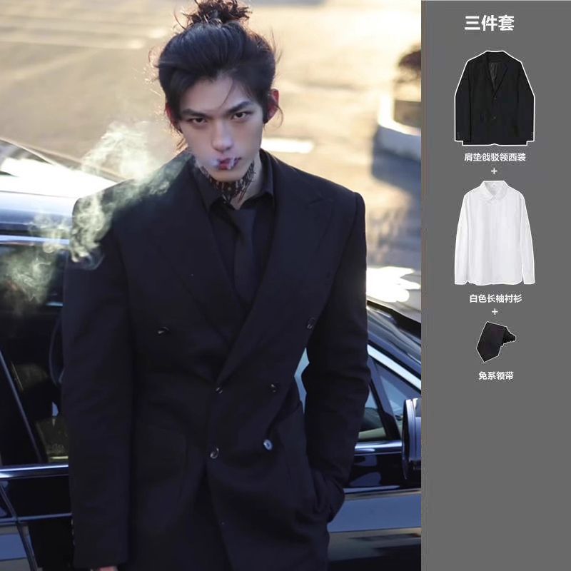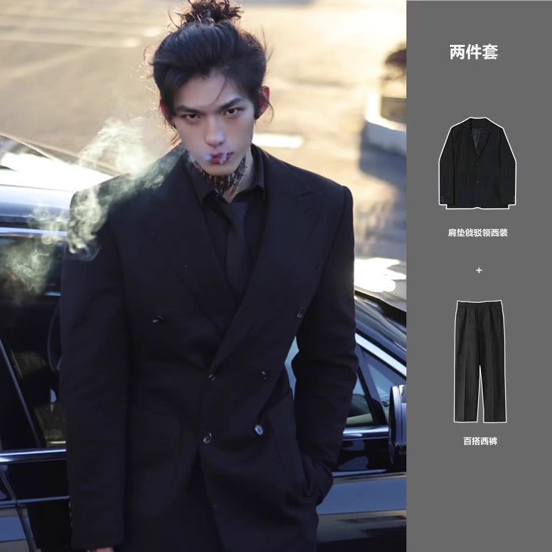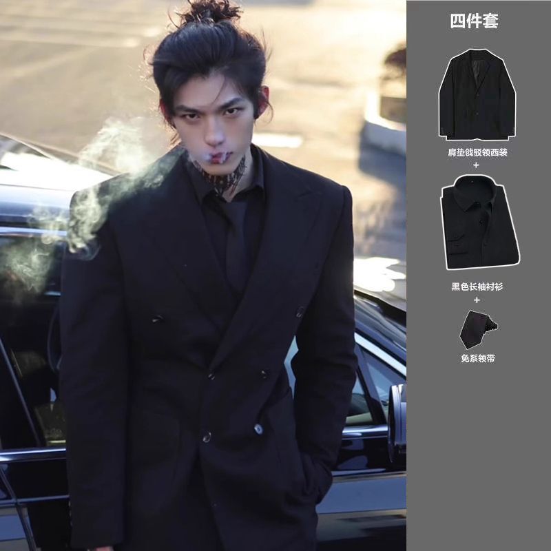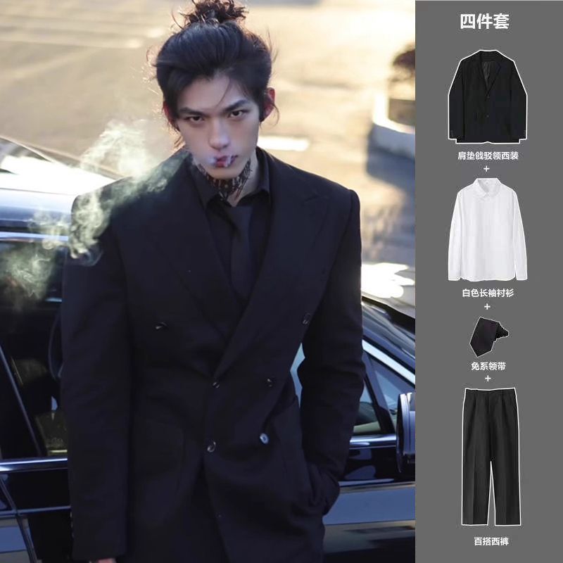 봄과 가을 사업 남자 고급 어깨 패드 잘 생긴 블랙 세트 재킷 남자 더블 브레스트 세트 풀 세트 남성복스토어 가기