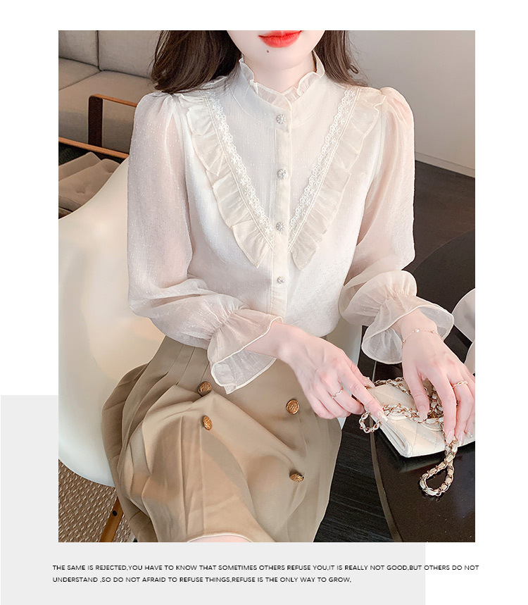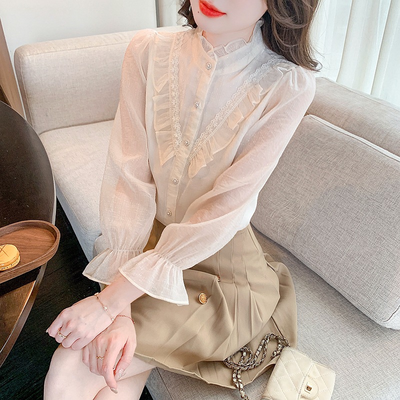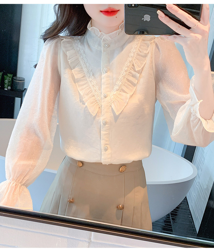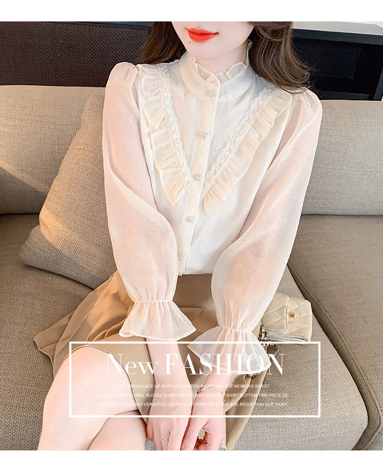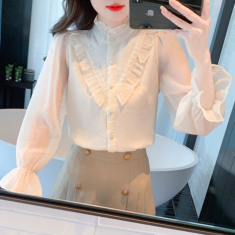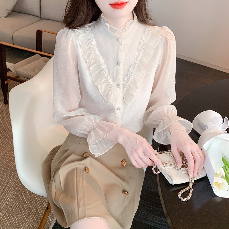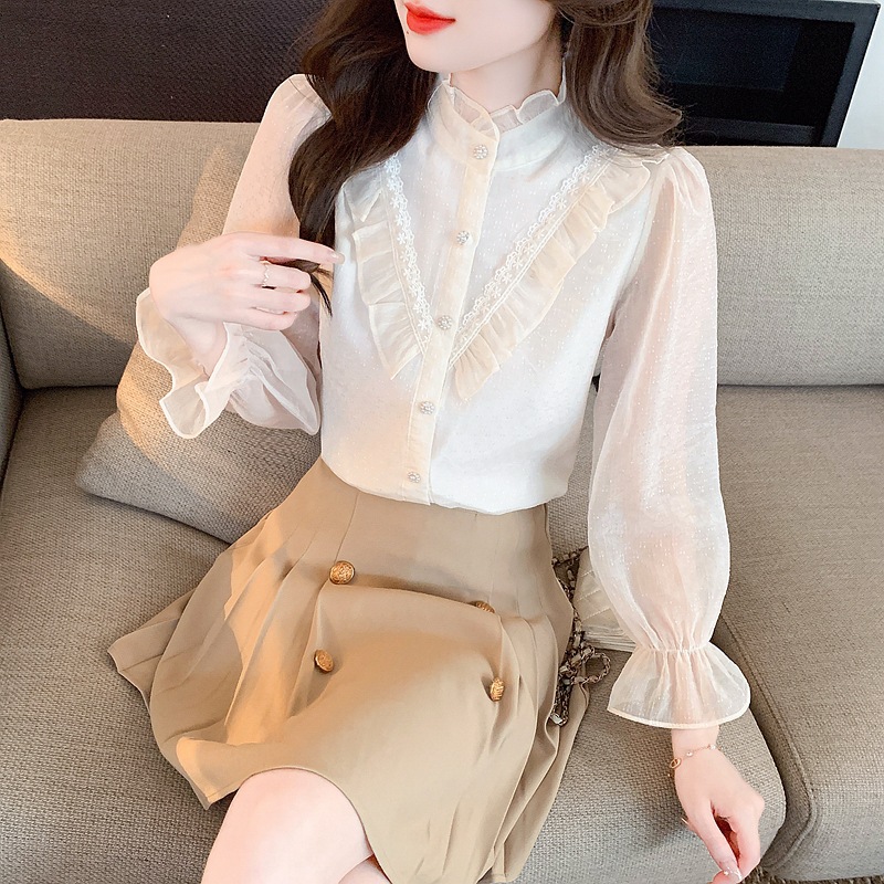 2024 이른 봄 여성을위한 아름다운 중공업 쉬폰 레이스 스탠드 칼라 긴 소매 활 셔츠와 공주 셔츠스토어 가기