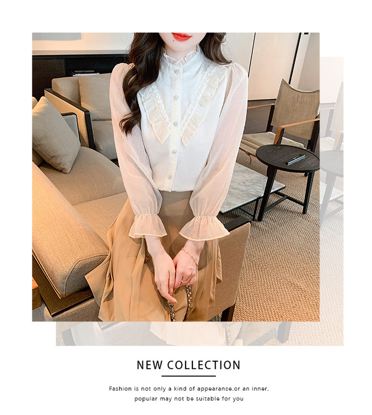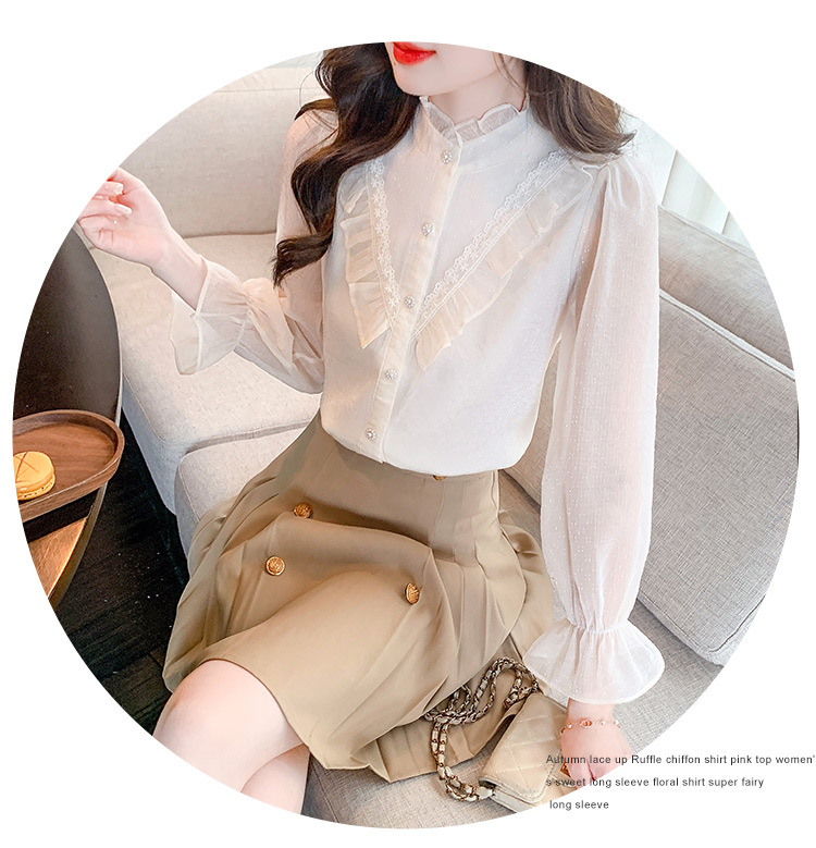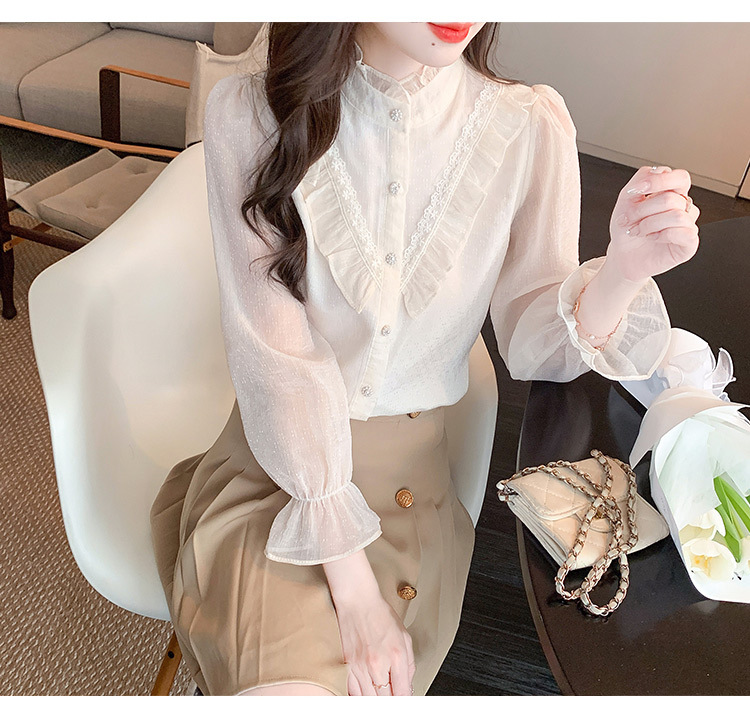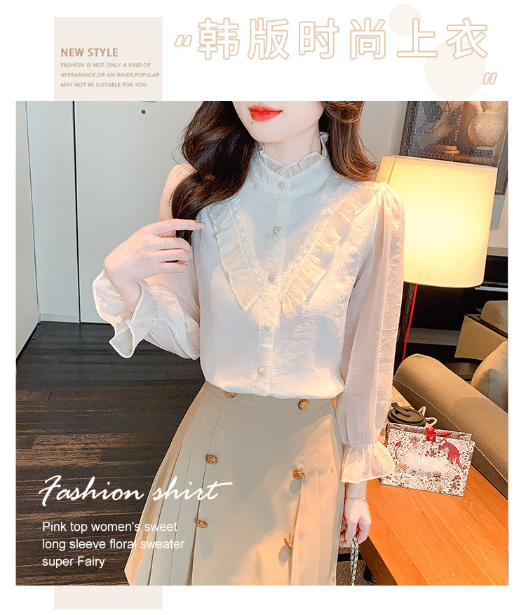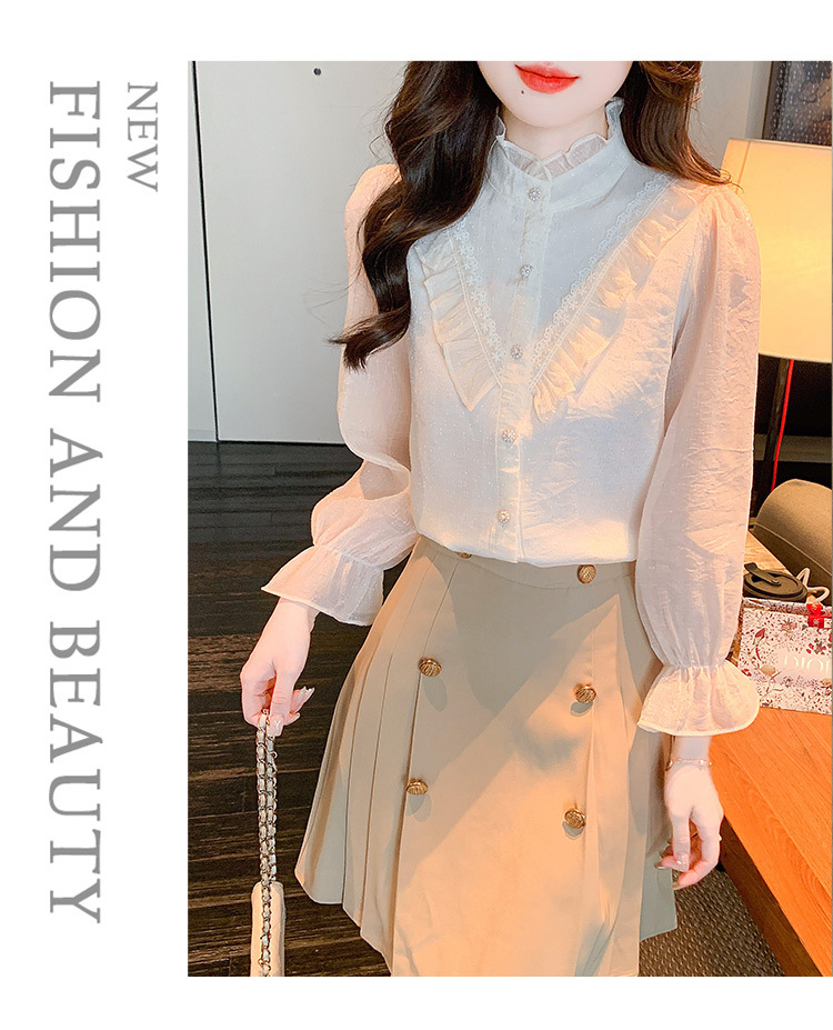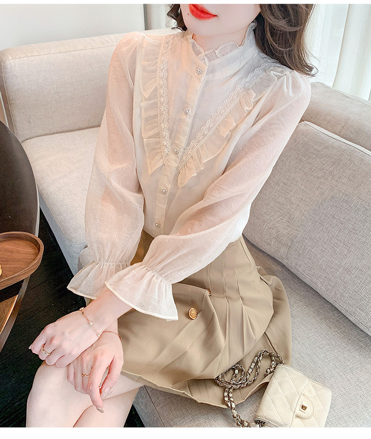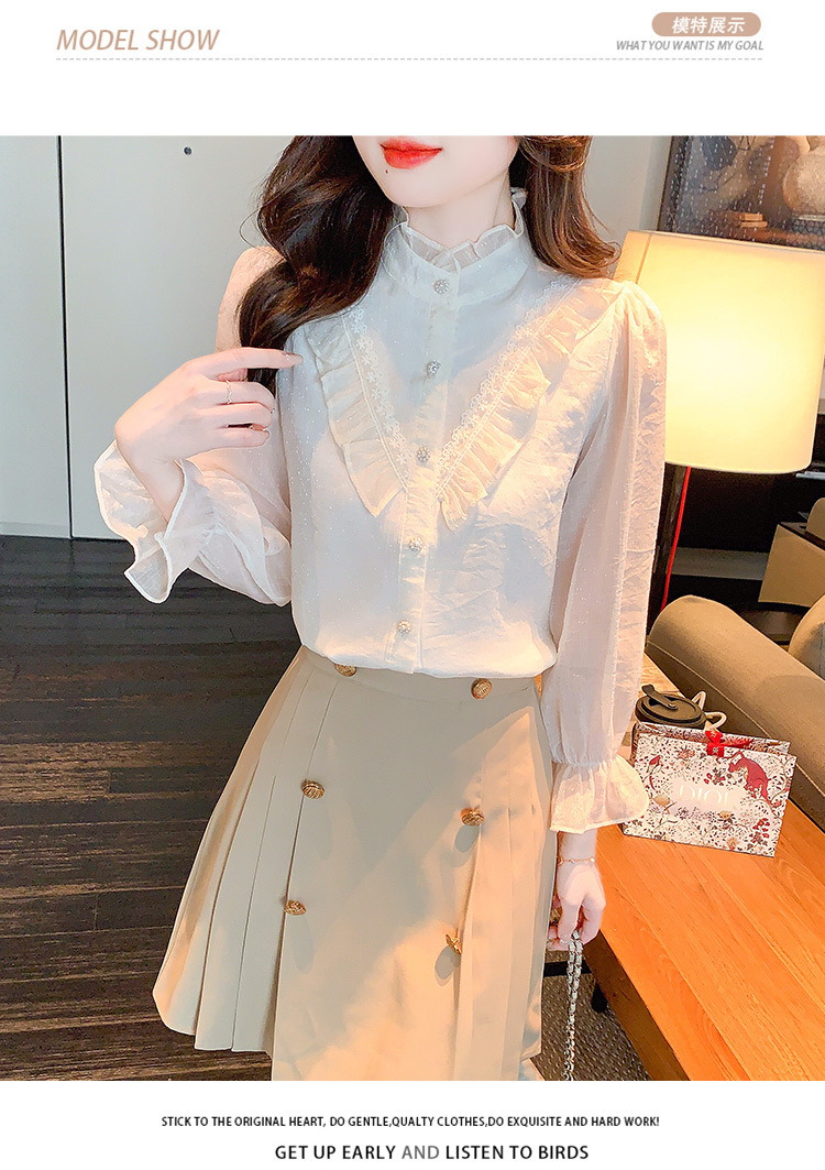 2024 이른 봄 여성을위한 아름다운 중공업 쉬폰 레이스 스탠드 칼라 긴 소매 활 셔츠와 공주 셔츠스토어 가기
