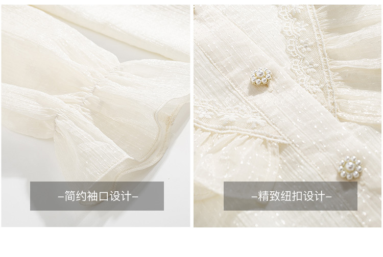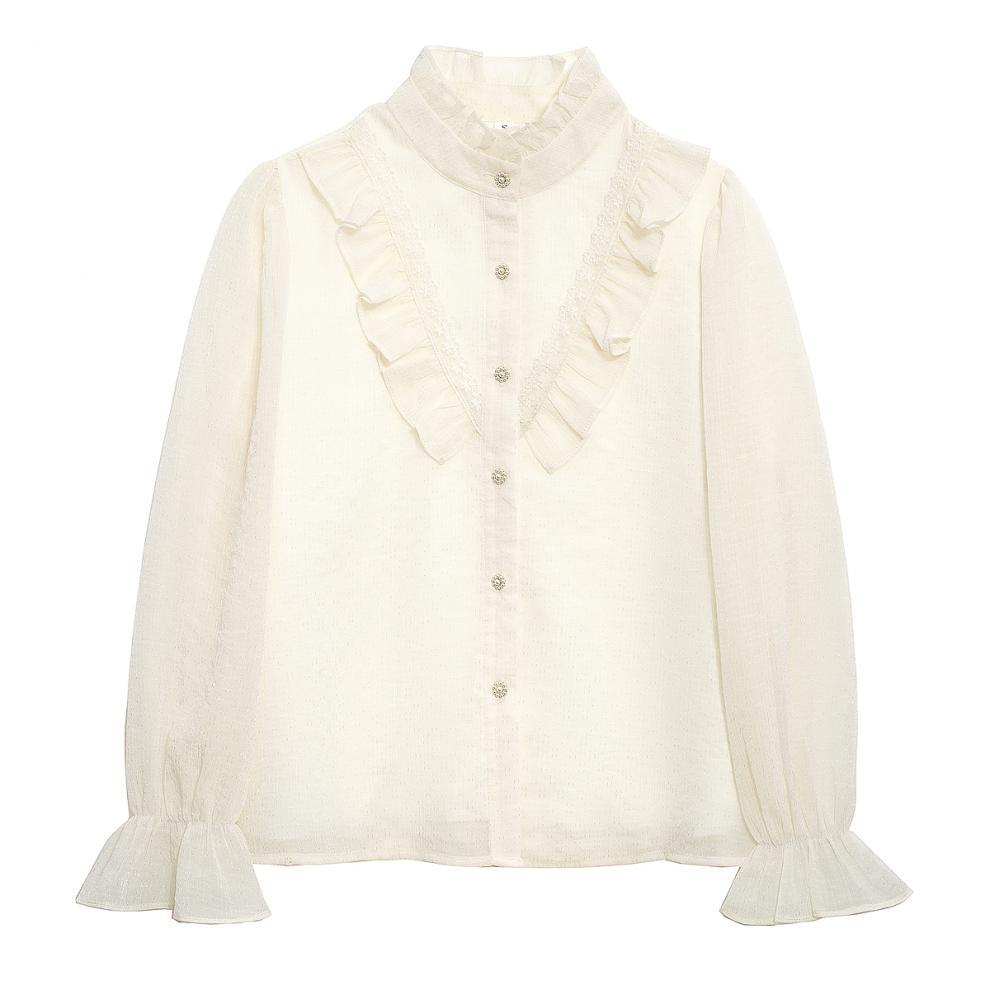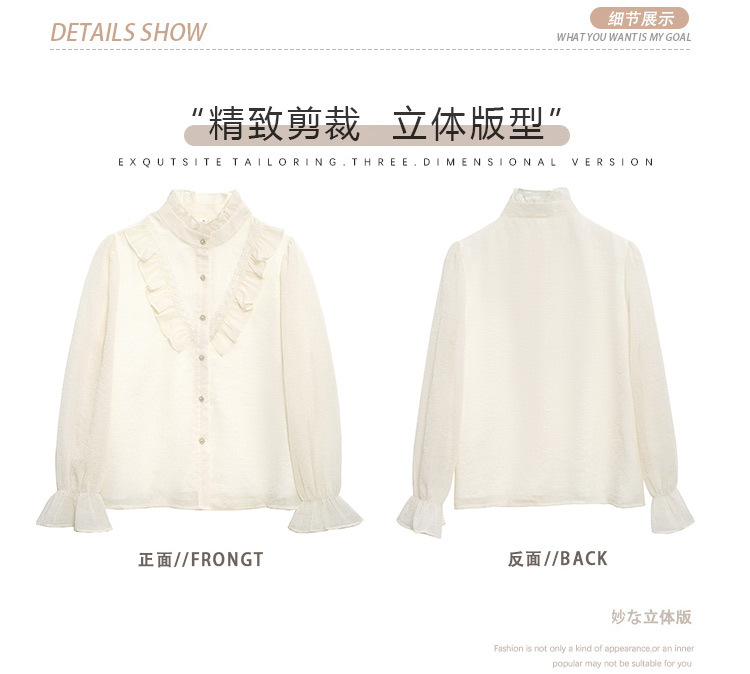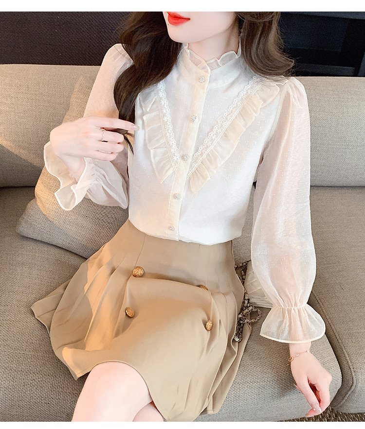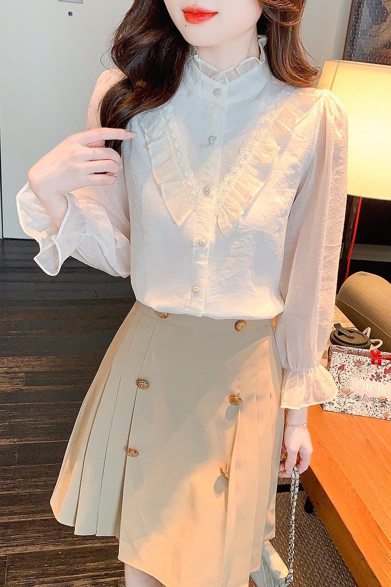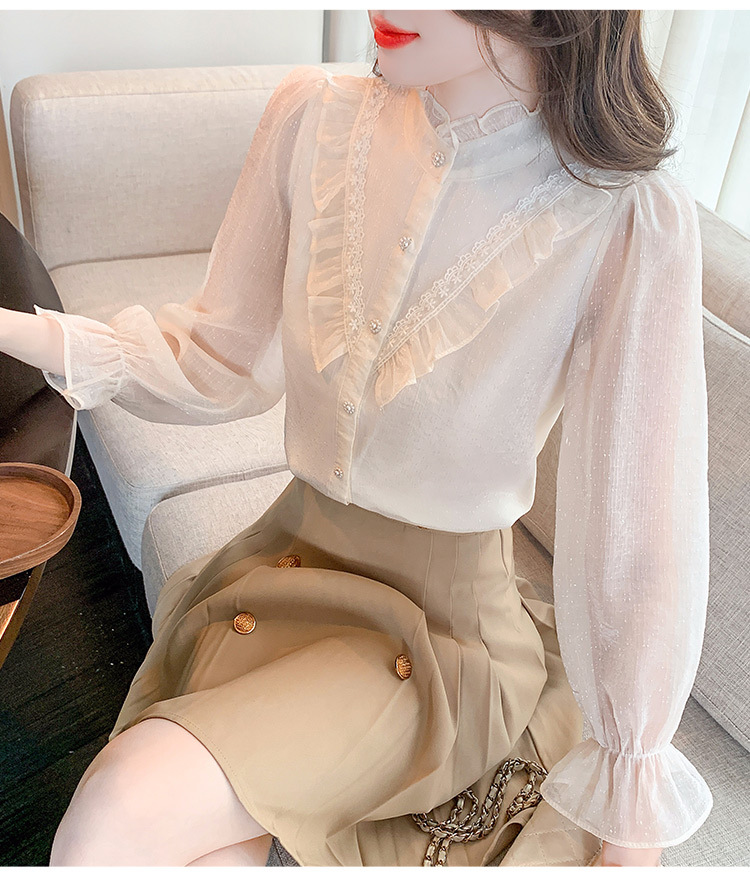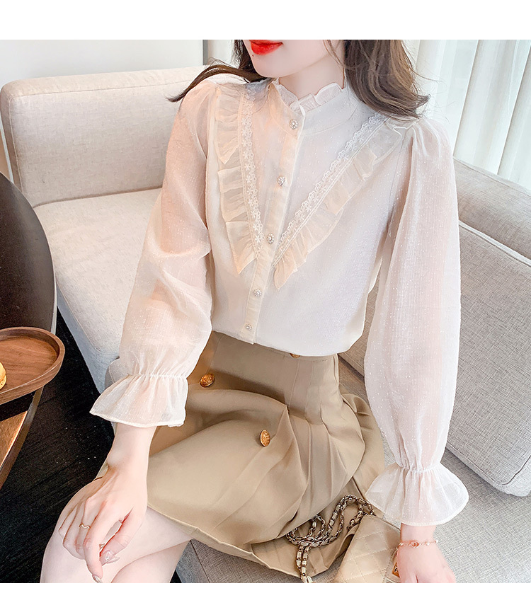2024 이른 봄 여성을위한 아름다운 중공업 쉬폰 레이스 스탠드 칼라 긴 소매 활 셔츠와 공주 셔츠스토어 가기