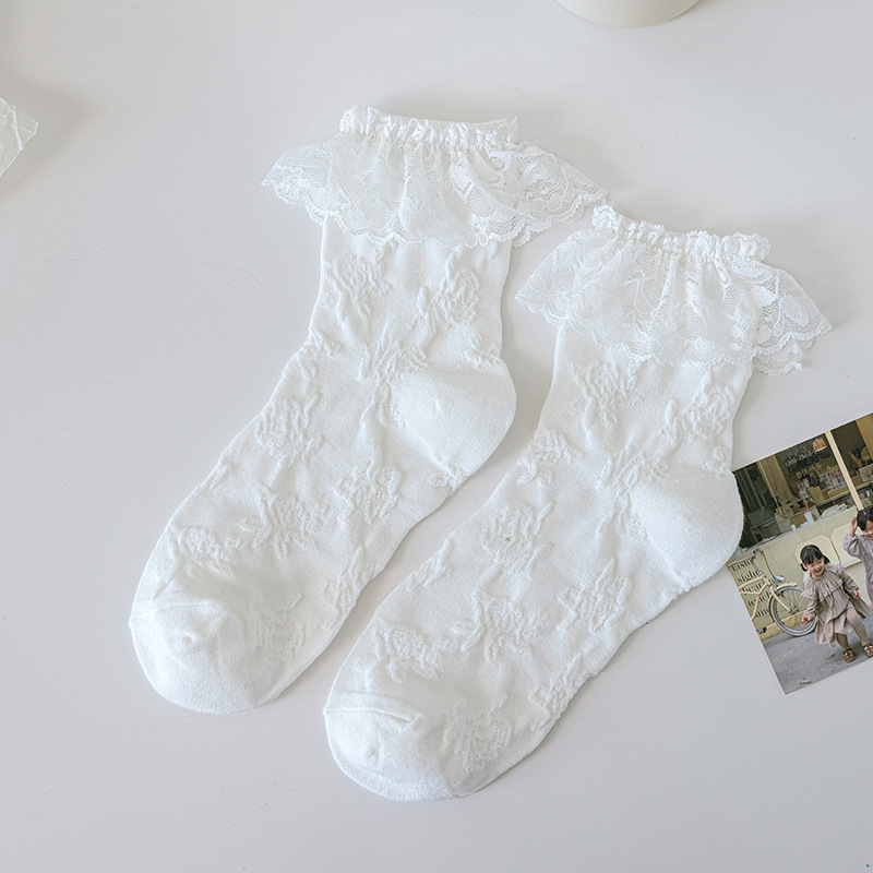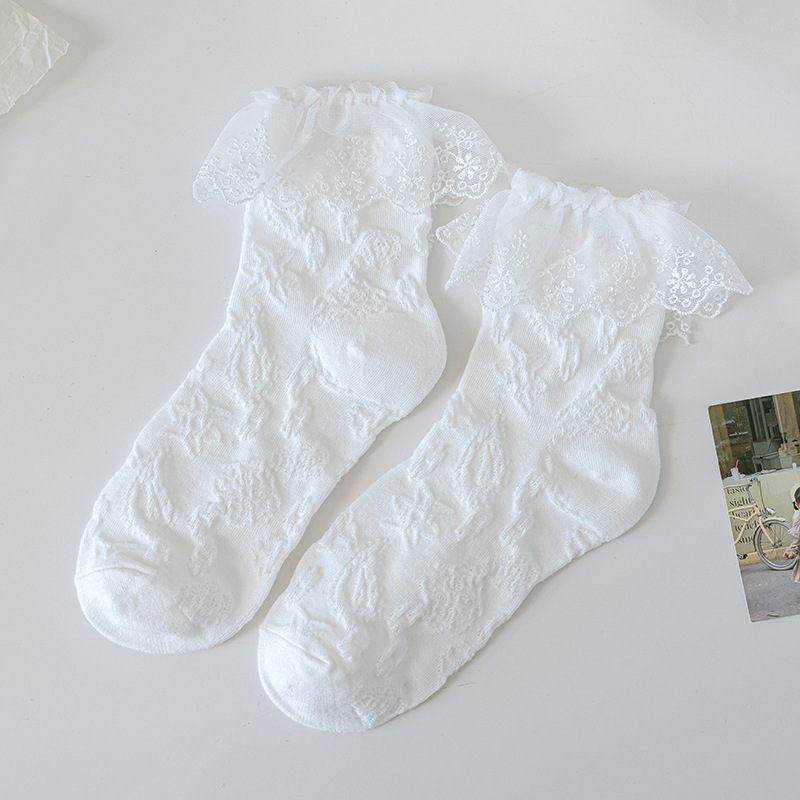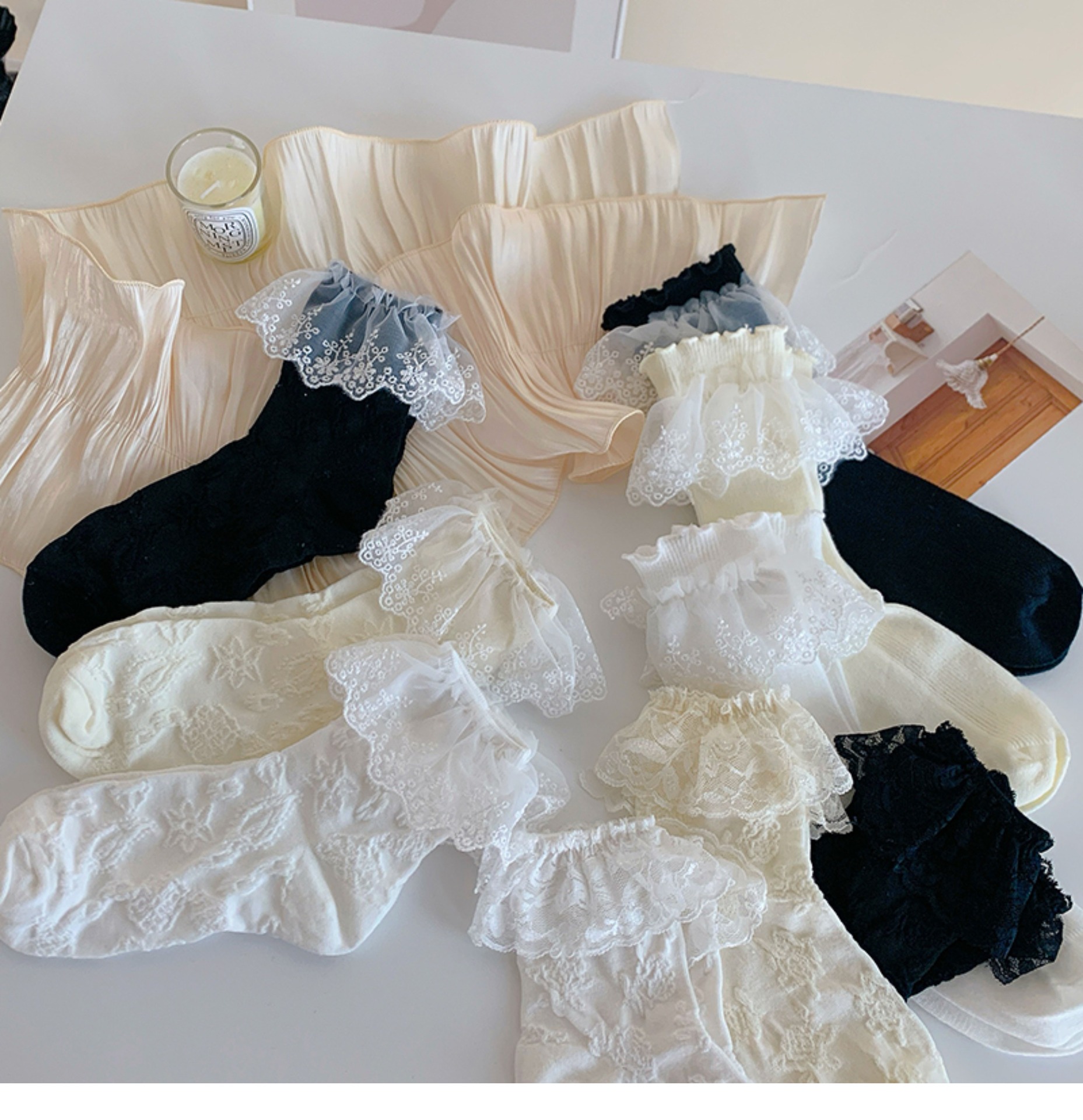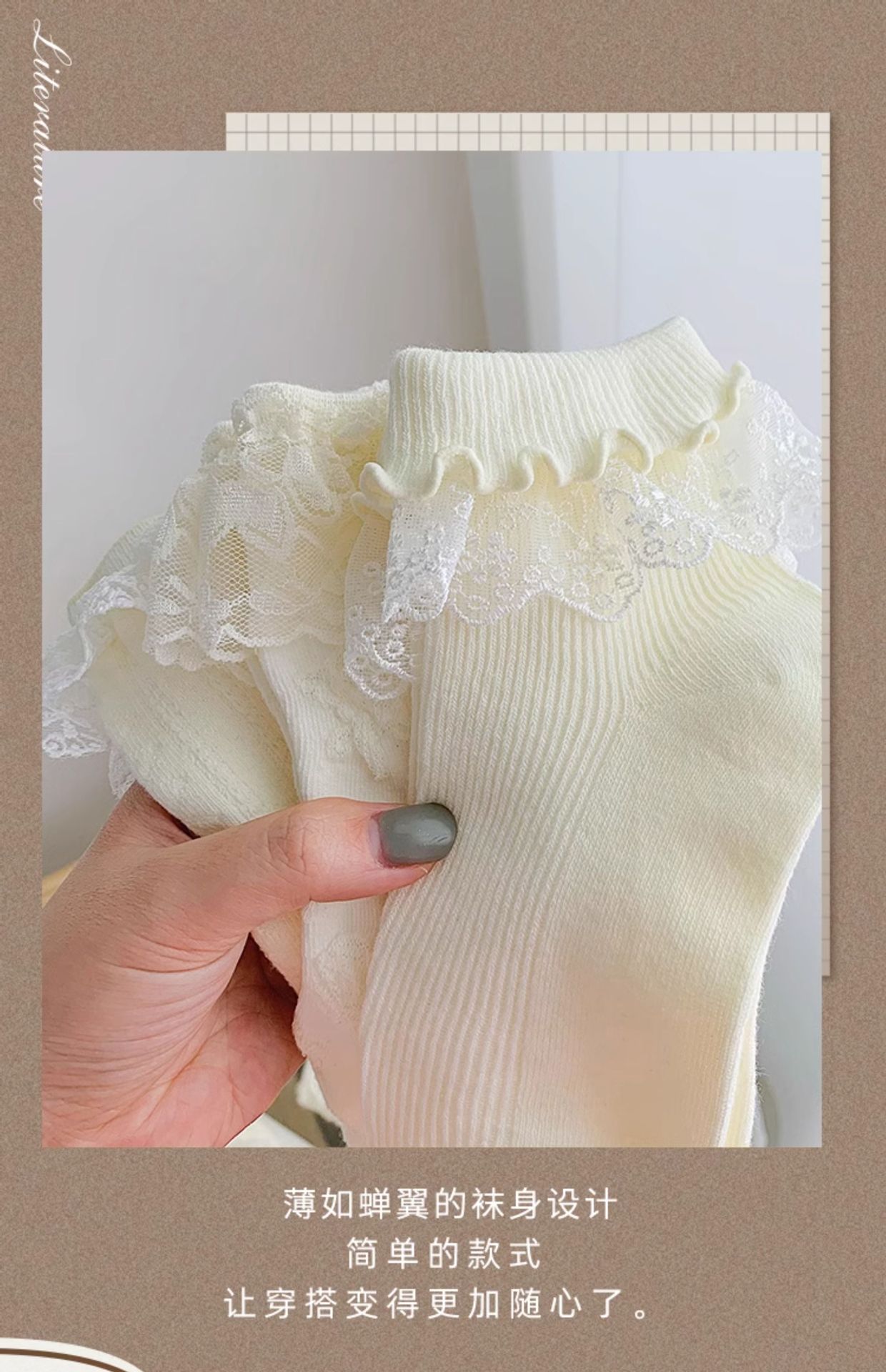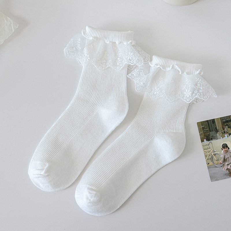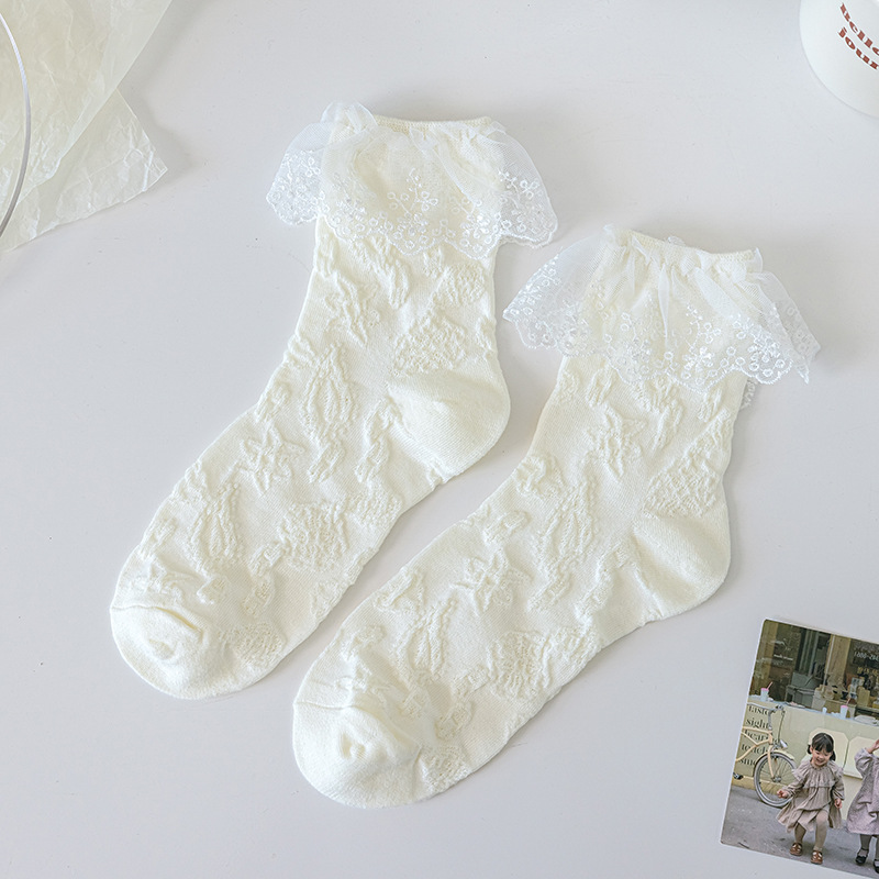 양말 여성의 중간 종아리 길이 양말 레이스 귀여운 레이스 가장자리 Lolita 얇은 흰색 Lolita 활 일본 양말
