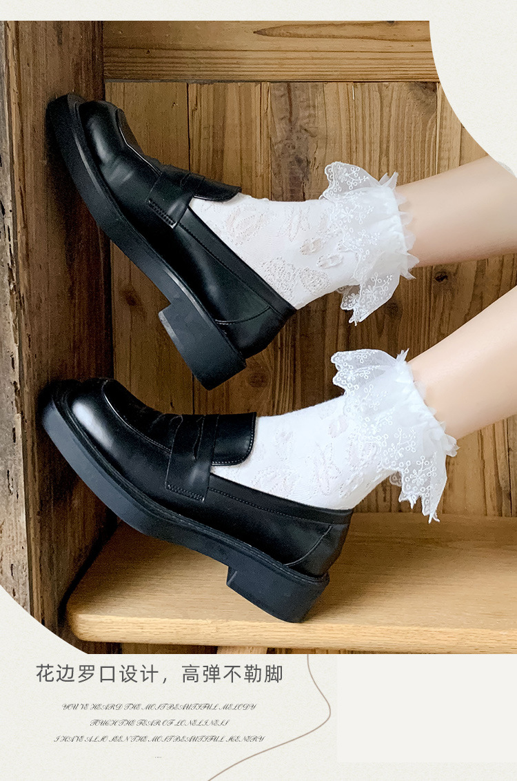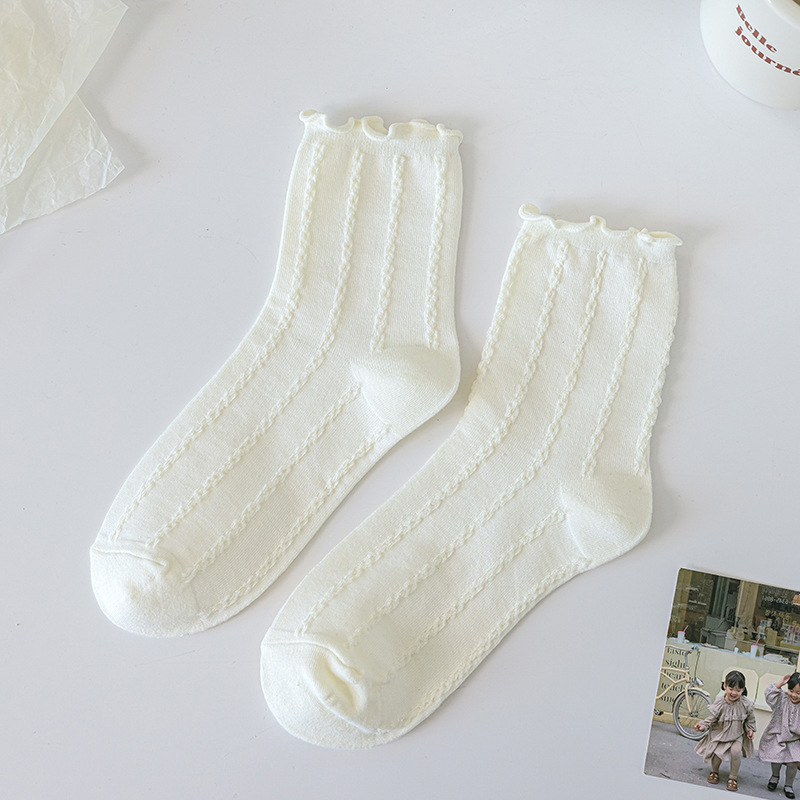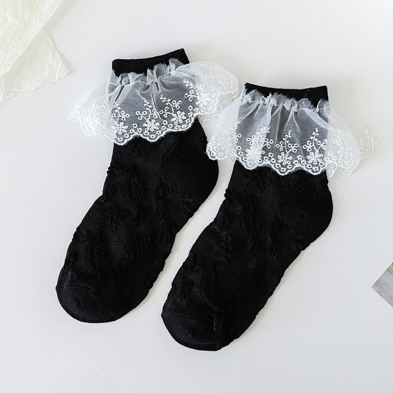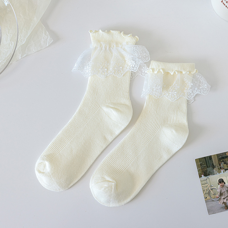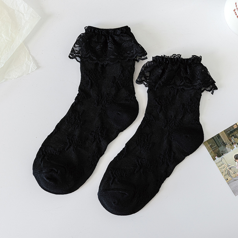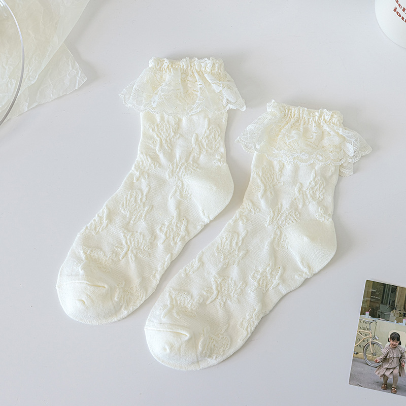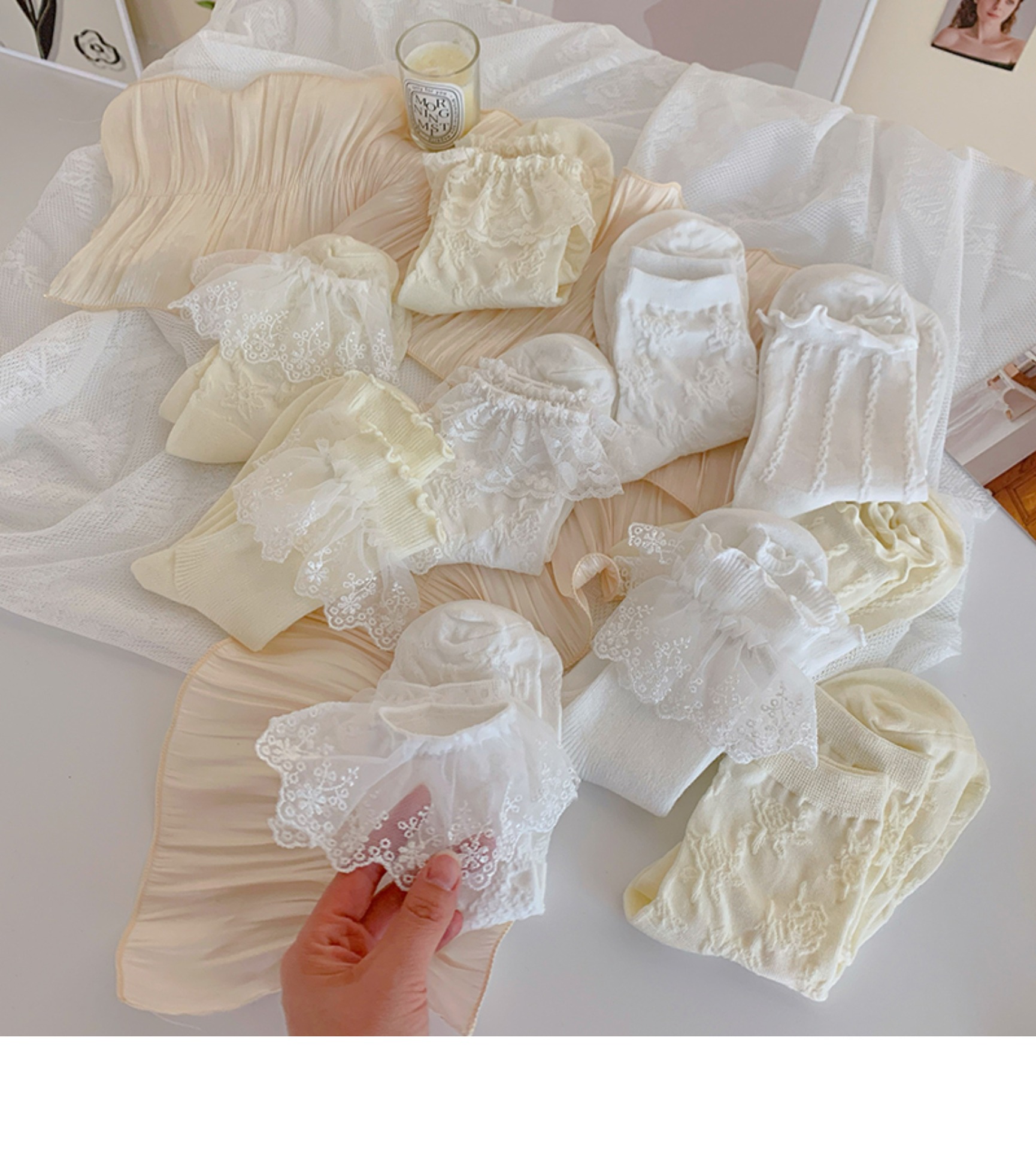 양말 여성의 중간 종아리 길이 양말 레이스 귀여운 레이스 가장자리 Lolita 얇은 흰색 Lolita 활 일본 양말