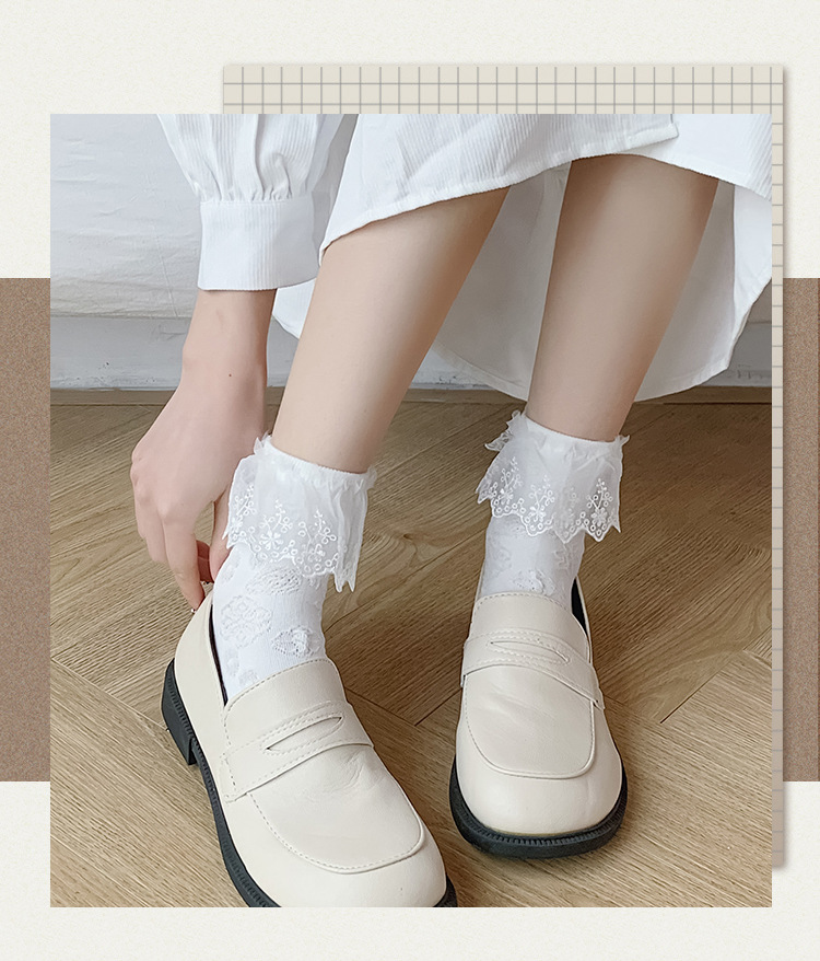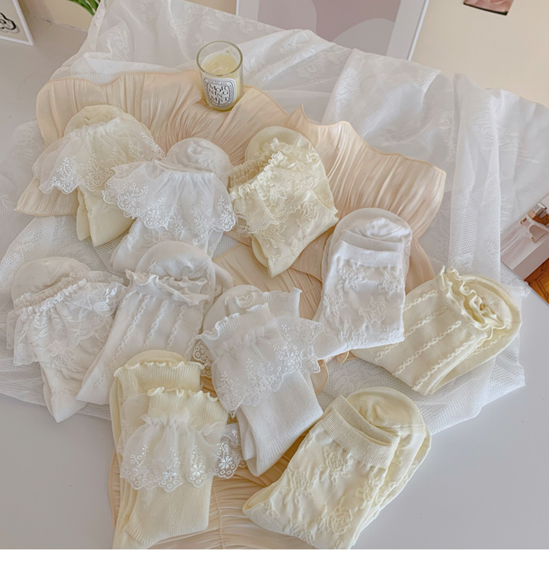 양말 여성의 중간 종아리 길이 양말 레이스 귀여운 레이스 가장자리 Lolita 얇은 흰색 Lolita 활 일본 양말스토어 가기