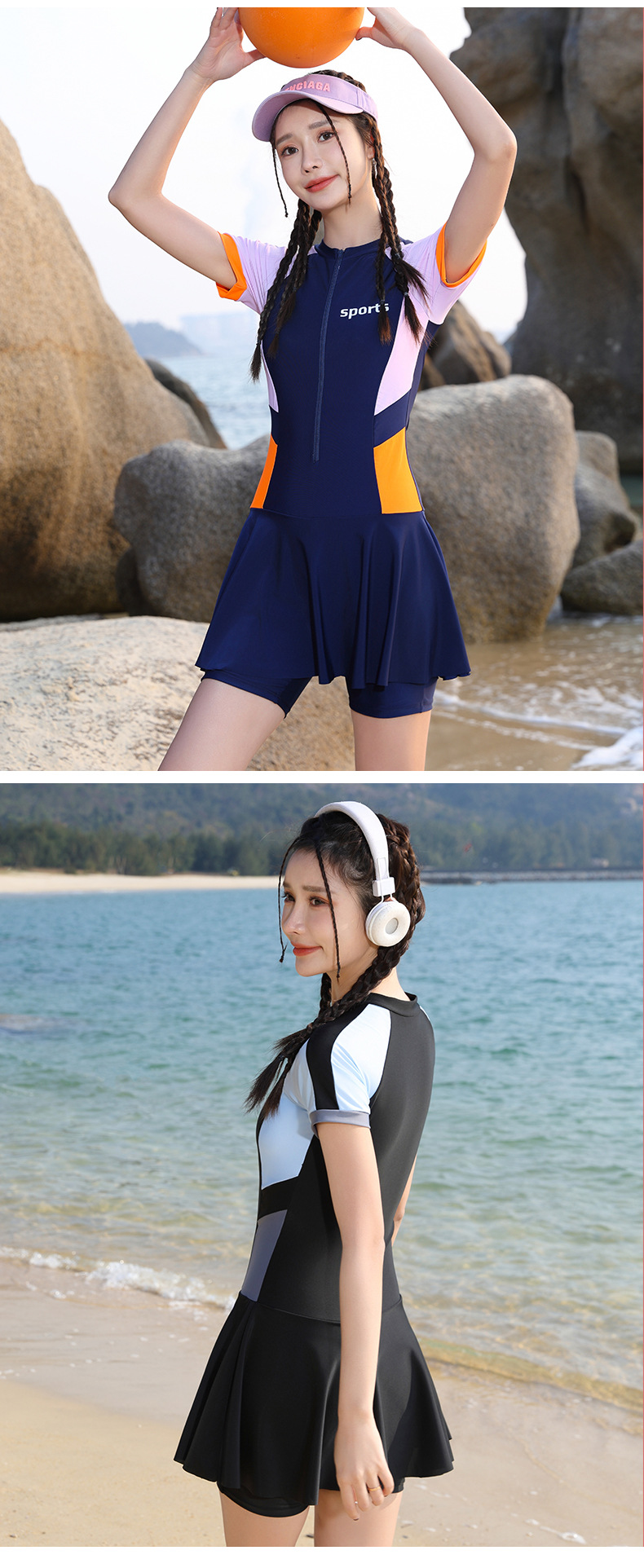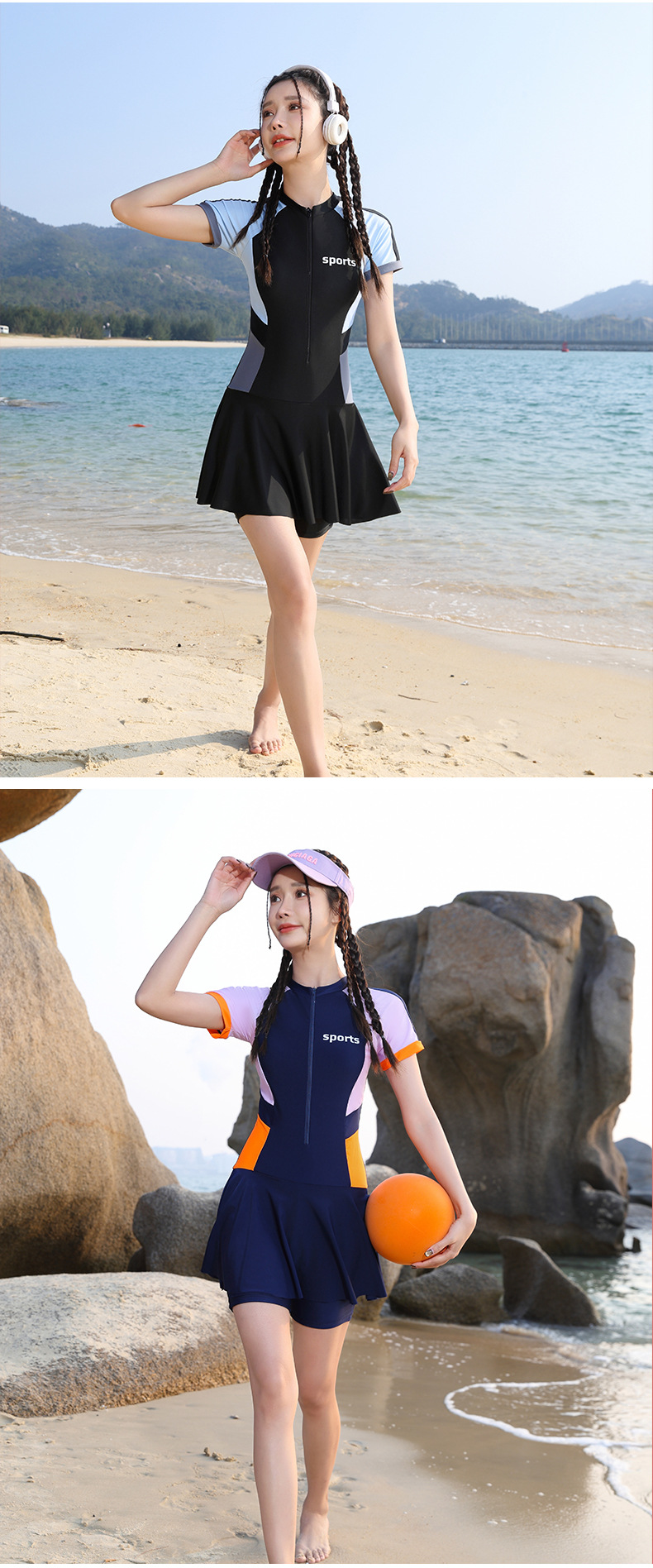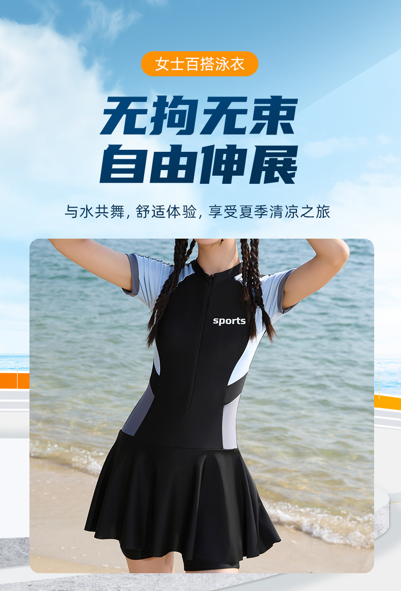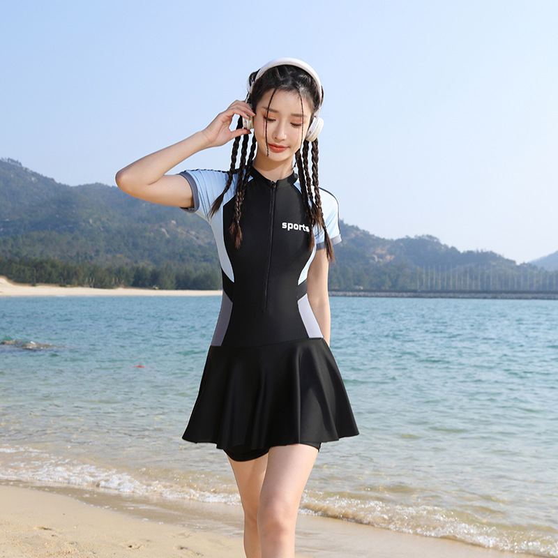 여성용 퀵 드라이 수영복 하이 엔드 컬러 매칭 쇼트 지퍼 스커트 수영복 슬림핏 허리 폭발성 수영복스토어 가기