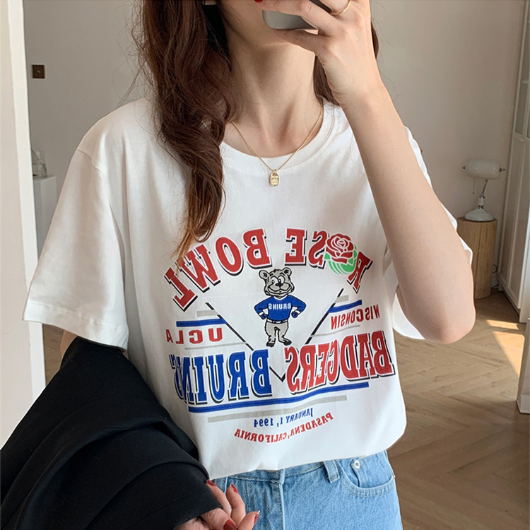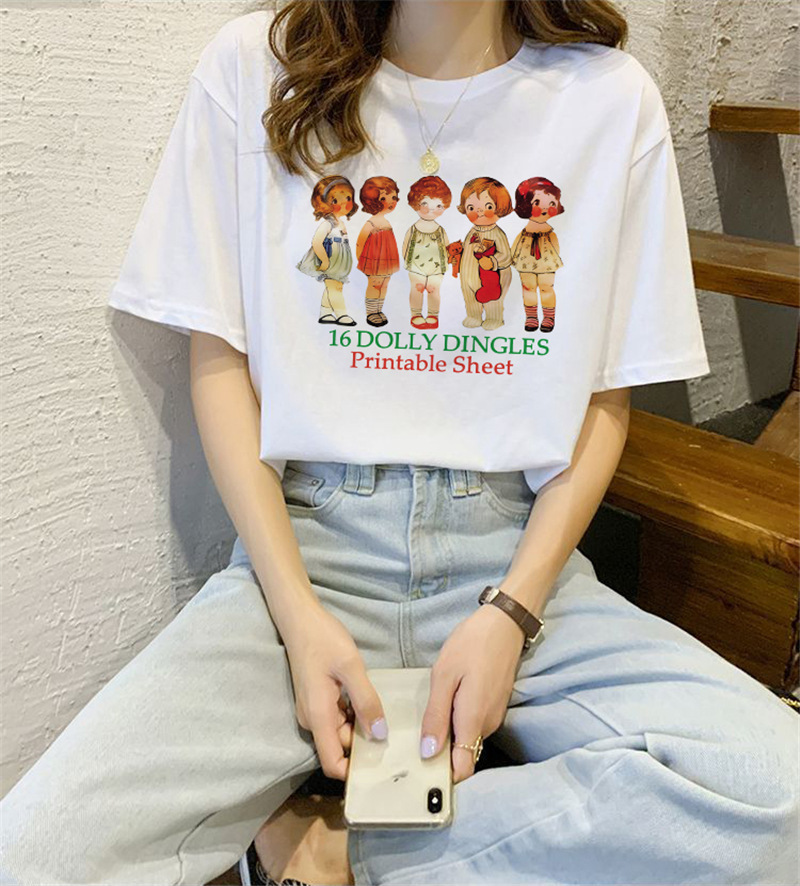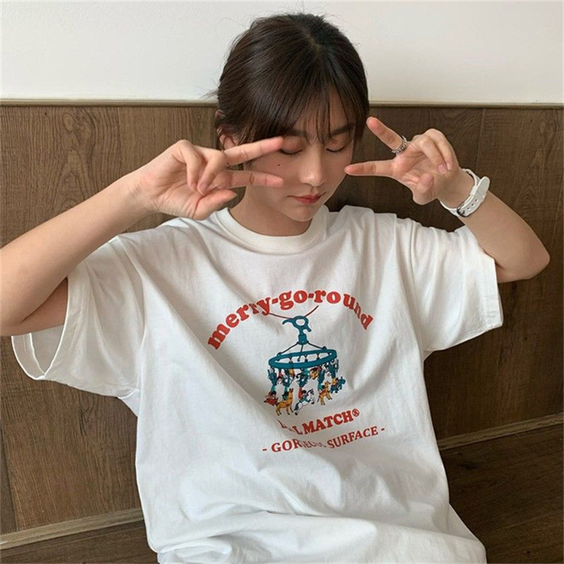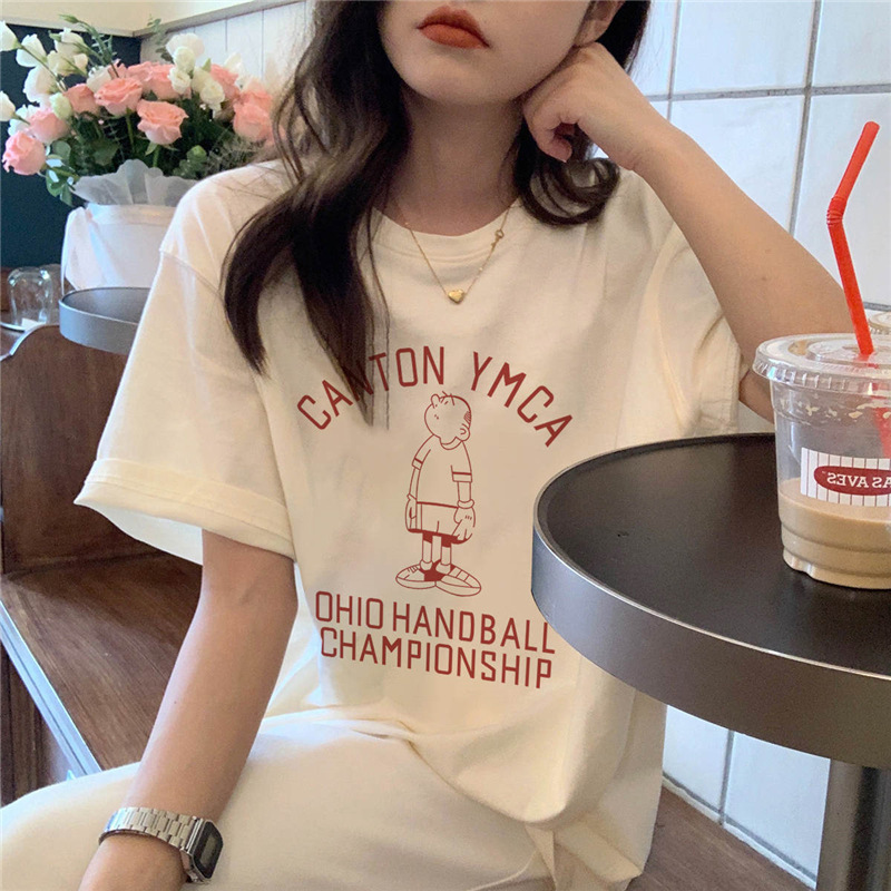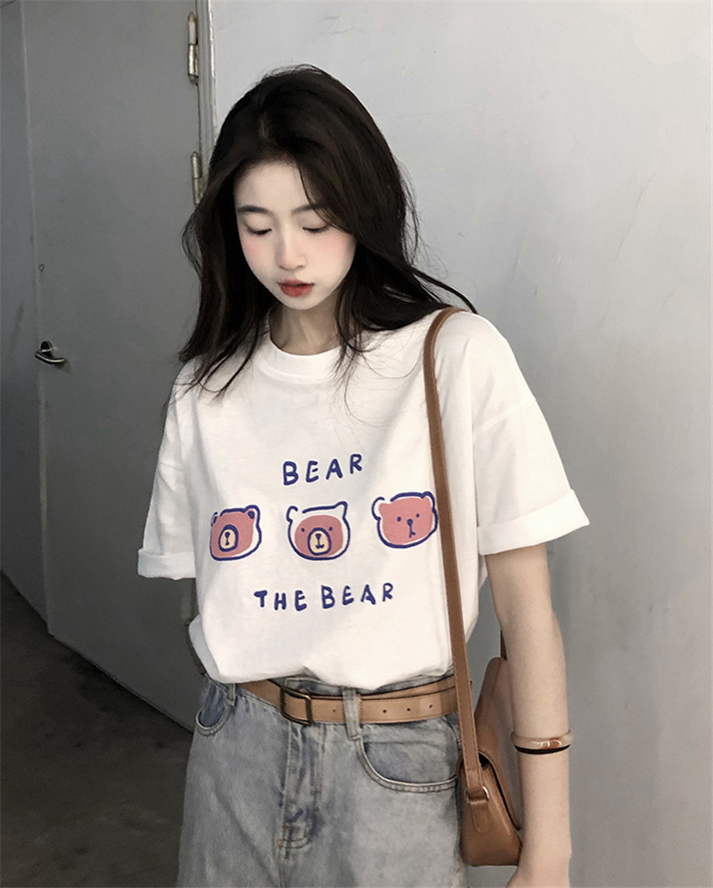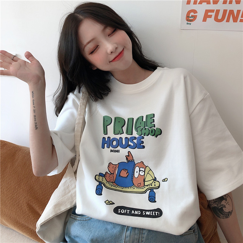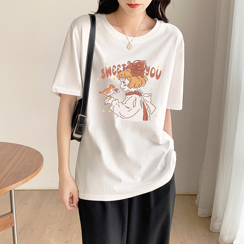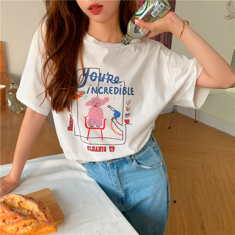 여름 새로운 반팔 티셔츠 여성의 느슨한 한국 스타일 인 여성 올 매치 만화 프린트 내부 하프 슬리브 탑스토어 가기