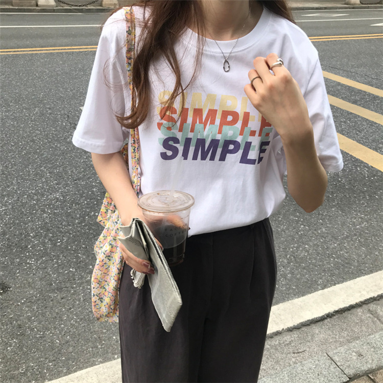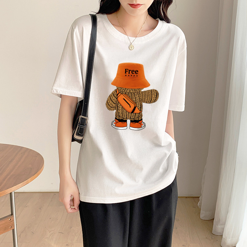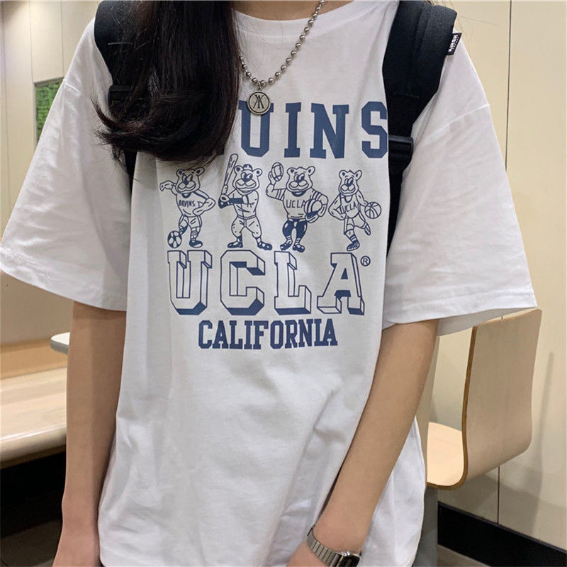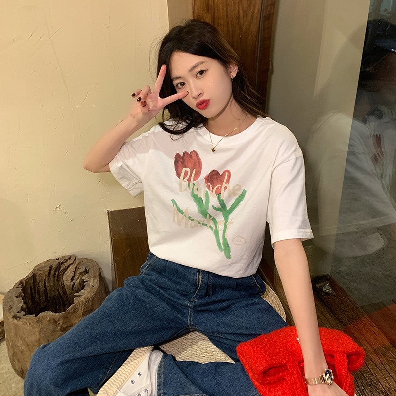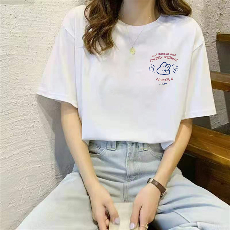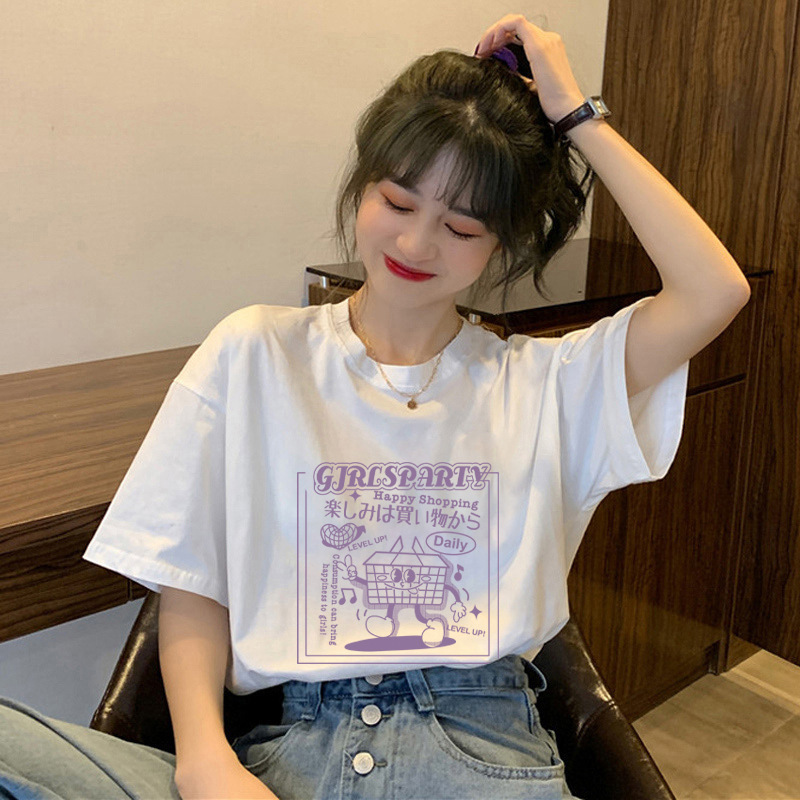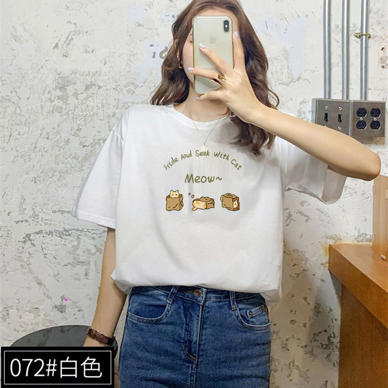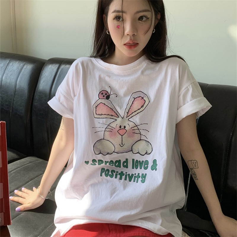 여름 새로운 반팔 티셔츠 여성의 느슨한 한국 스타일 인 여성 올 매치 만화 프린트 내부 하프 슬리브 탑스토어 가기