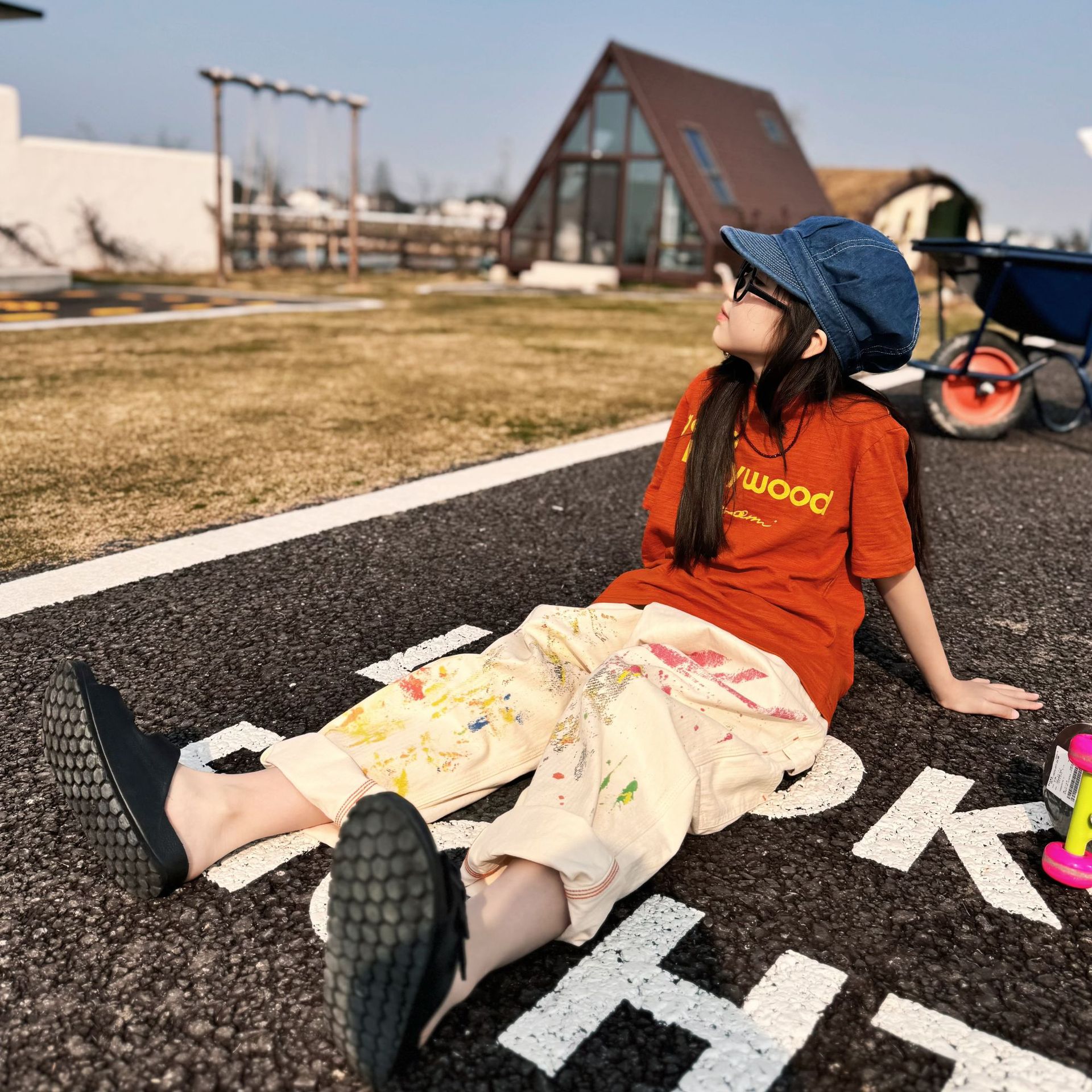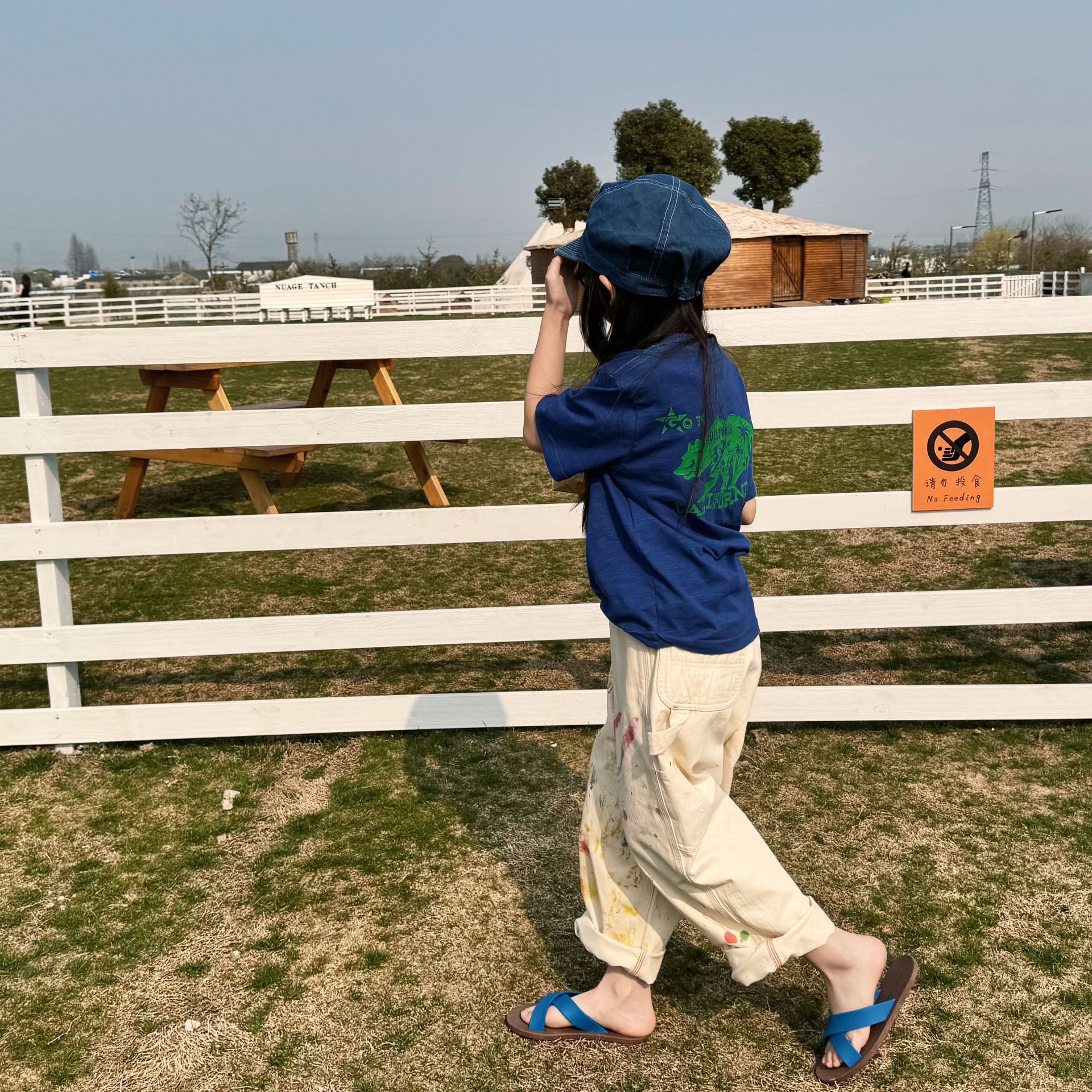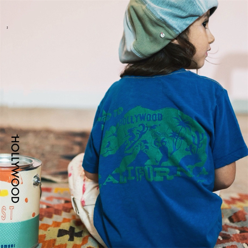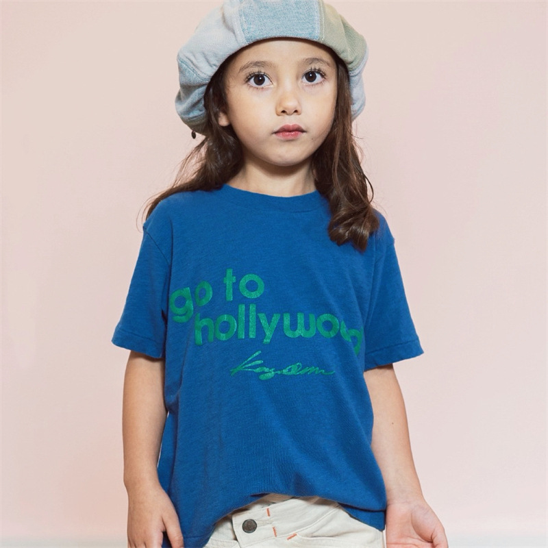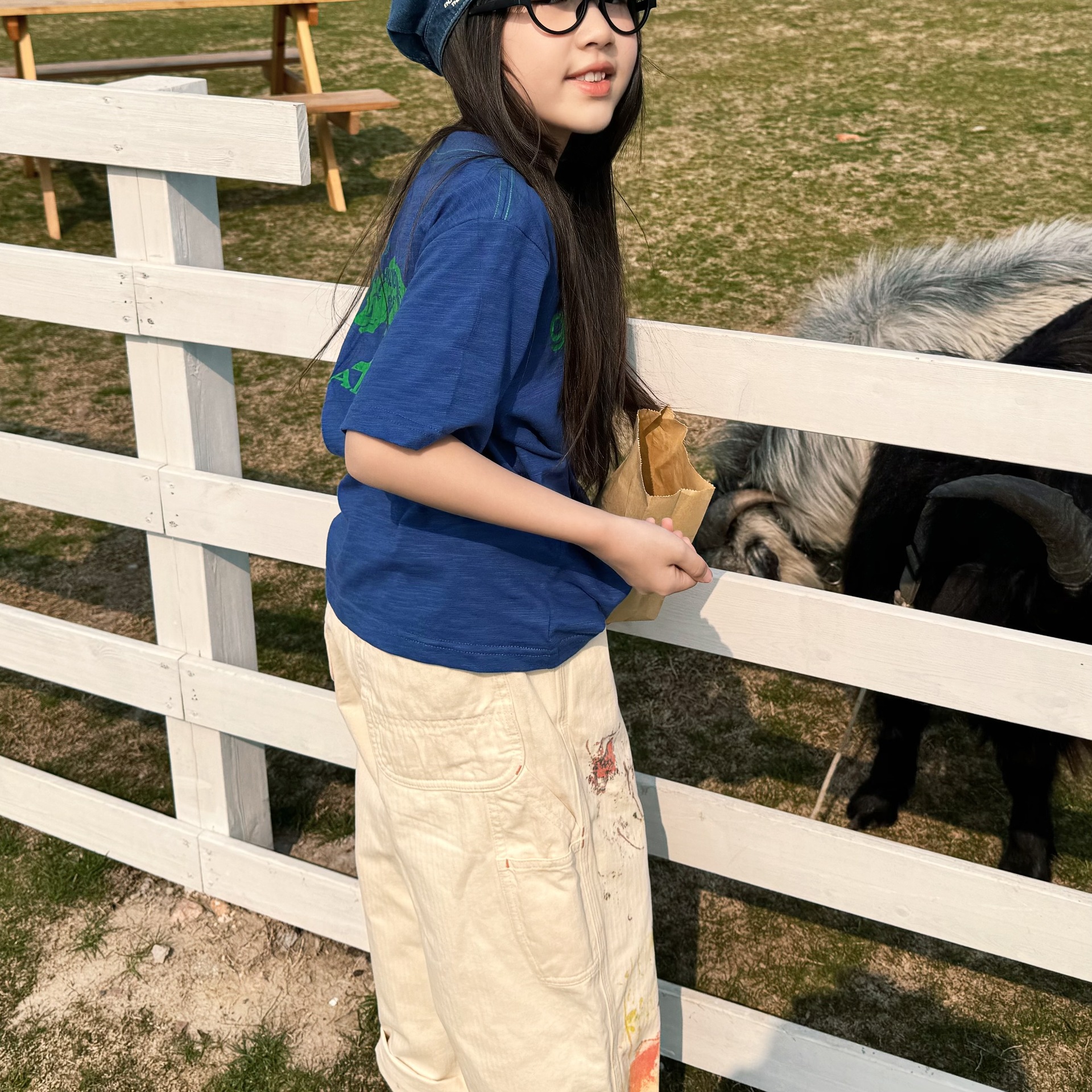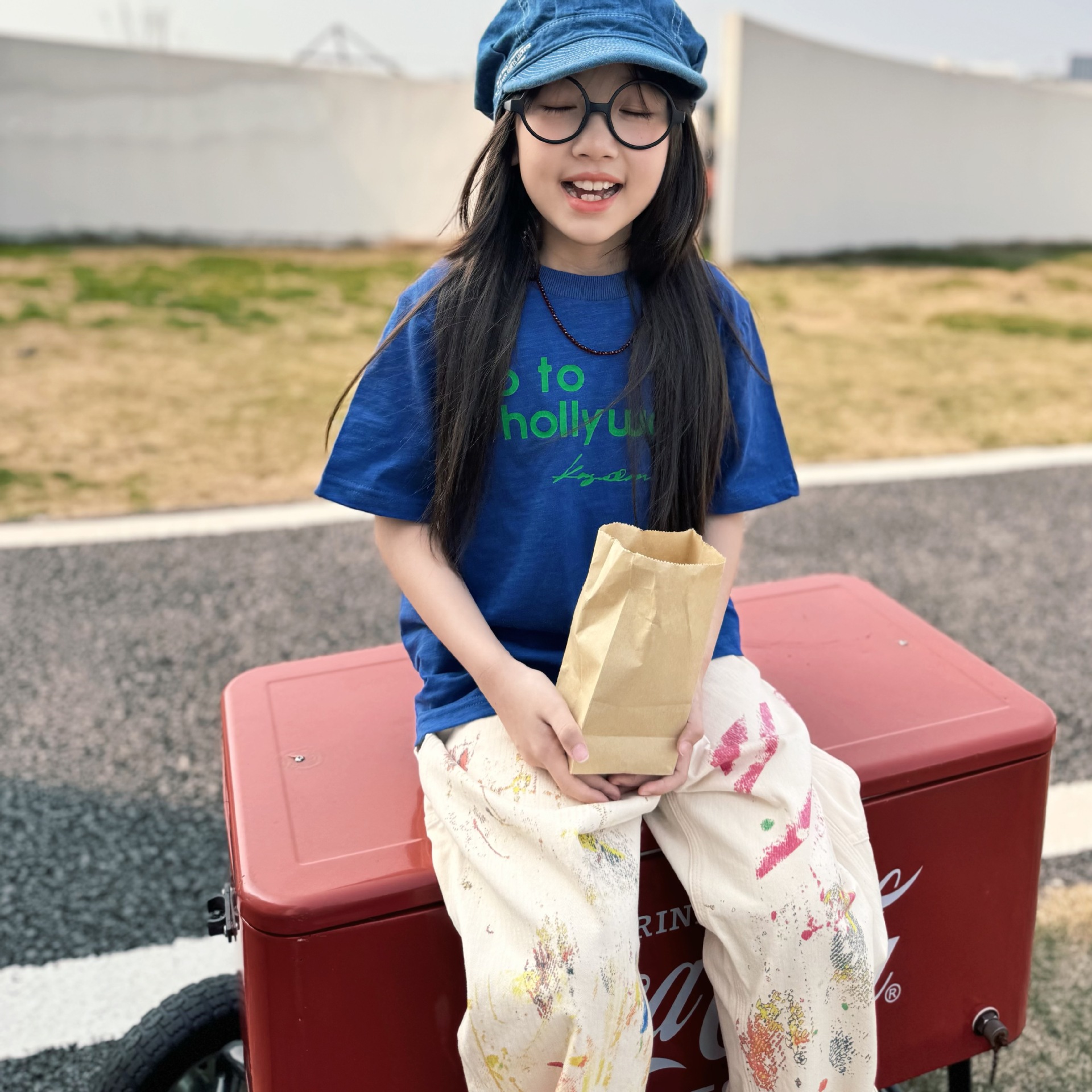 2025 봄과 여름 일본 어린이 편지 만화 소년 소녀 인쇄 둥근 목 반팔 티셔츠 삼색스토어 가기