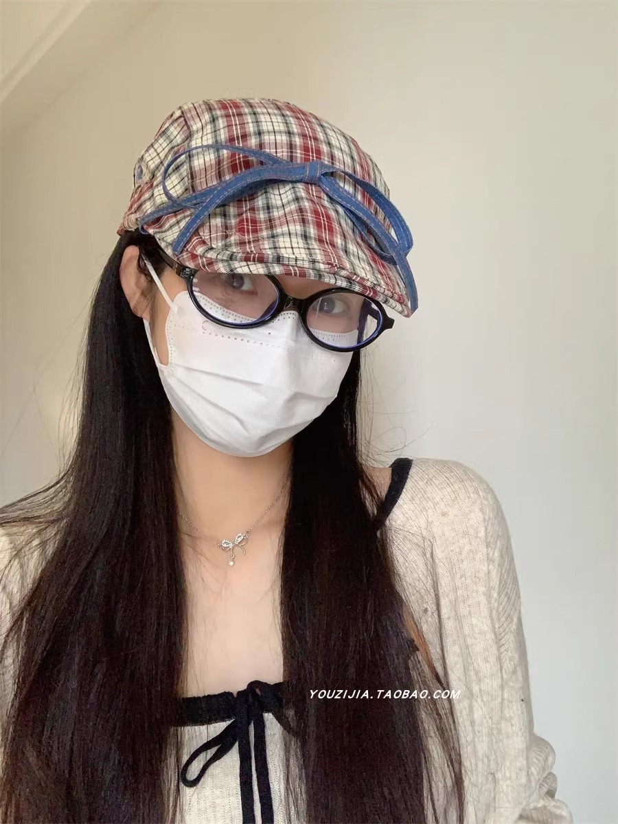 달콤한 맛 ~ 활 넥타이 업 격자 앞으로 모자 여성의 달콤한 여름 얇은 유행 안티 베레 트렌디
