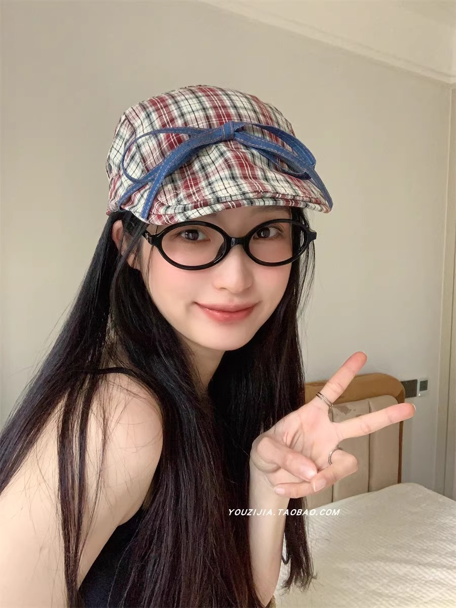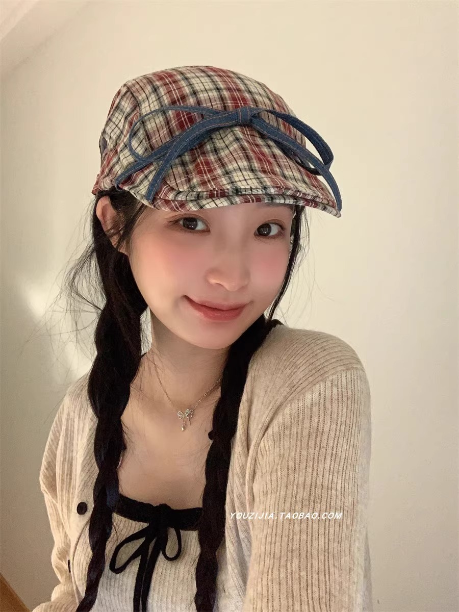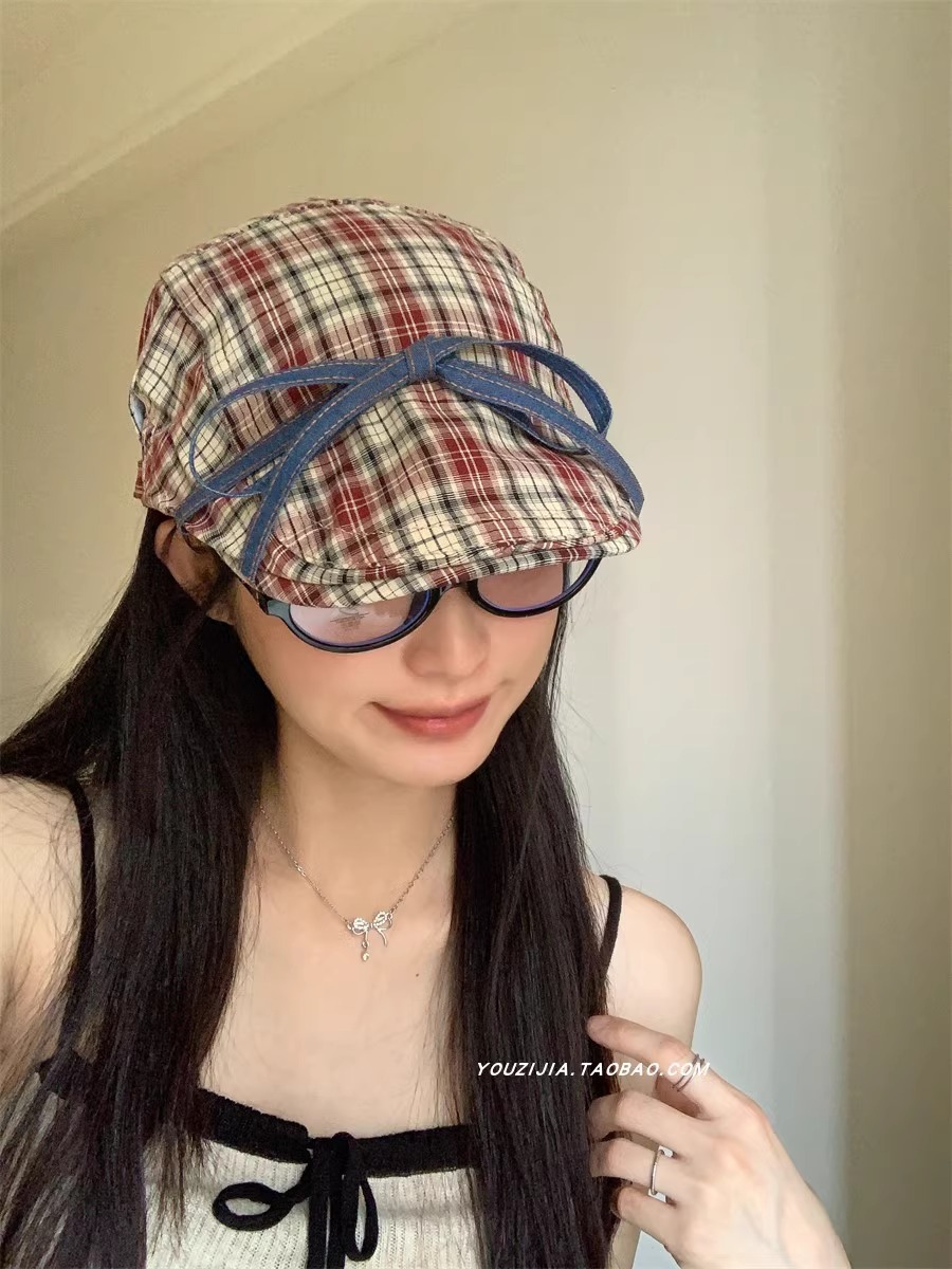 달콤한 맛 ~ 활 넥타이 업 격자 앞으로 모자 여성의 달콤한 여름 얇은 유행 안티 베레 트렌디스토어 가기