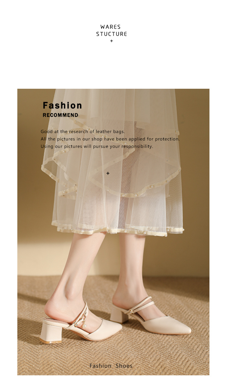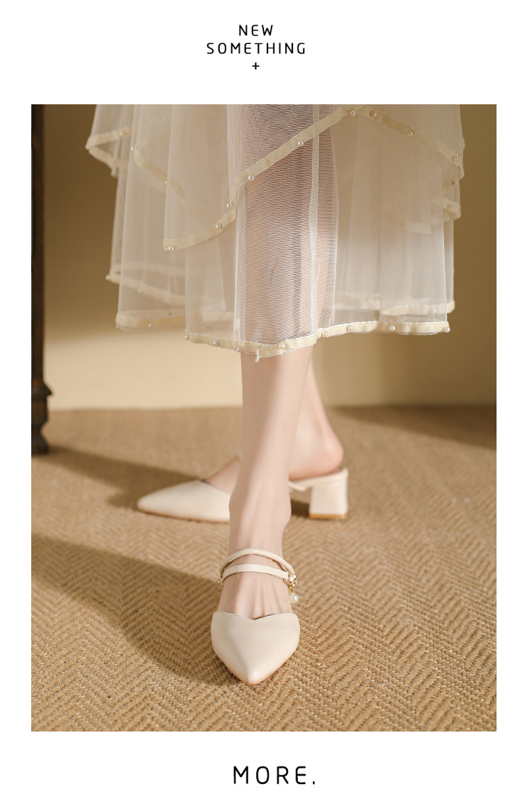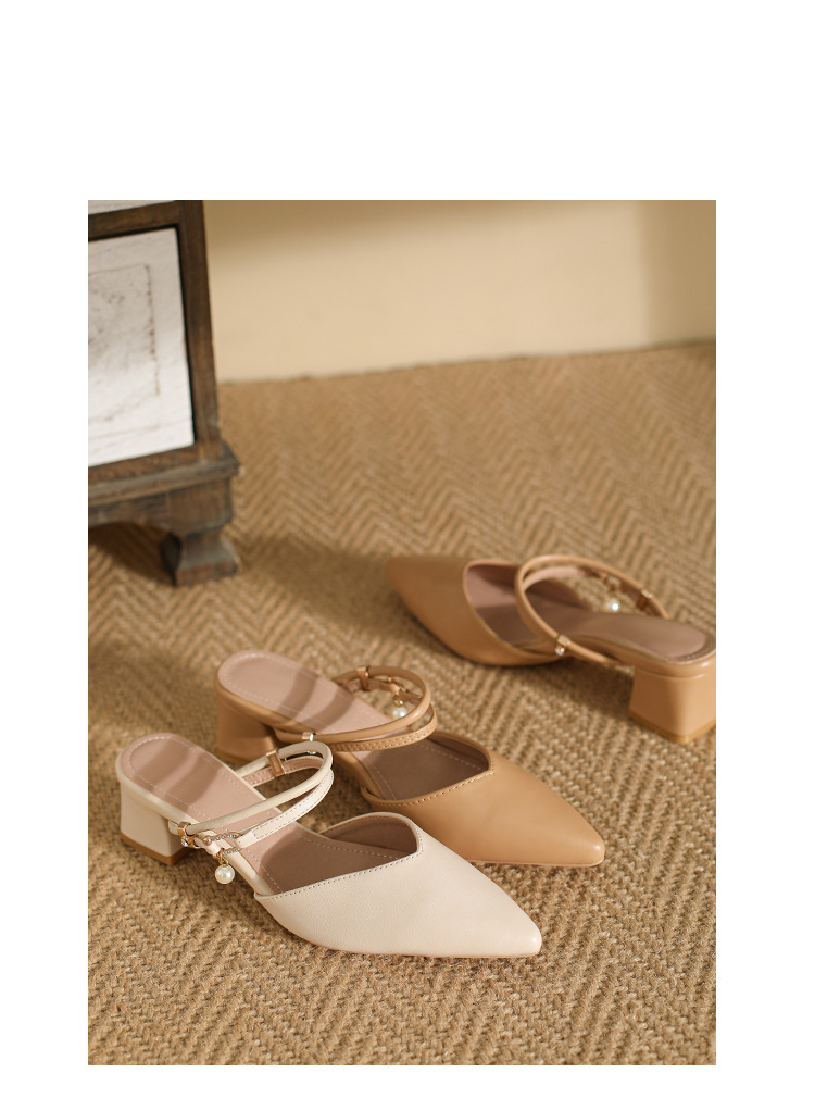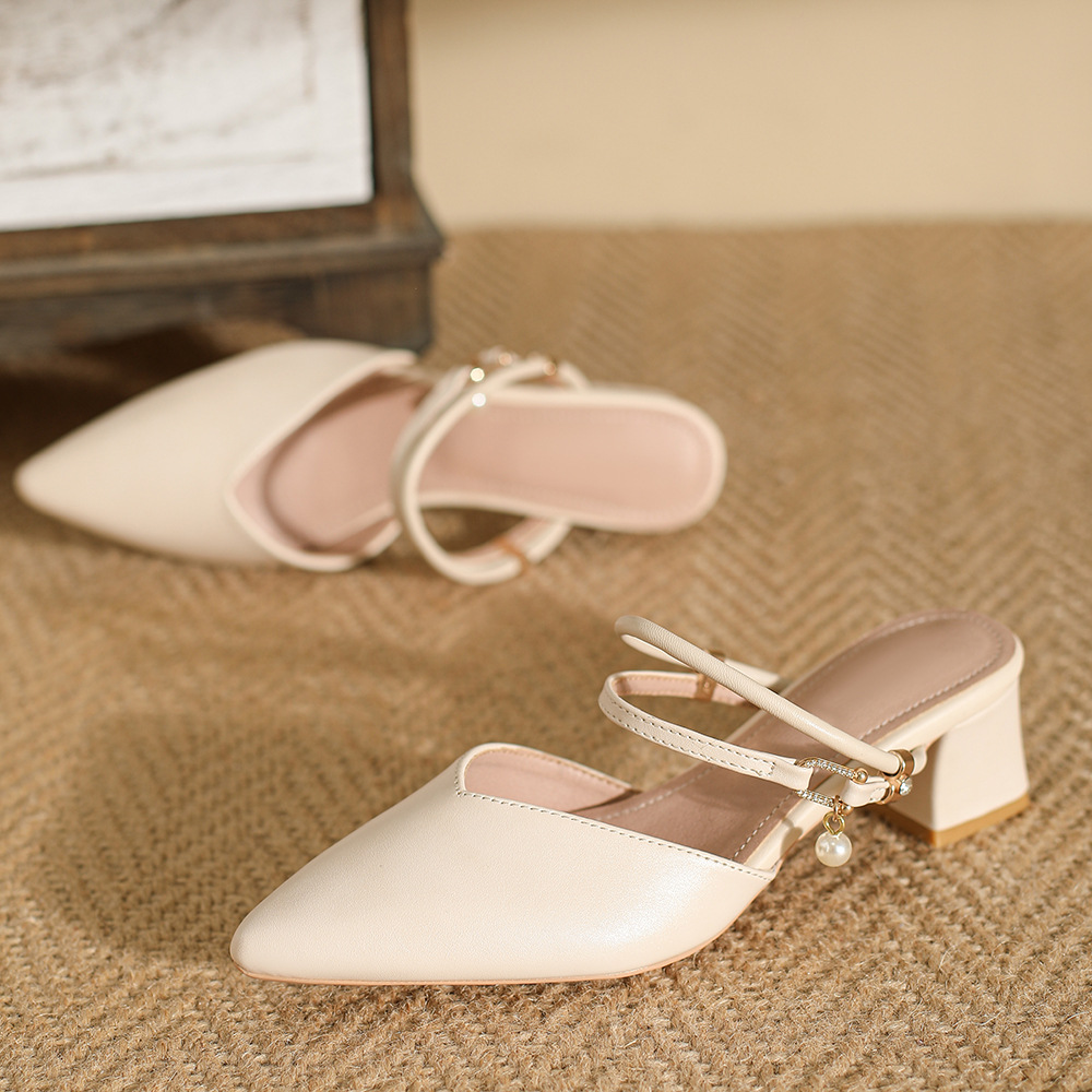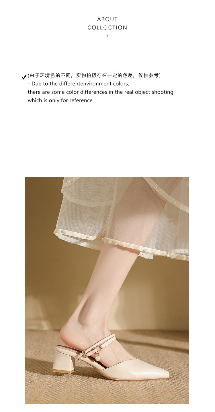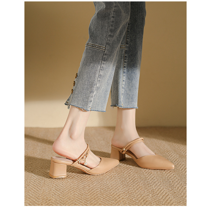 여성 샌들 2024 여름 새로운 뾰족한 발가락 싱글 레이어 신발 두꺼운 미드 힐 하프지지 아름다운 하이힐 프렌치 클로즈드 발가락 야외 슬리퍼스토어 가기