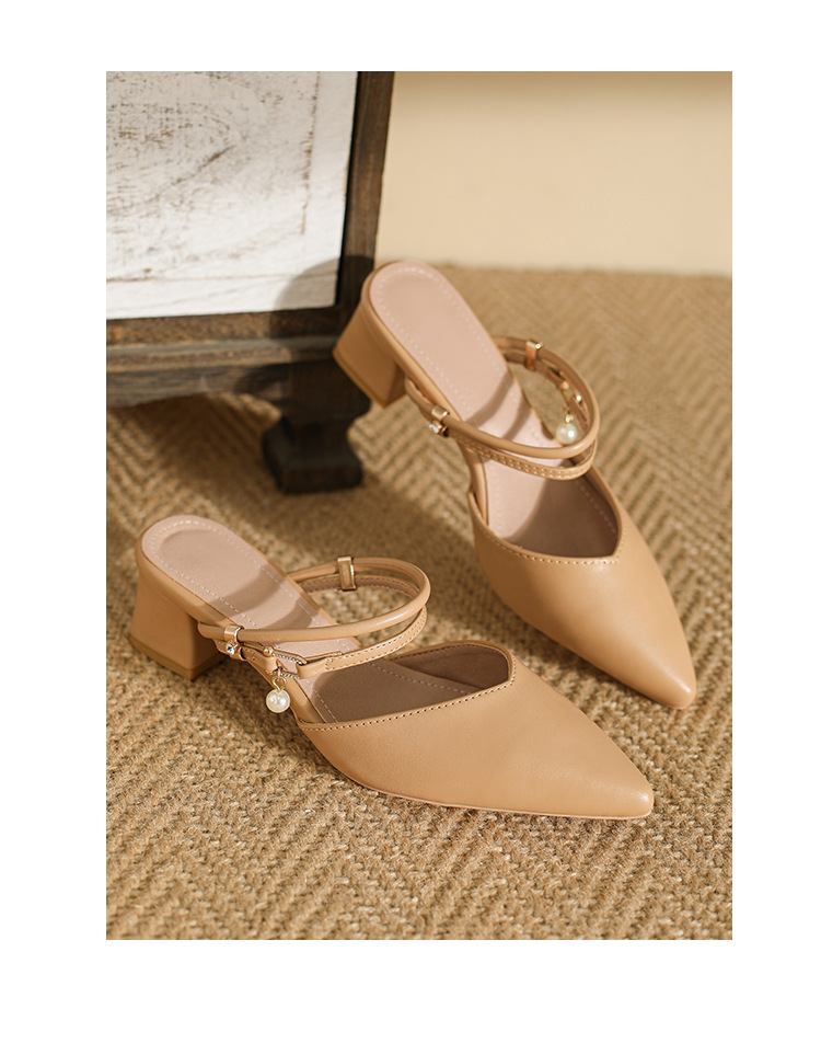 여성 샌들 2024 여름 새로운 뾰족한 발가락 싱글 레이어 신발 두꺼운 미드 힐 하프지지 아름다운 하이힐 프렌치 클로즈드 발가락 야외 슬리퍼