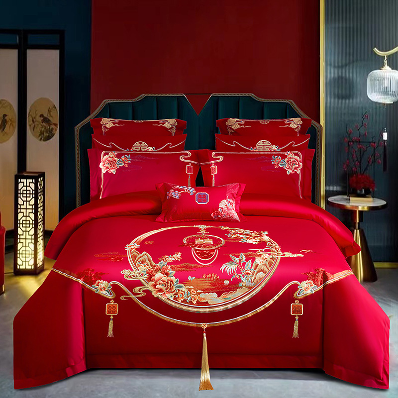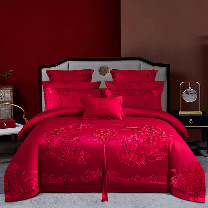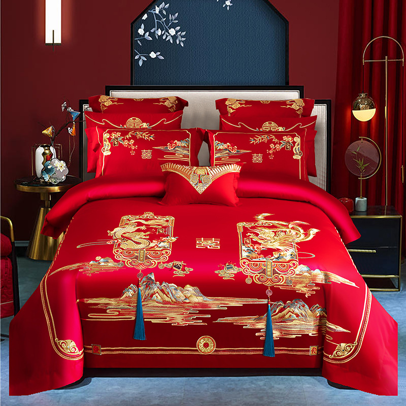 새로운 140 전통 중국 하이 엔드 절묘한 면 레드 드래곤과 피닉스 자수 웨딩 크래프트 웨딩 4 피스 세트 4스토어 가기