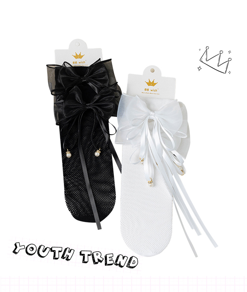 2024 여름 새로운 초박형 메쉬 진주 리본 활 어린이 중반 송아지 양말 소녀의 망사 종아리 양말