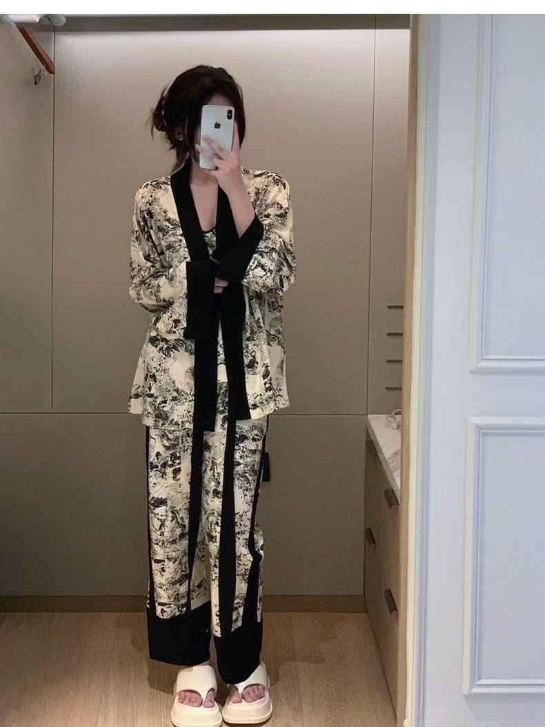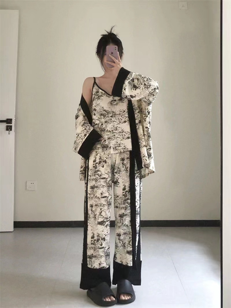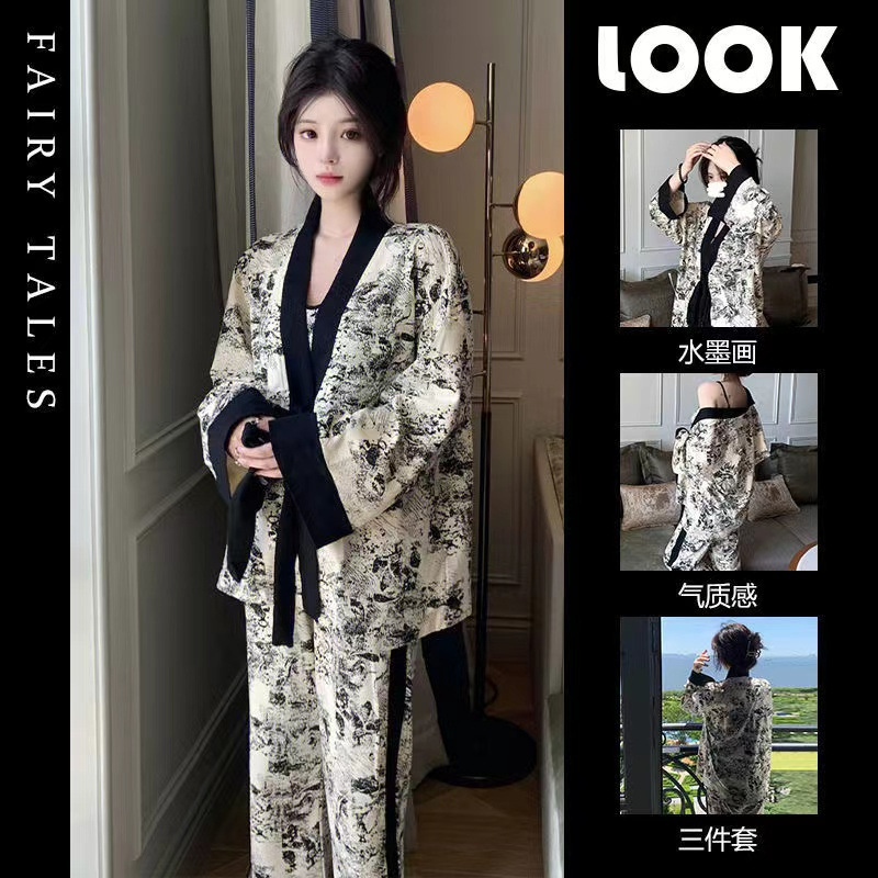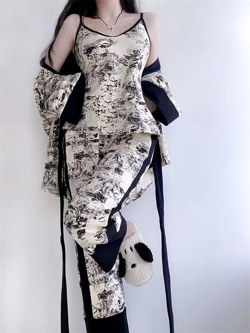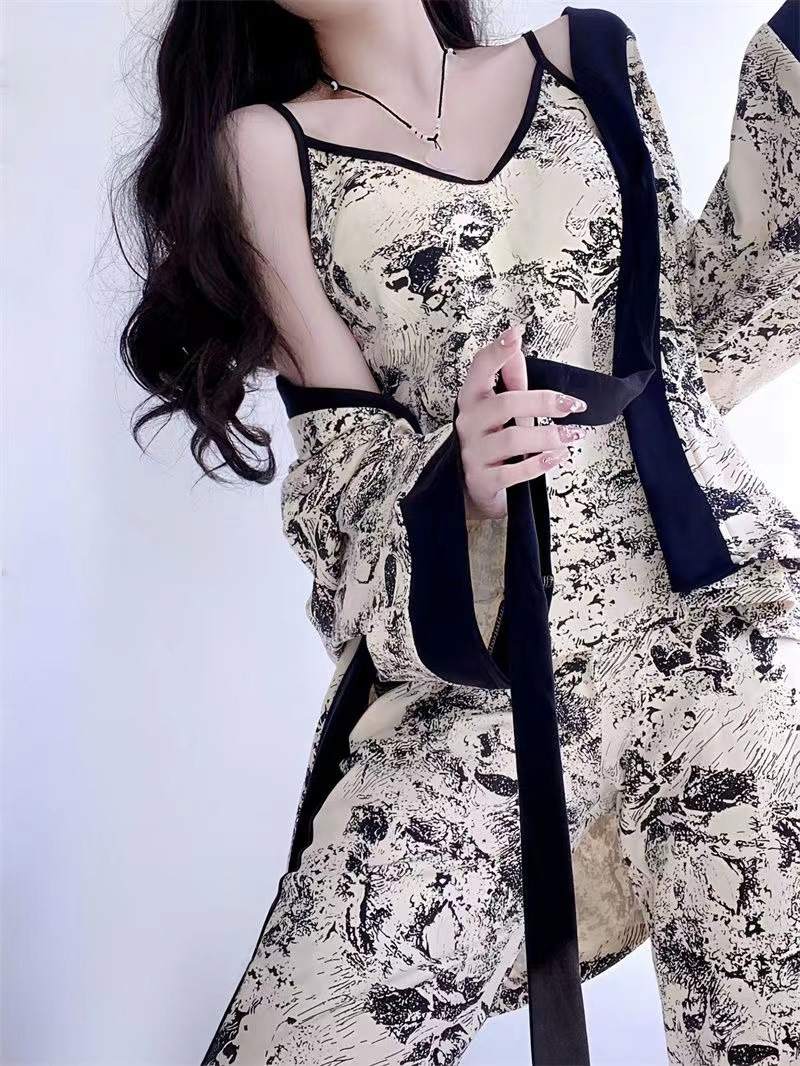 네트 레드 스타일, 잠옷 여성 봄과 가을 3 피스 긴팔 바지 섹시한 스트랩 잉크 페인팅 홈웨어 세트스토어 가기