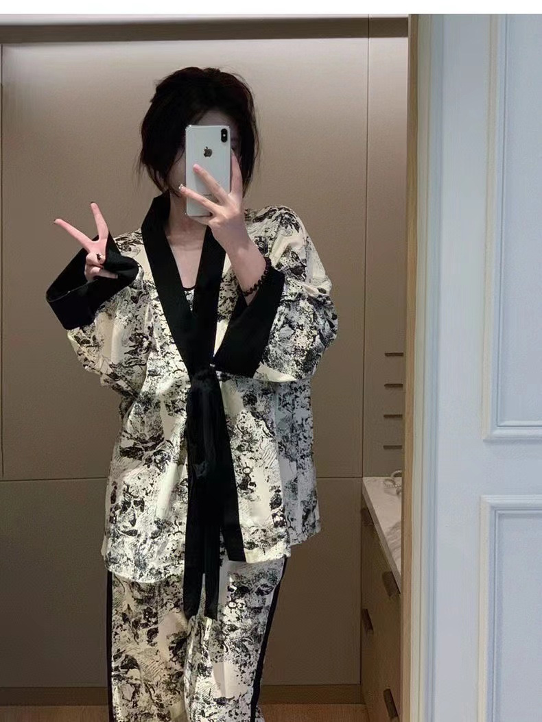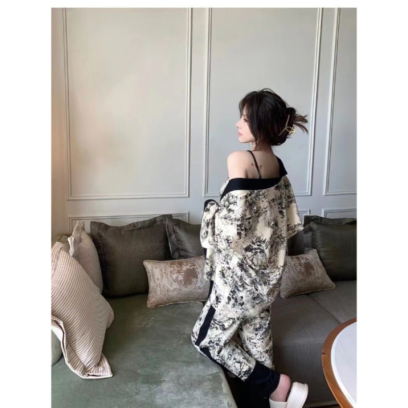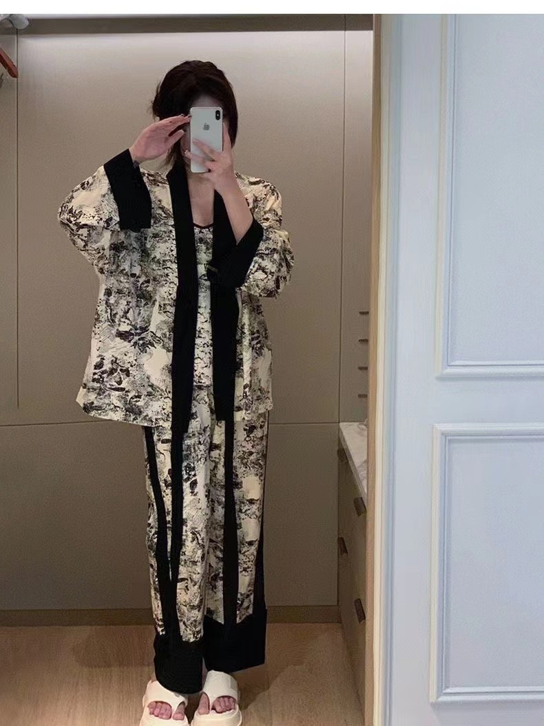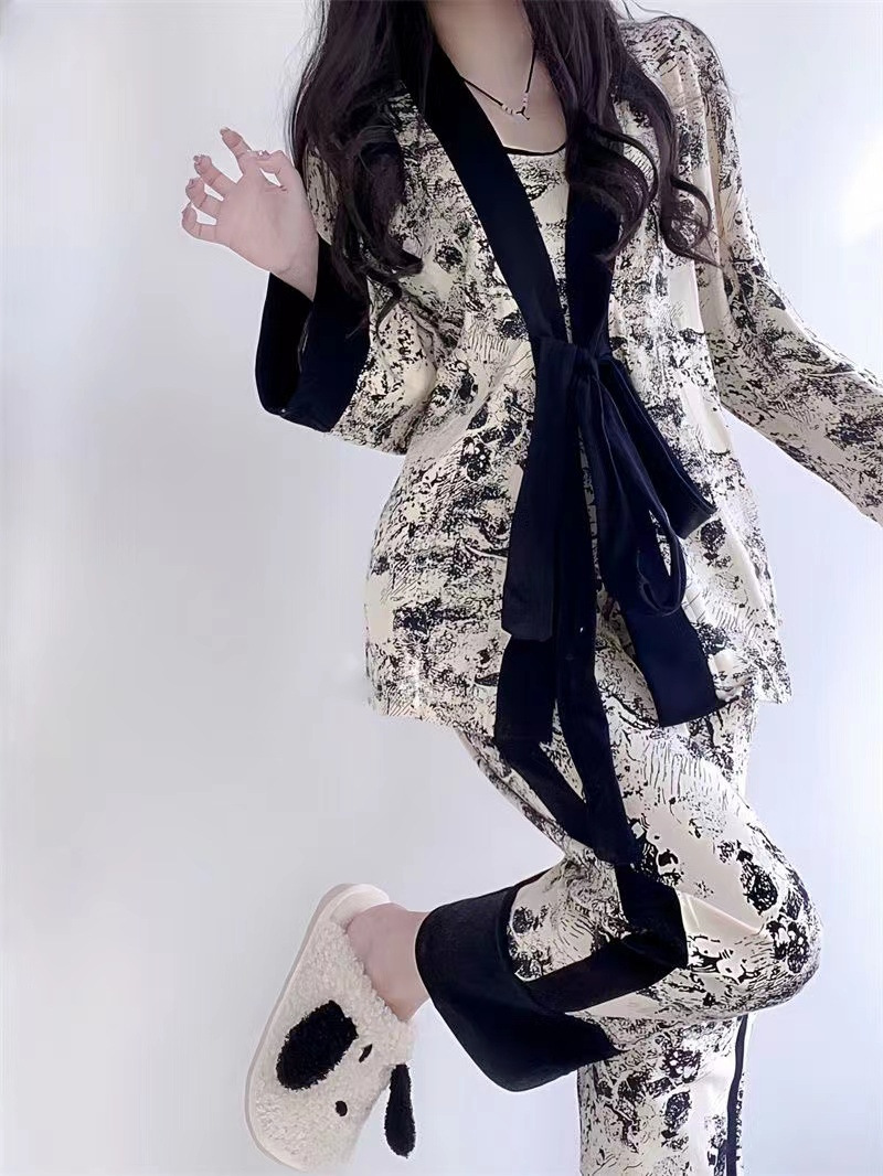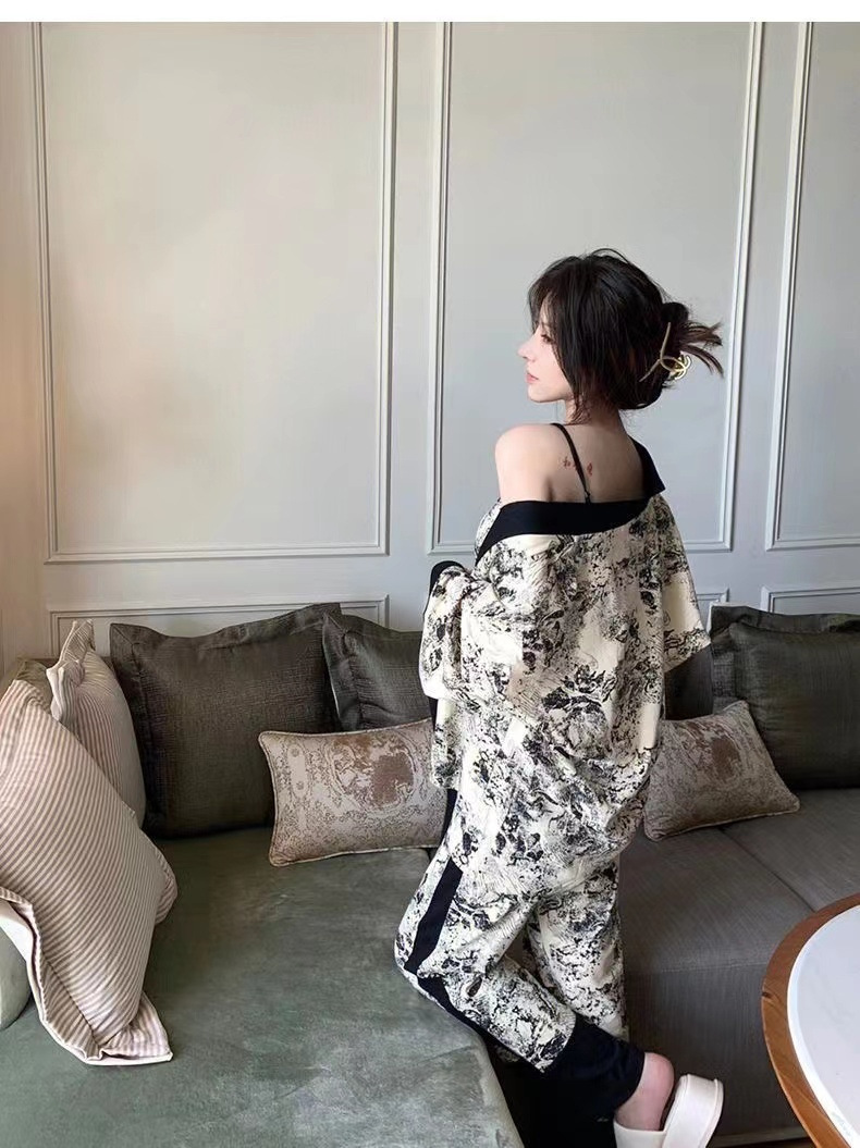 네트 레드 스타일, 잠옷 여성 봄과 가을 3 피스 긴팔 바지 섹시한 스트랩 잉크 페인팅 홈웨어 세트스토어 가기