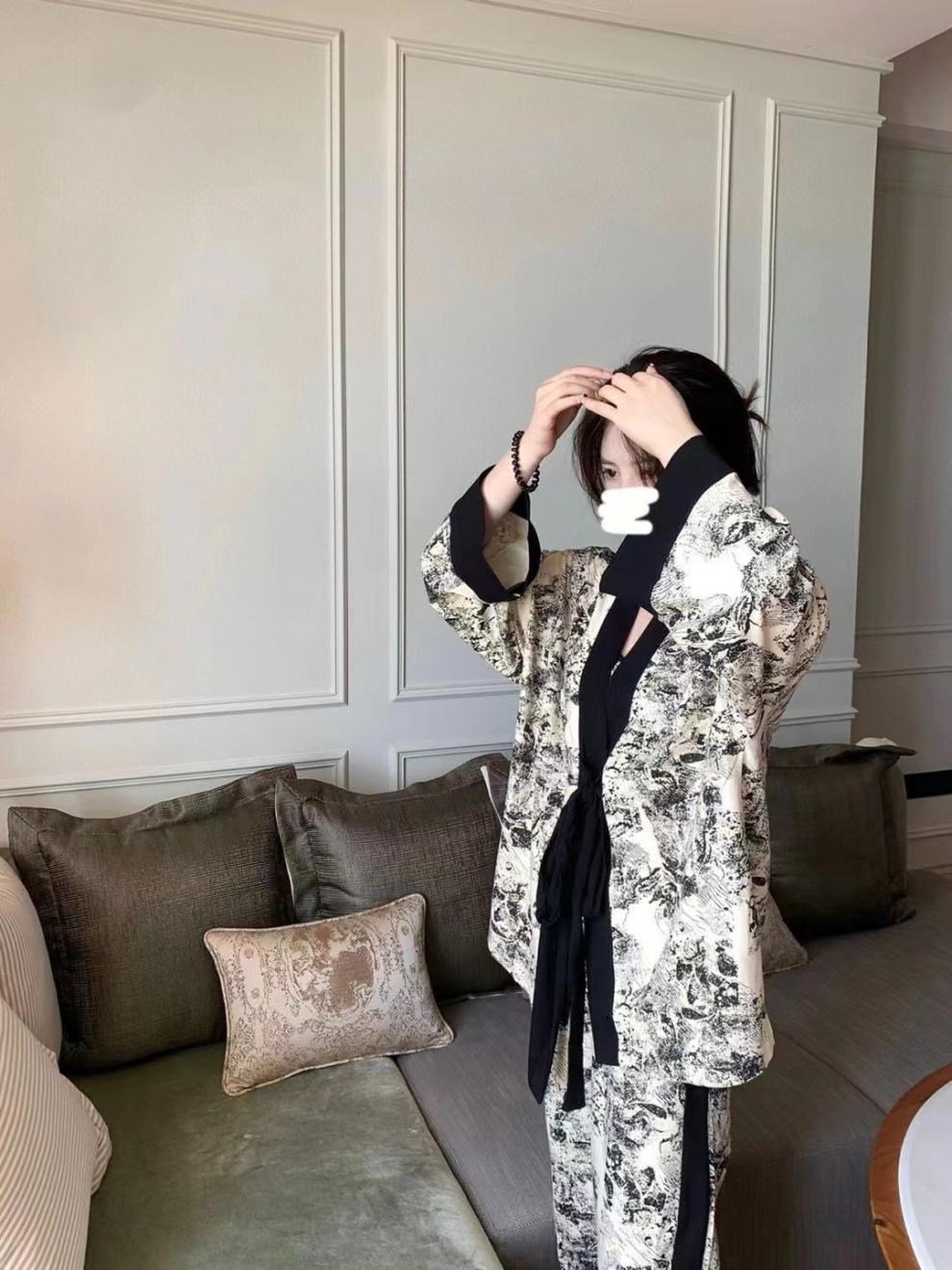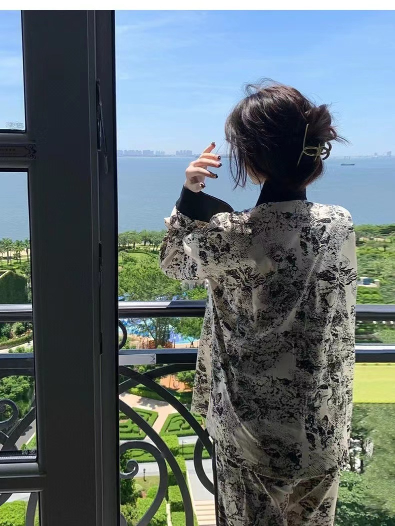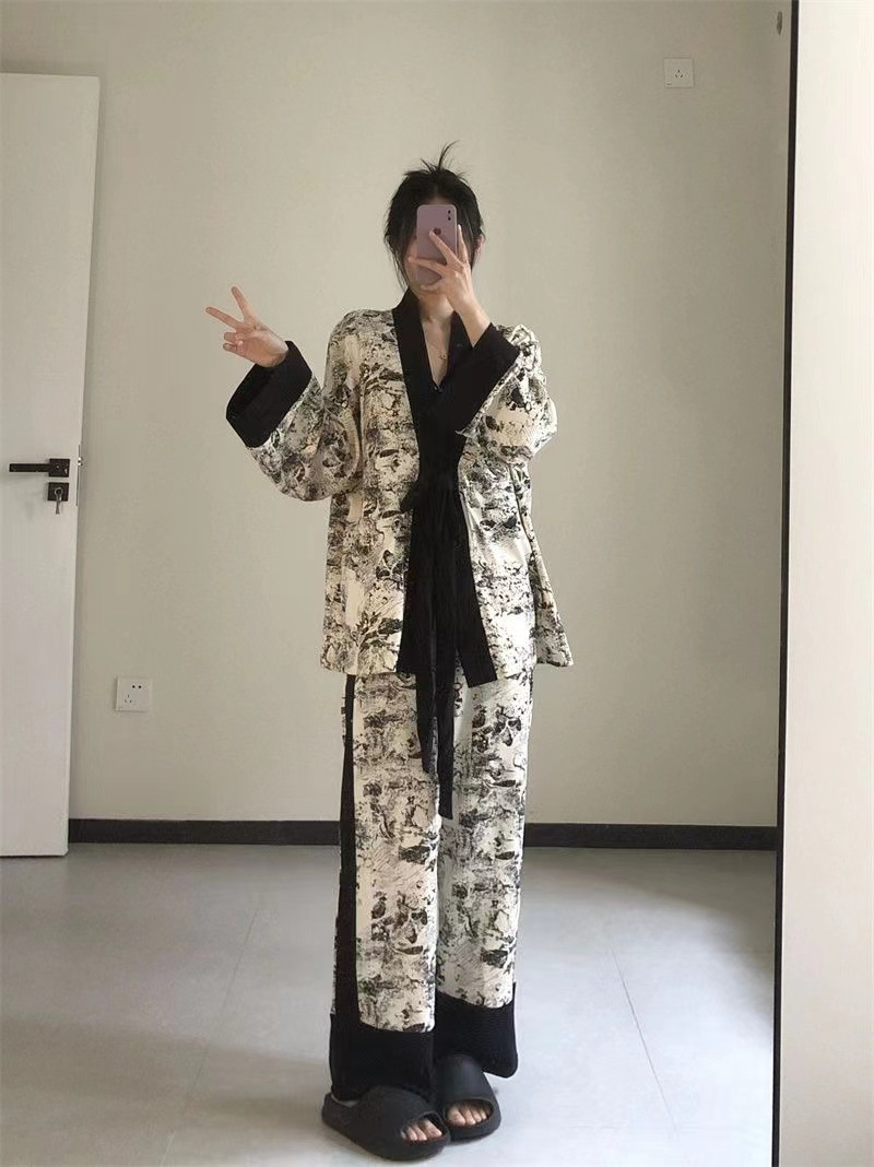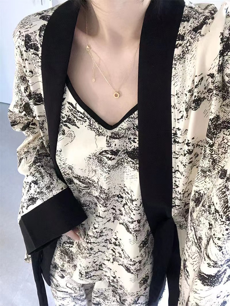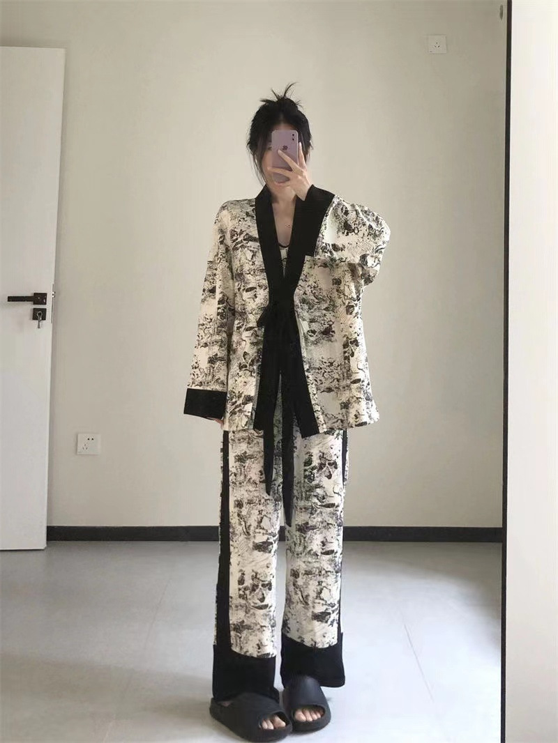 네트 레드 스타일, 잠옷 여성 봄과 가을 3 피스 긴팔 바지 섹시한 스트랩 잉크 페인팅 홈웨어 세트스토어 가기