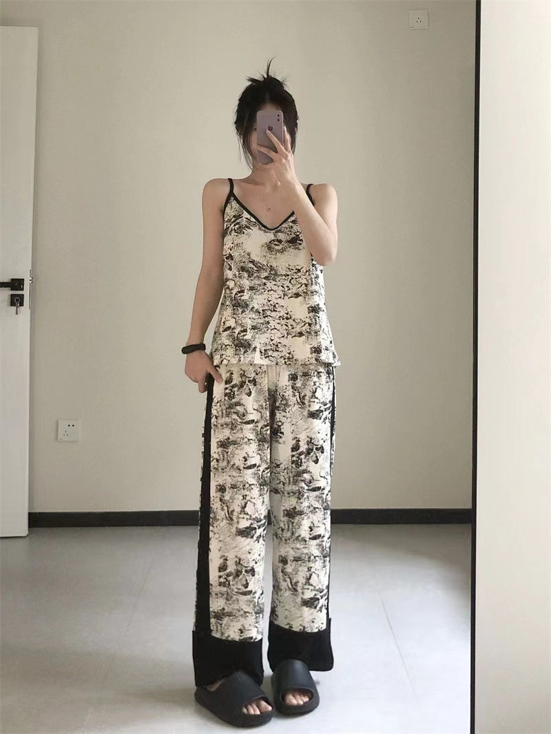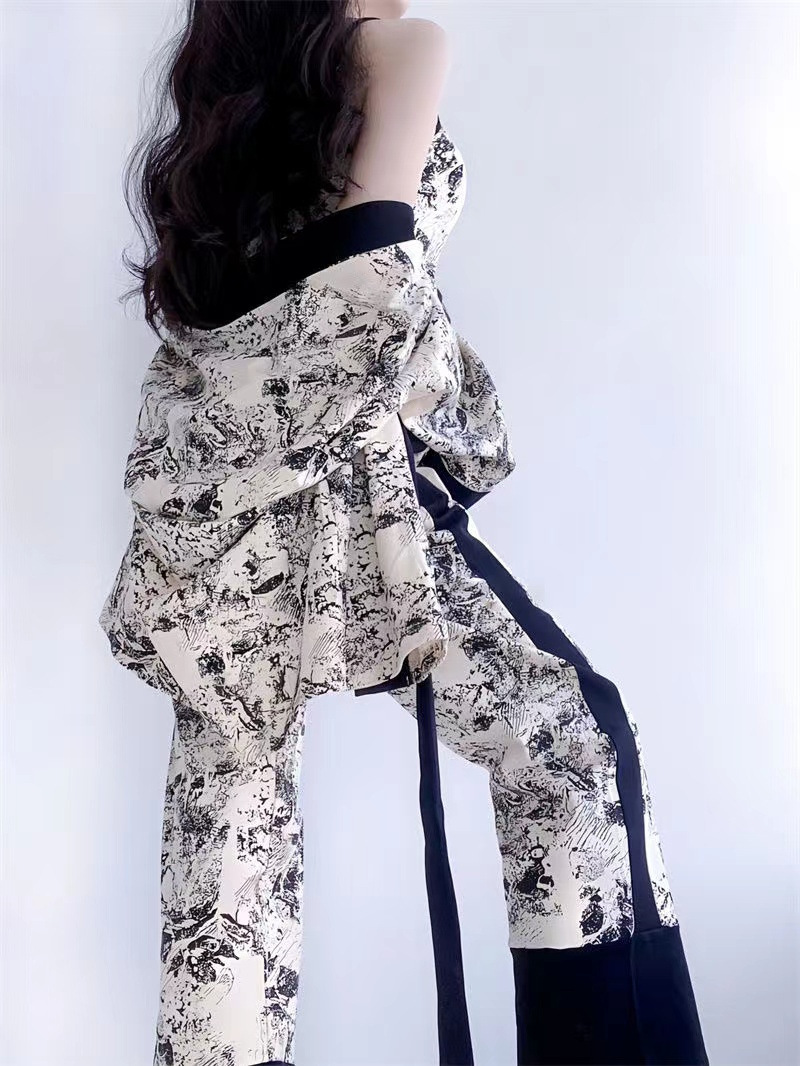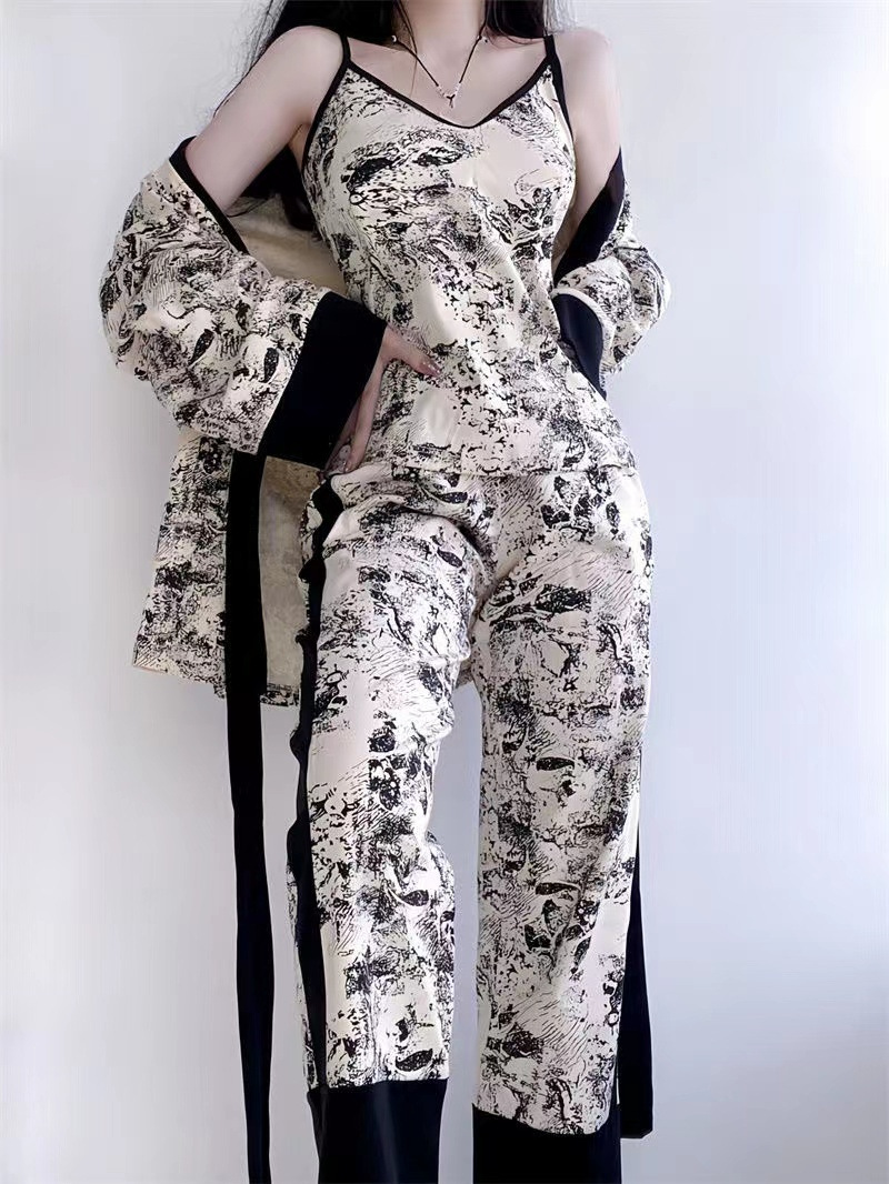 네트 레드 스타일, 잠옷 여성 봄과 가을 3 피스 긴팔 바지 섹시한 스트랩 잉크 페인팅 홈웨어 세트