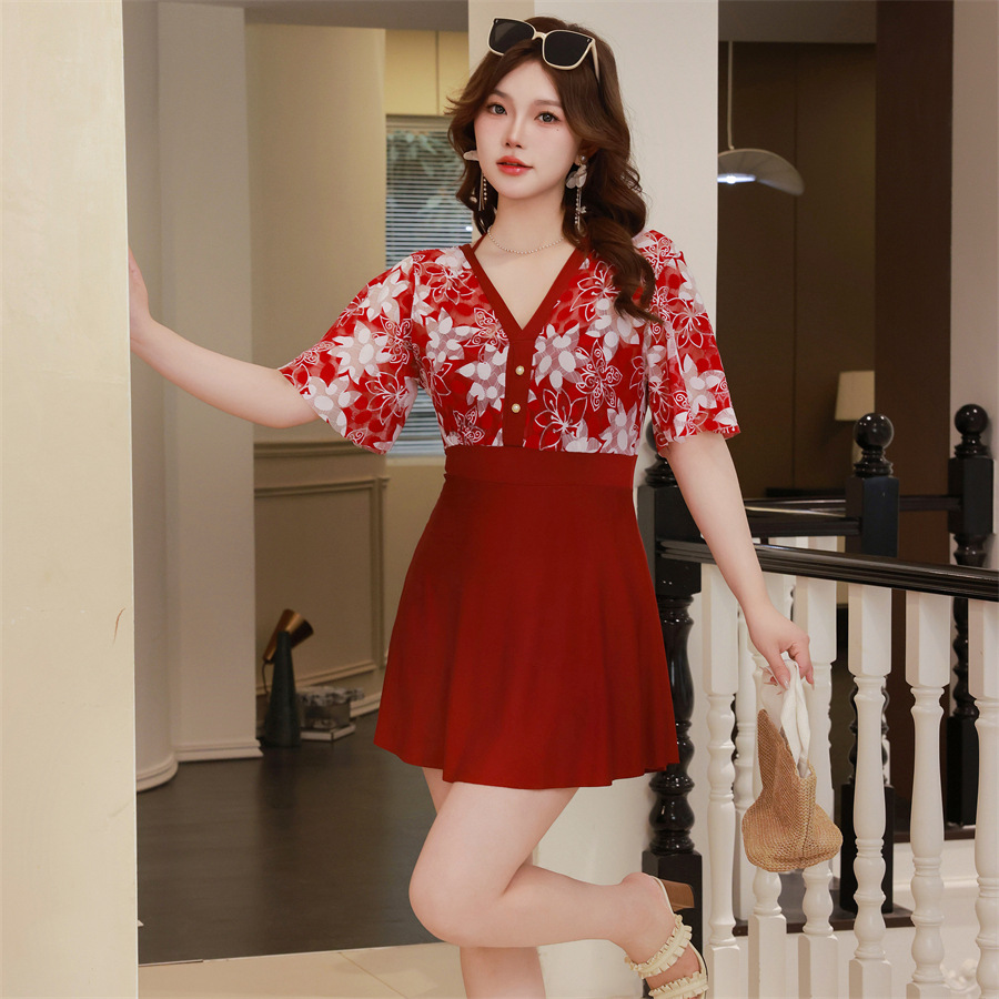 2024 뉴 플러스 사이즈 수영복 여성 원피스 보수적 인 통통녀 온천 레이스 배꼽 슬리밍 언더 와이어 여성 수영복