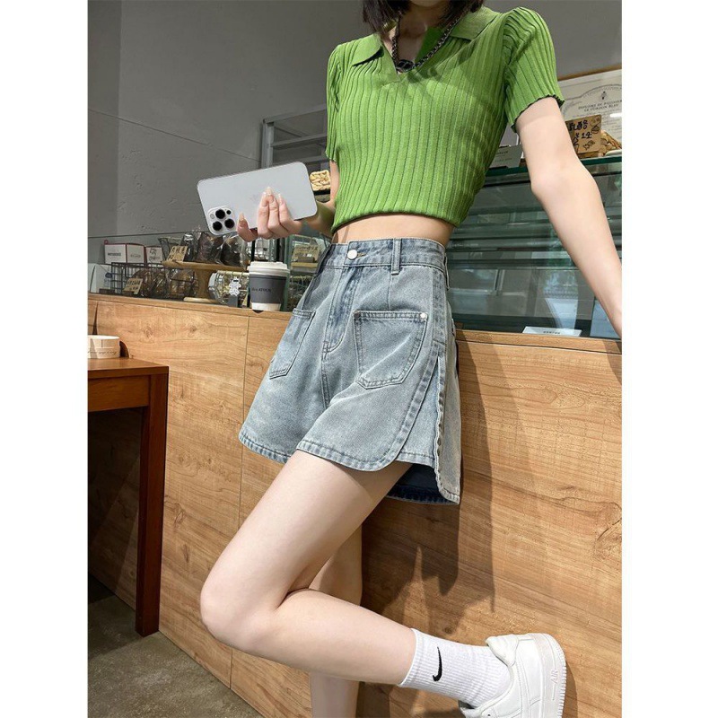 높은 허리 데님 반바지 여성 여름 얇은 2023 새로운 디자인 분할 뜨거운 소녀 플러스 사이즈 슬리밍 반바지