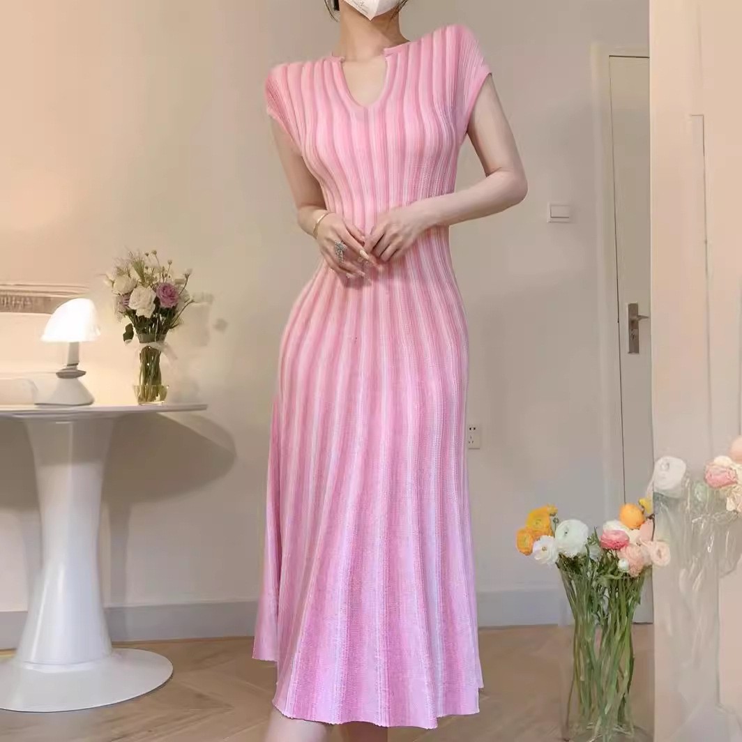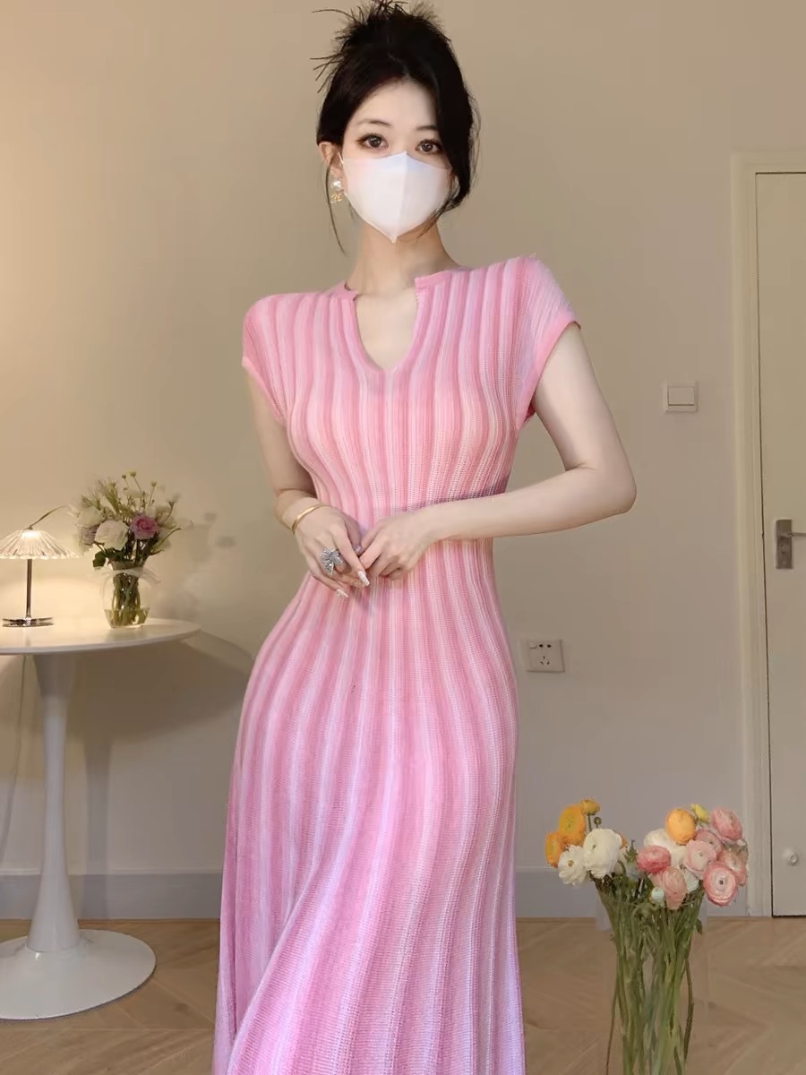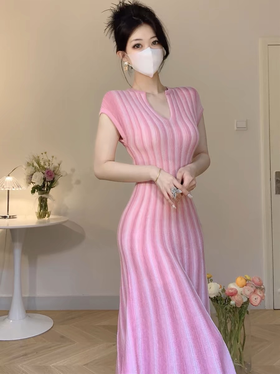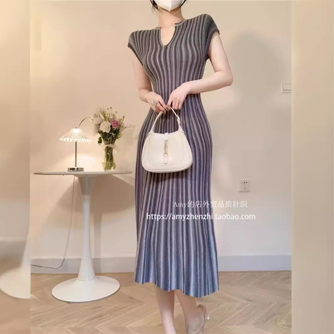 2024 봄과 여름 새로운 슬림 핏 슬리밍 콘트라스트 컬러 스트라이프 그라데이션 컬러 세로 스트라이프 니트 원피스 여성용 A 라인 원피스