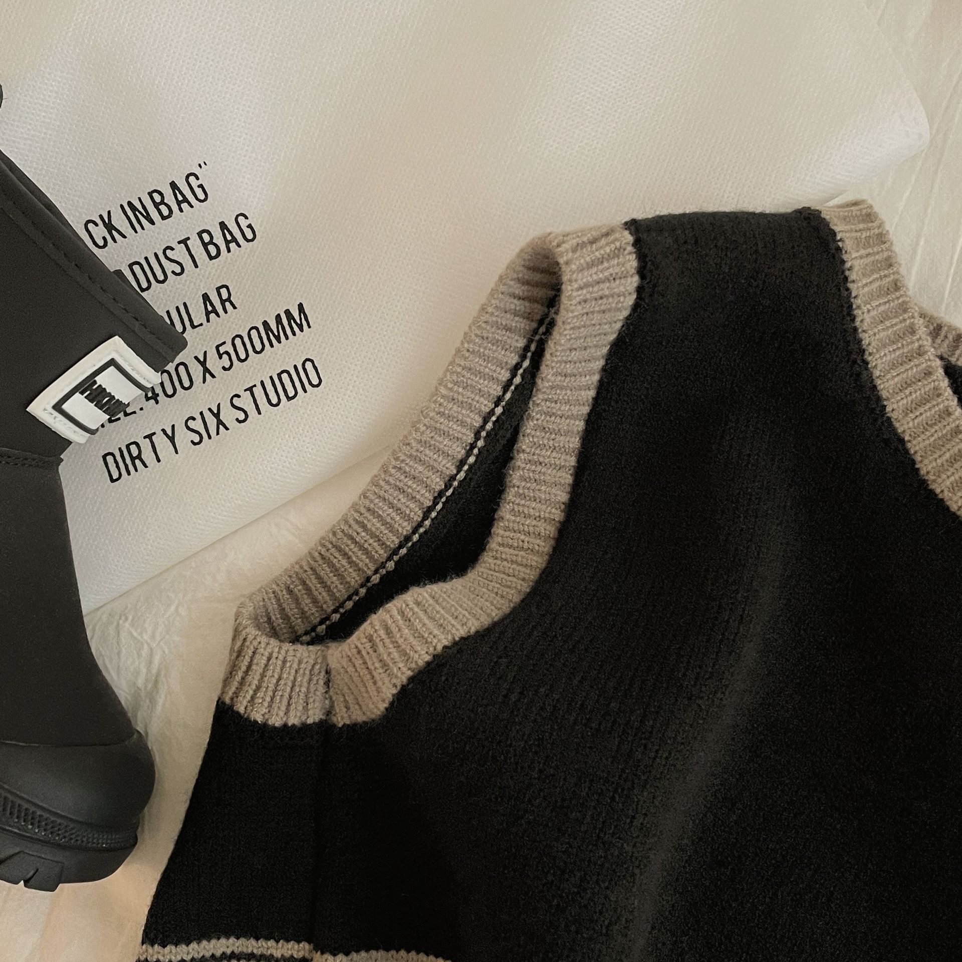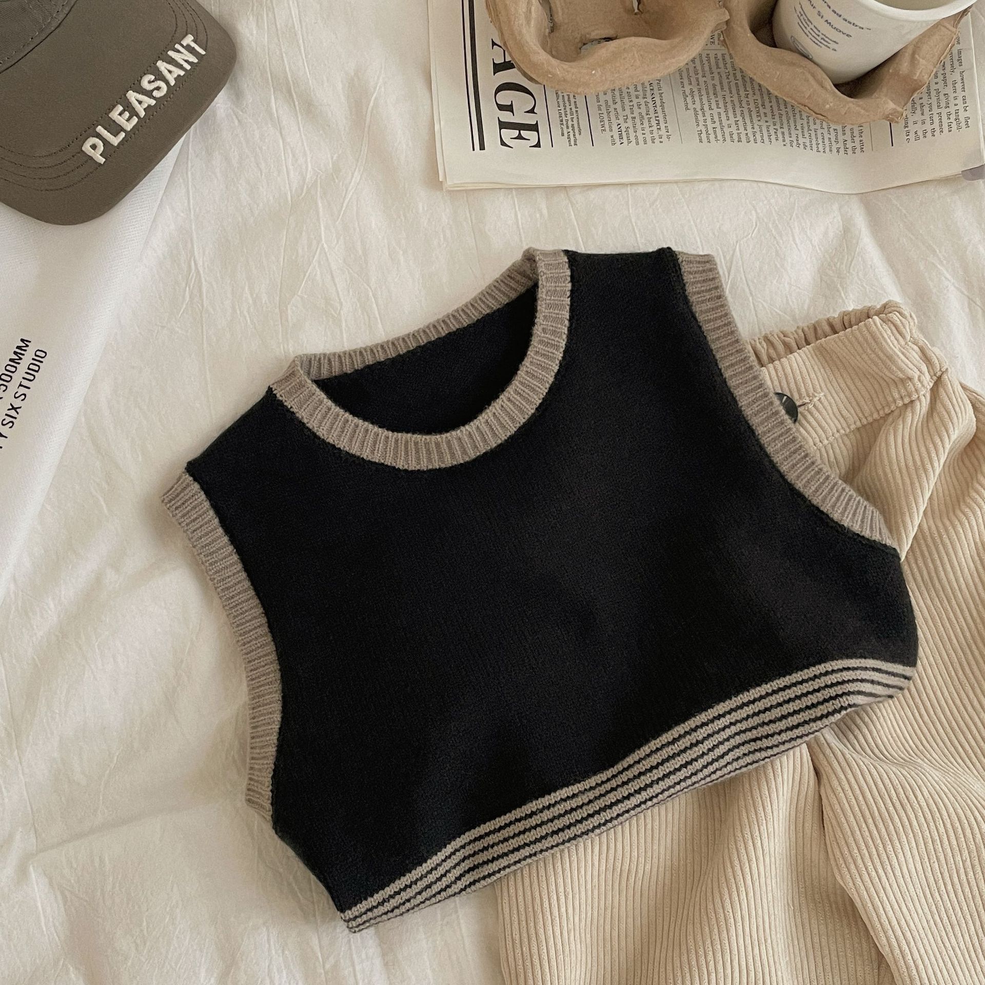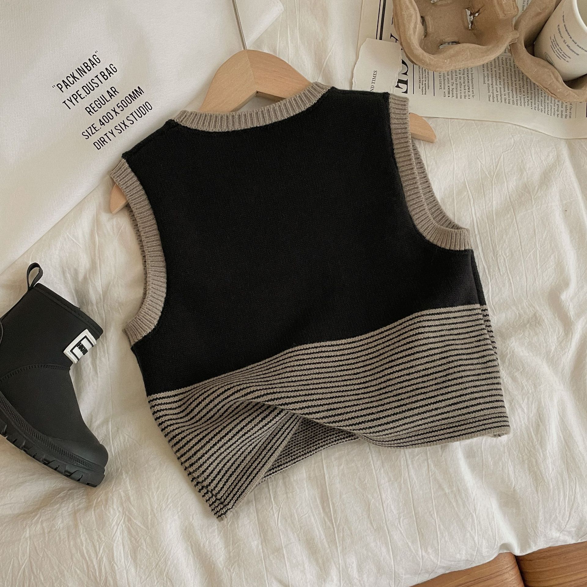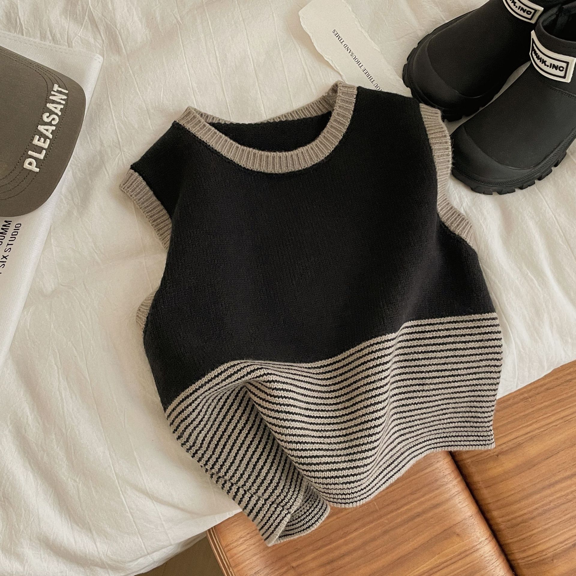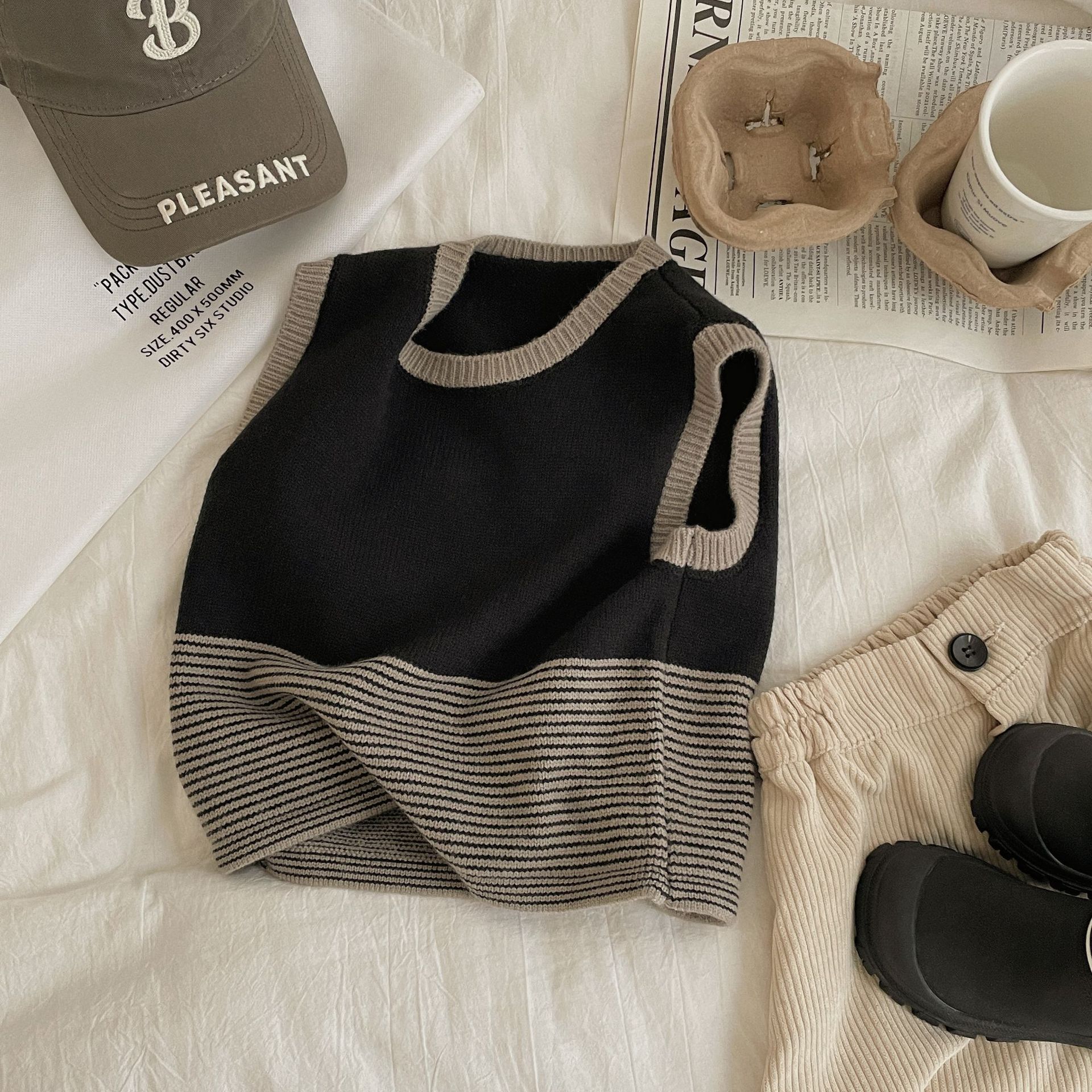 Ben Shushu 어린이 핀 스트라이프 컬러 블록 니트 조끼 2025 봄, 가을 라운드 넥 풀오버 한국 스타일 아동 스웨터 조끼스토어 가기