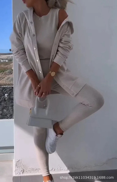 2024 봄 새로운 여성 스포츠 캐주얼 후드 스웨터 두꺼운 실 슬림 조끼 바지 3 피스 세트스토어 가기