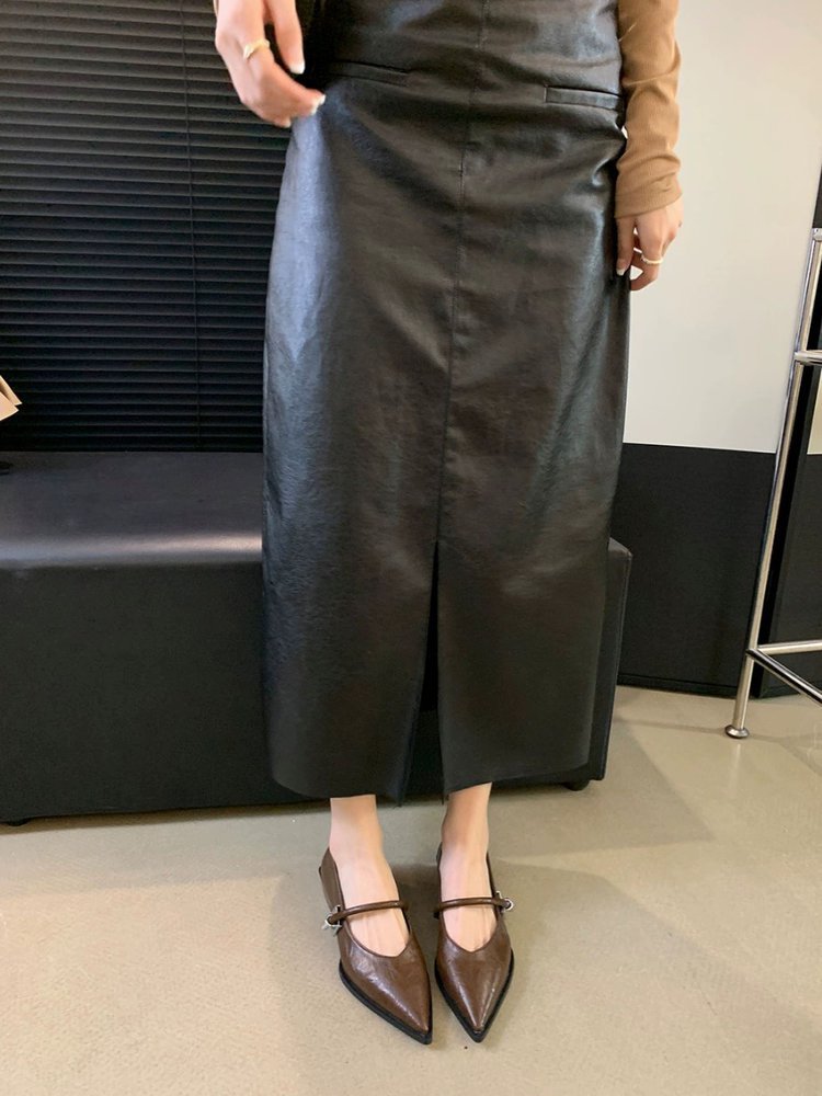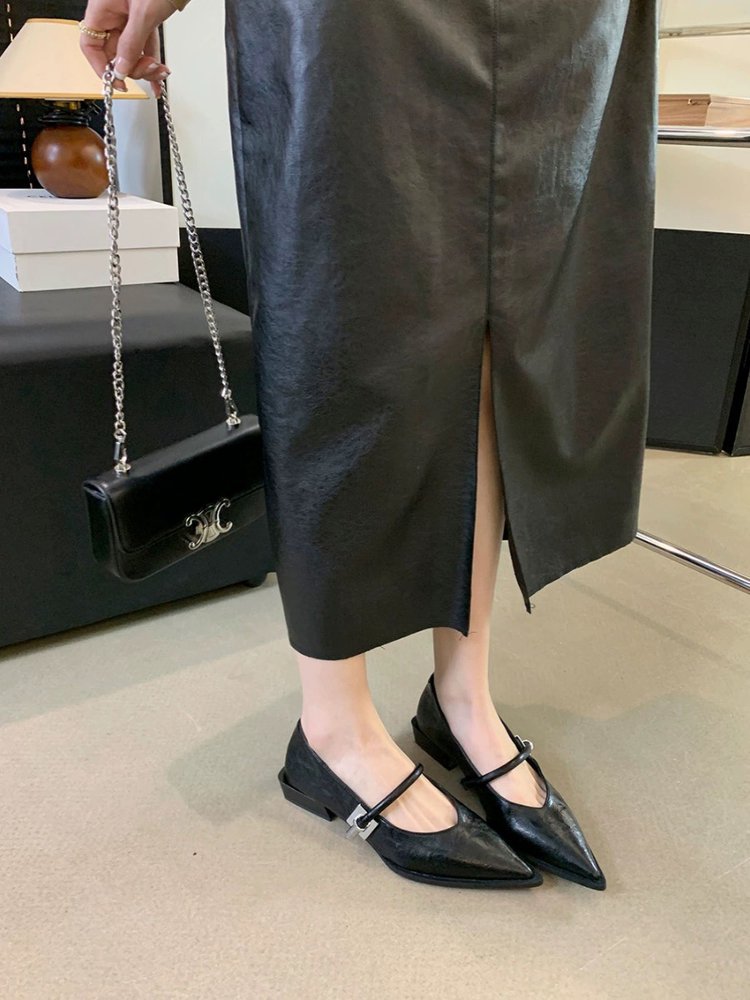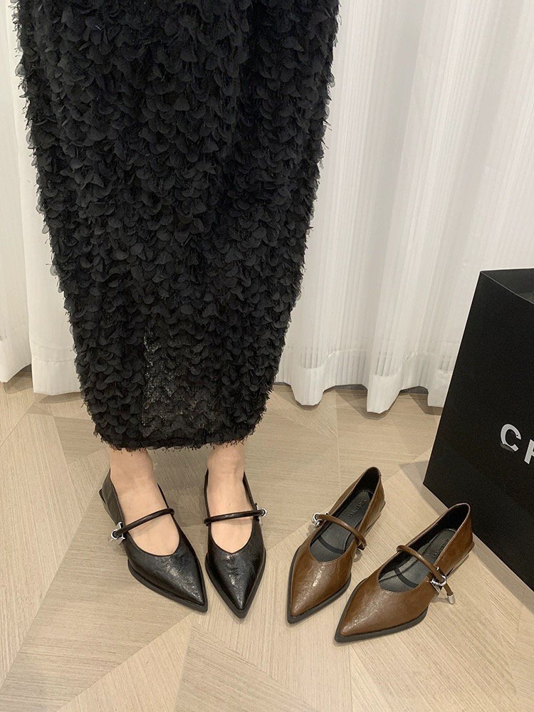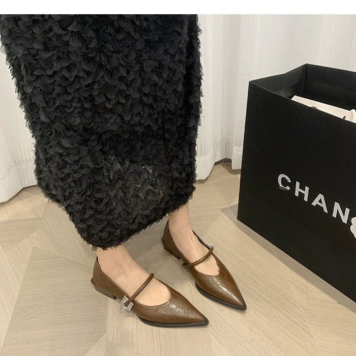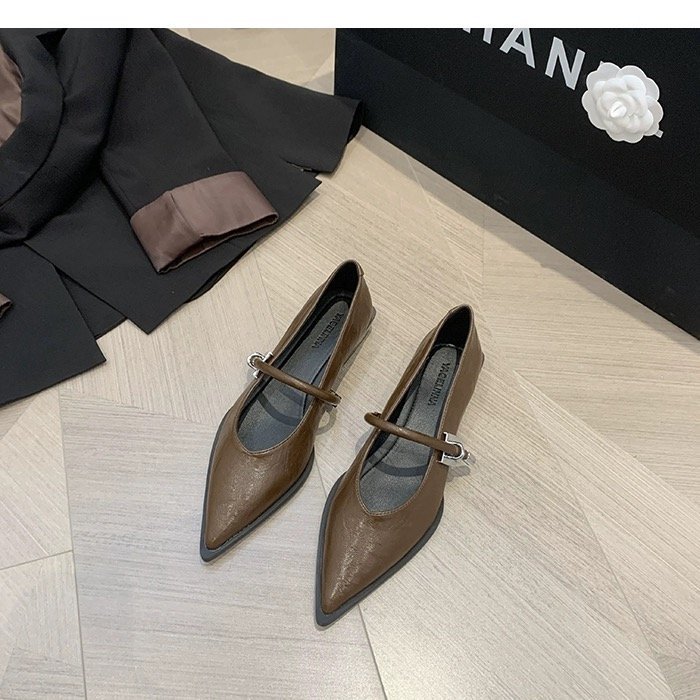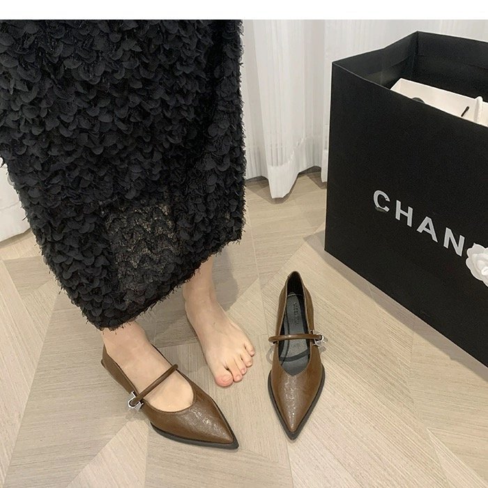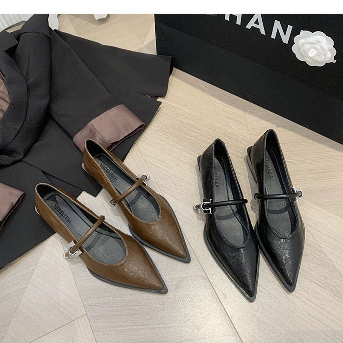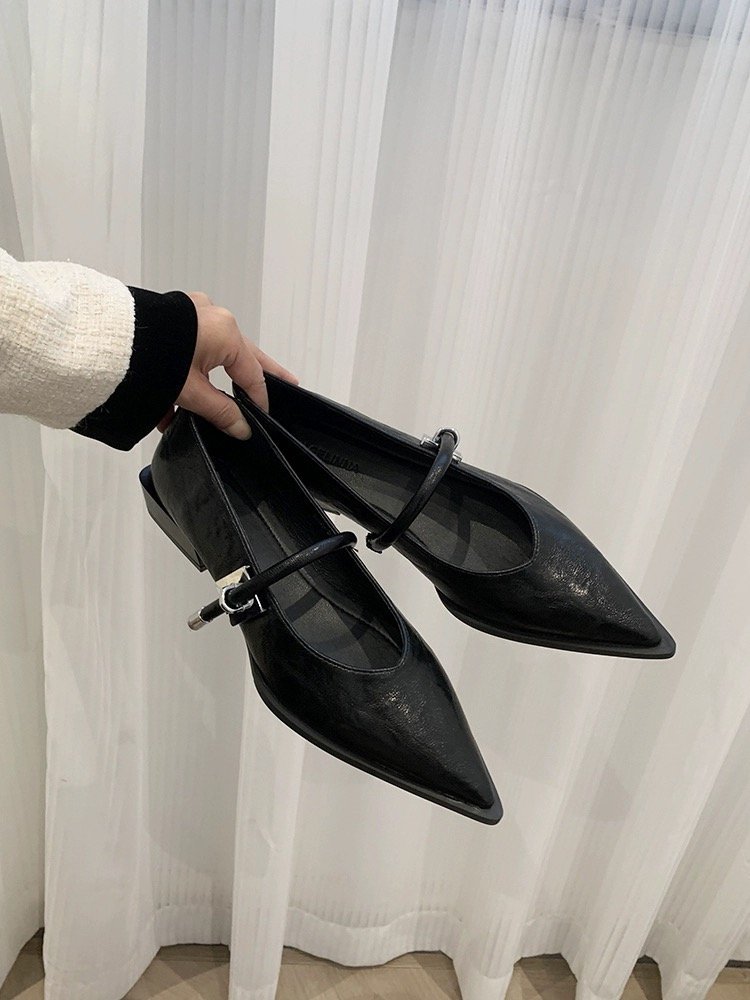 레트로 뾰족한 발가락 싱글 레이어 신발 올 매치 원 스트랩 캐주얼 청키 힐 로우 입 여성 신발 새로운 한국식 금속 버클 로우 힐 여성 신발