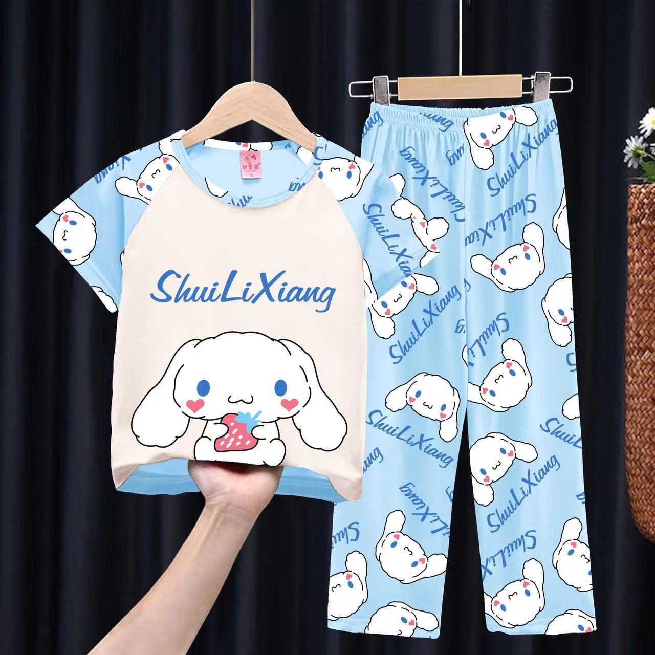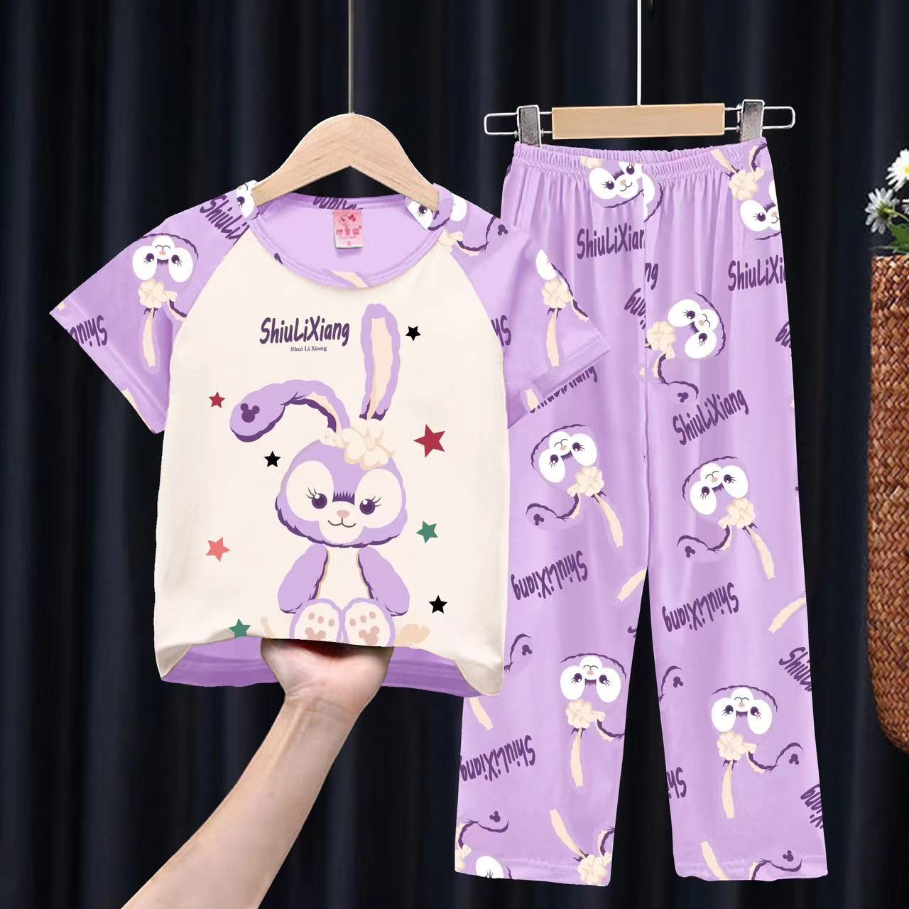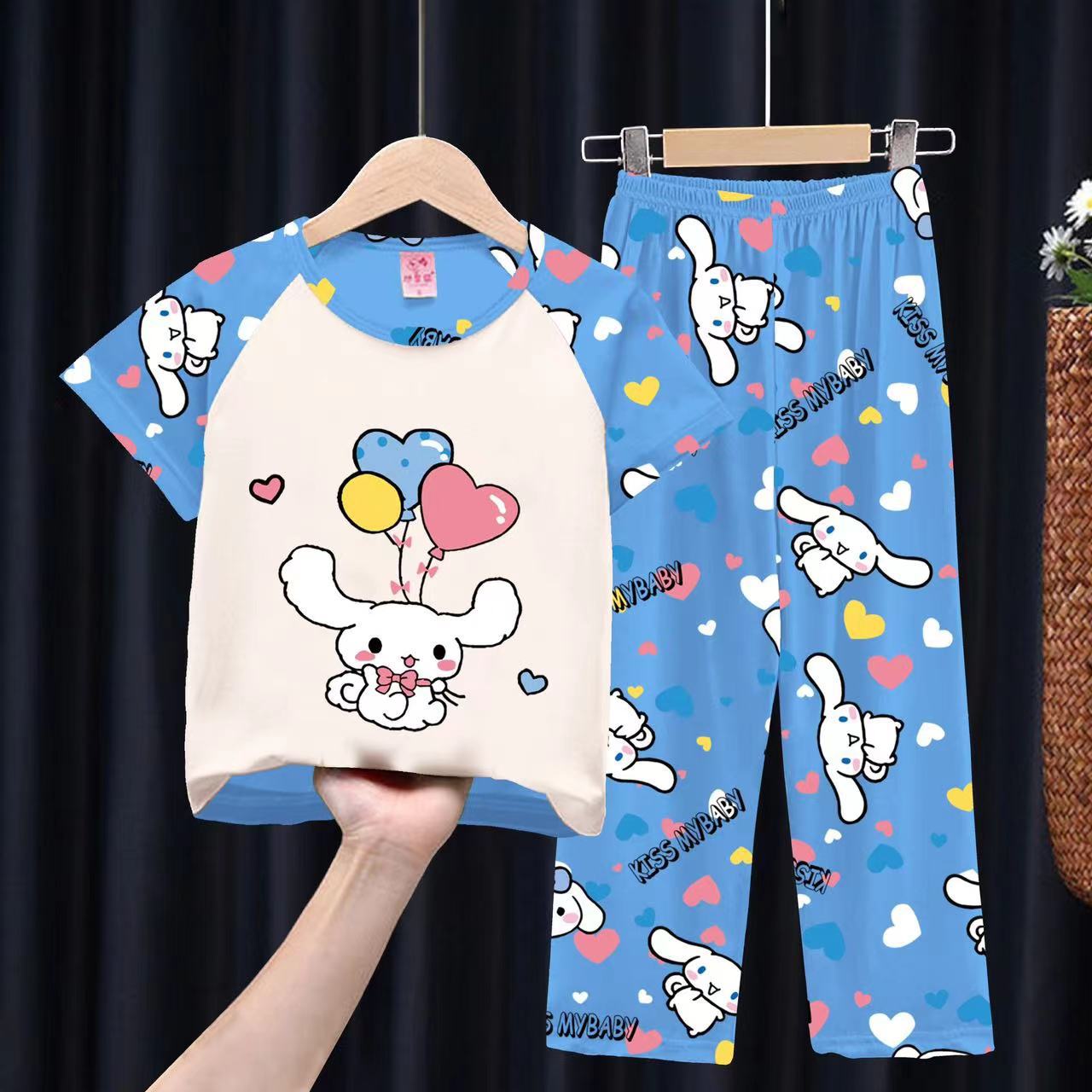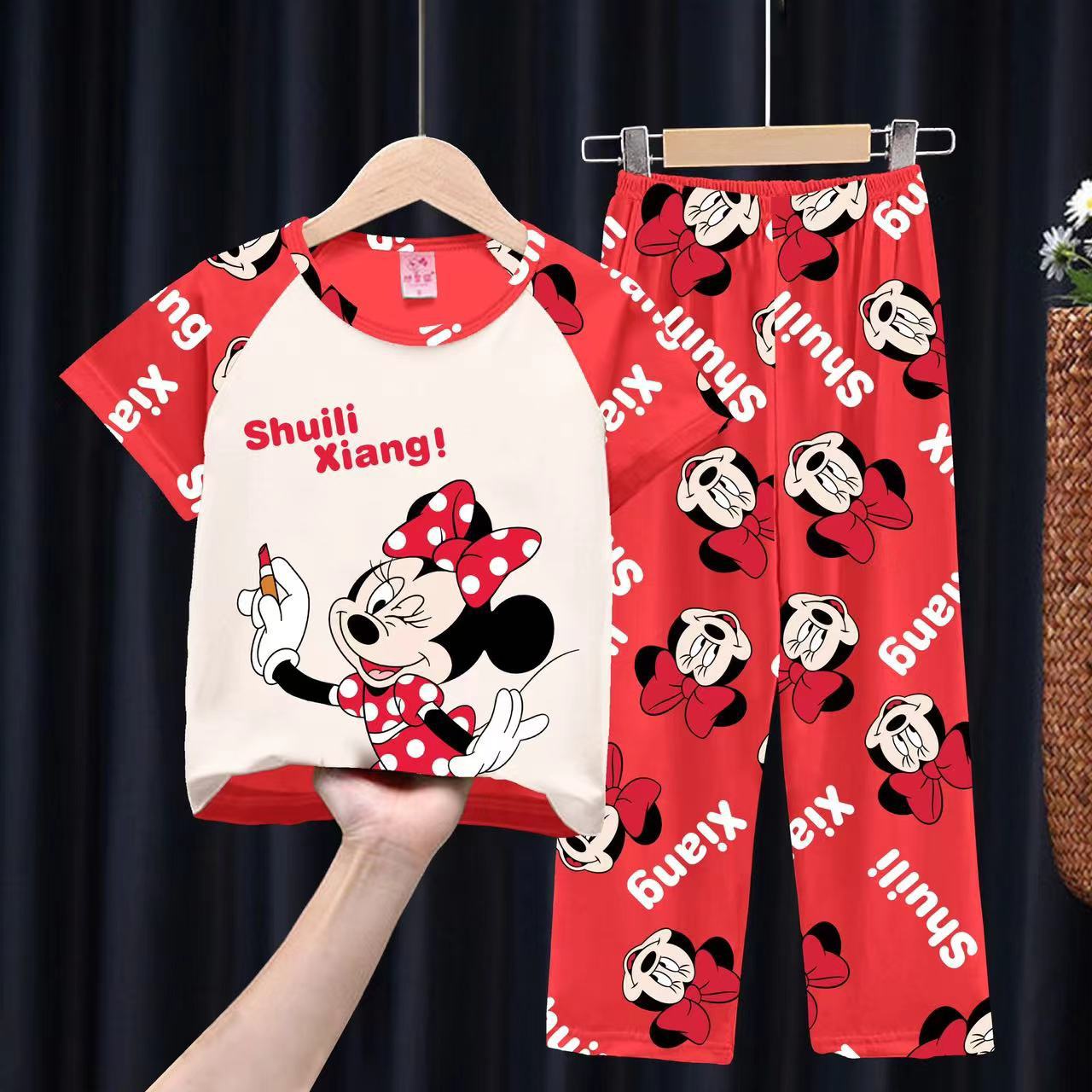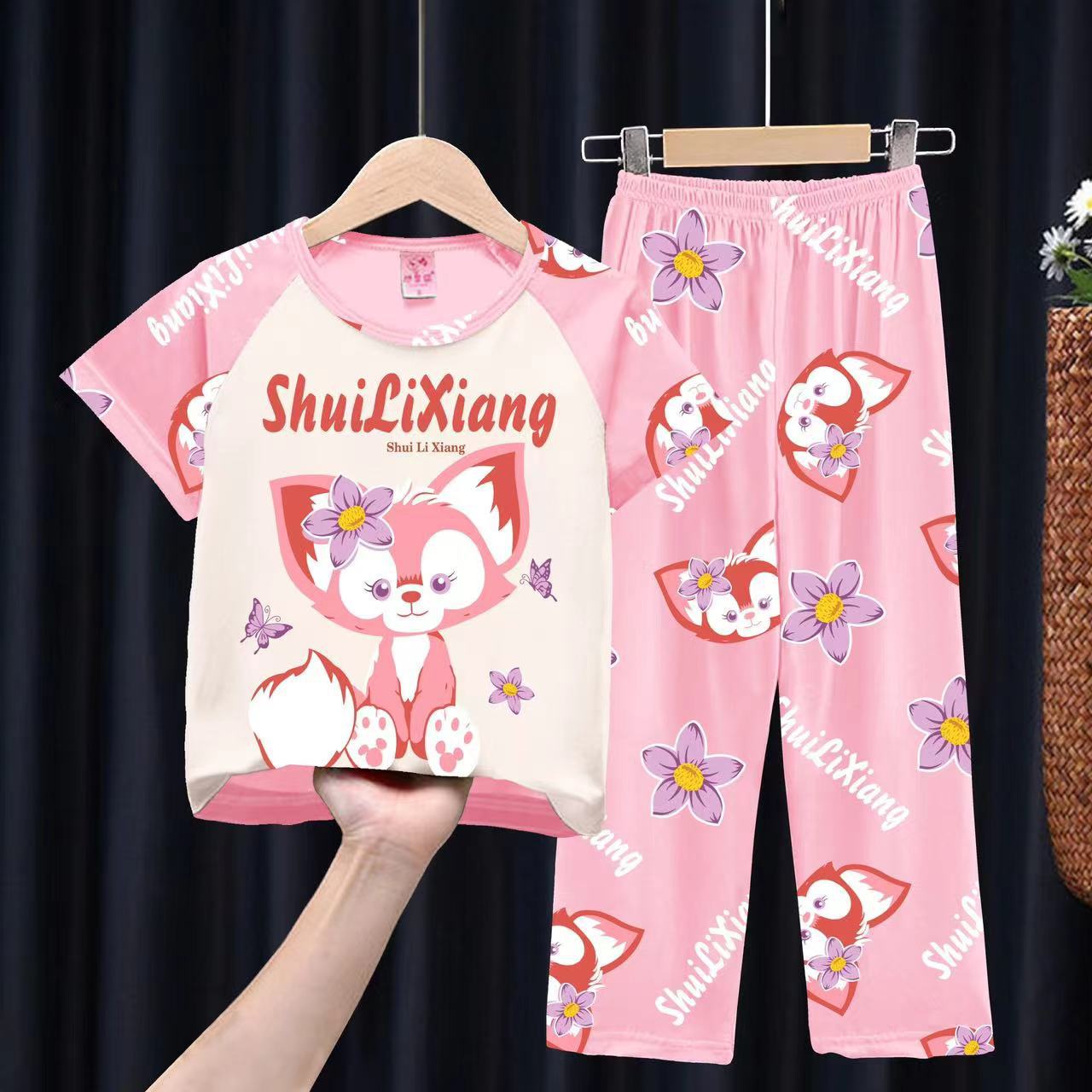 여자 잠옷 여름 어린이 반팔 바지 얇은 중형 및 큰 어린이 아기 만화 공주 소녀의 홈웨어 세트