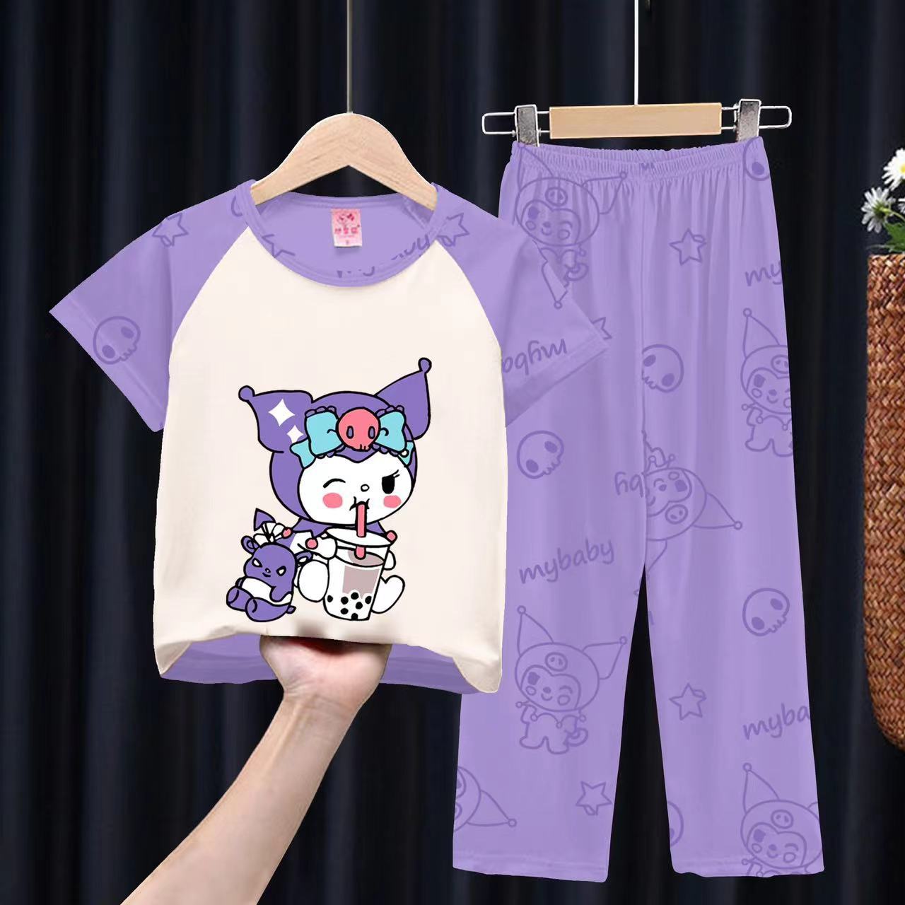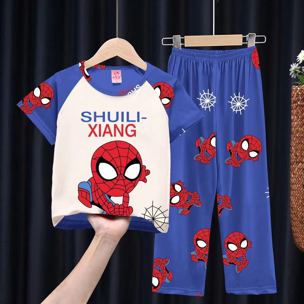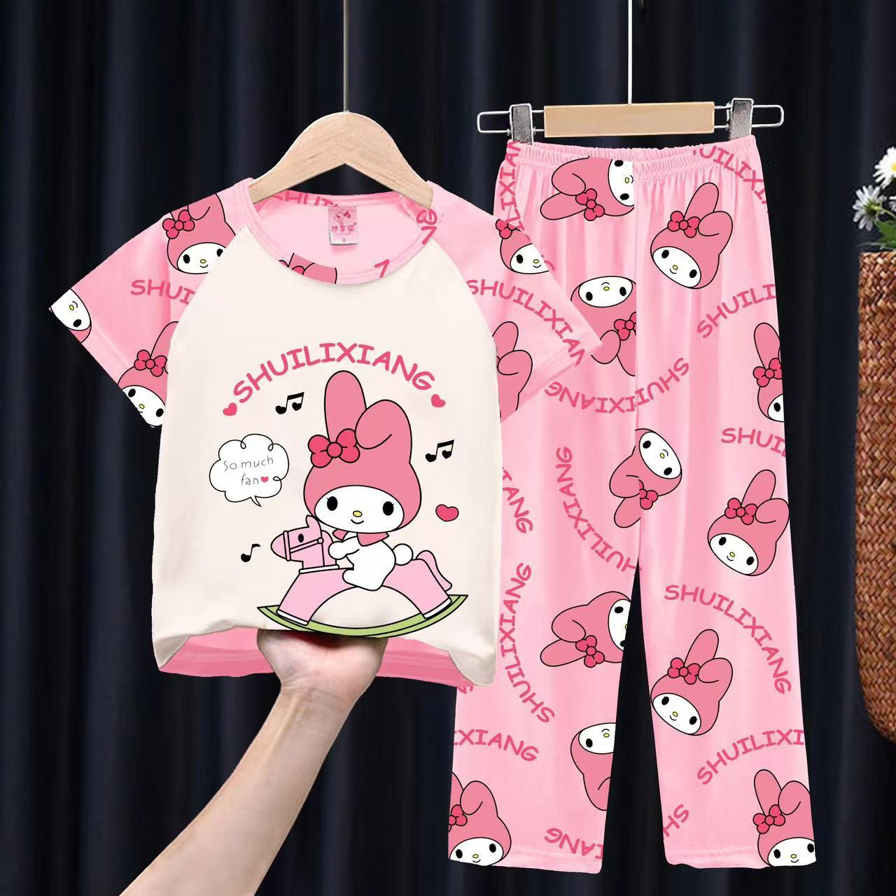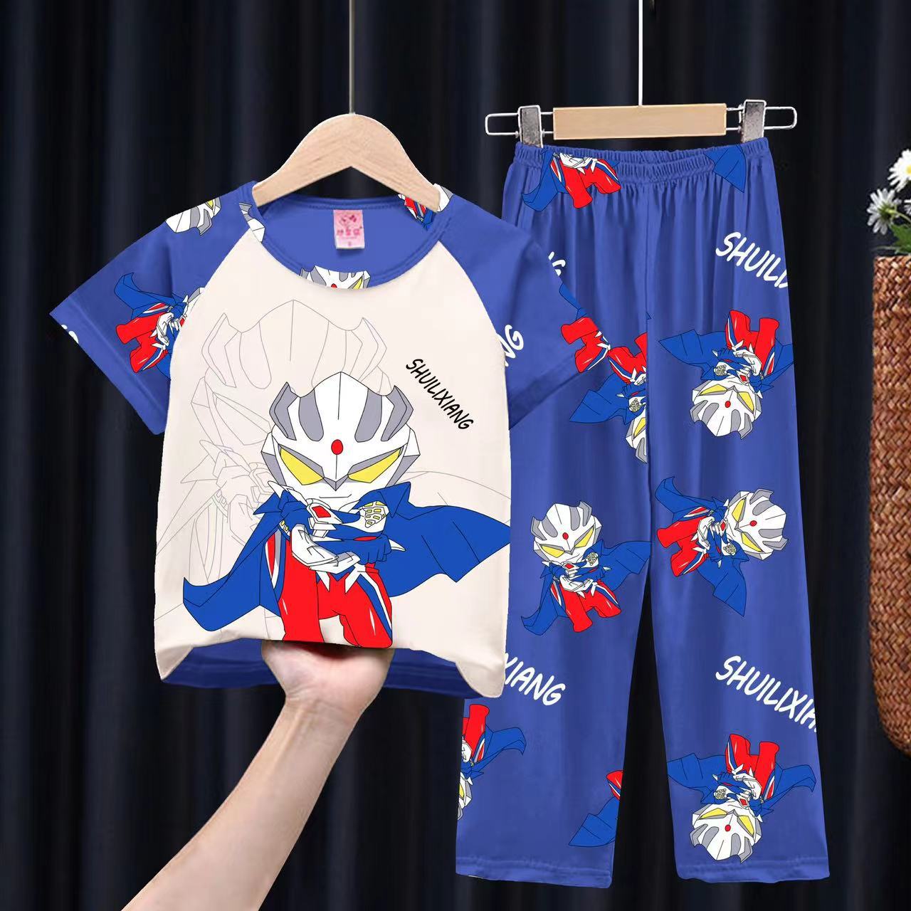 여자 잠옷 여름 어린이 반팔 바지 얇은 중형 및 큰 어린이 아기 만화 공주 소녀의 홈웨어 세트