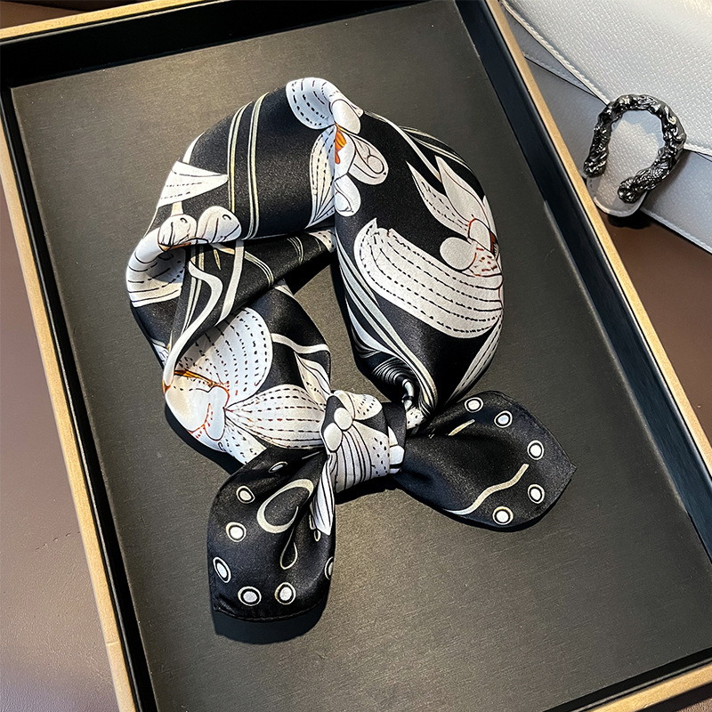 검은 실크 스카프 여성의 실크 작은 사각형 스카프 100% 뽕나무 실크 2024 새로운 우아한 전문 복고풍 올 매치 작은 실크 스카프