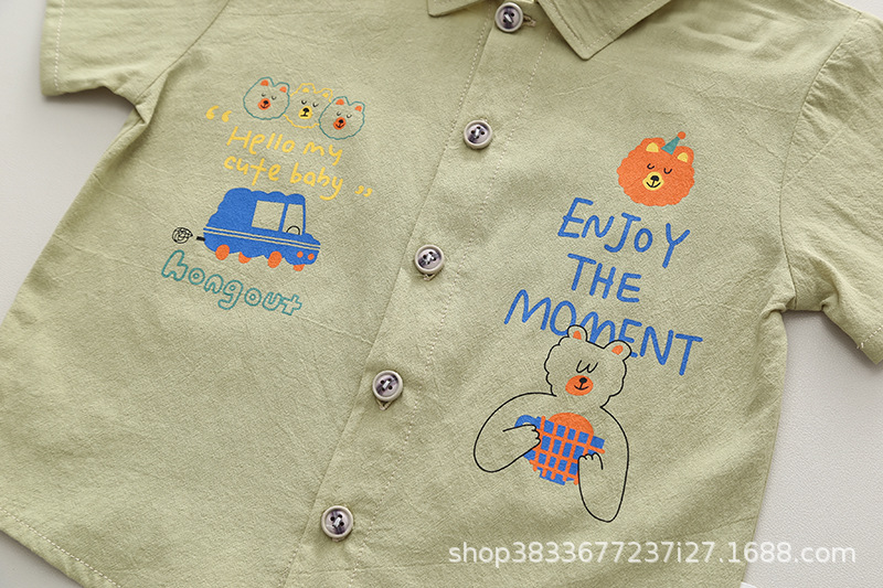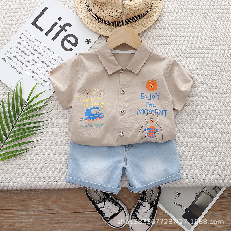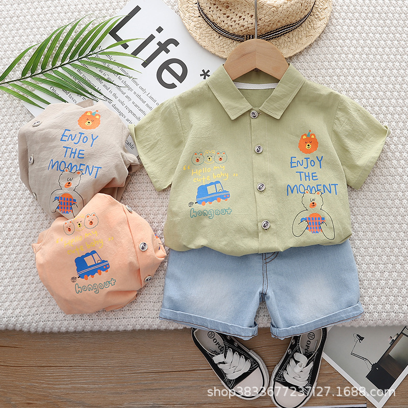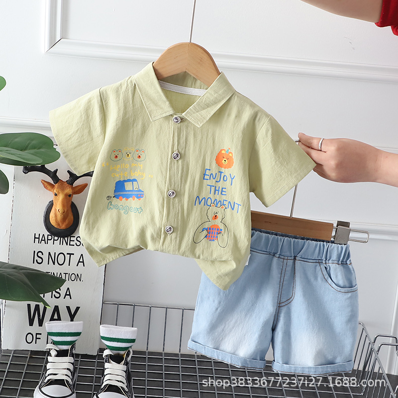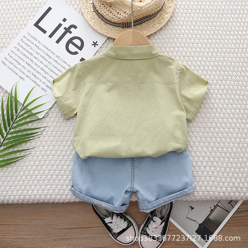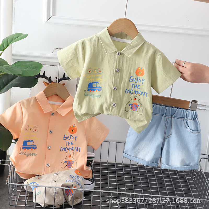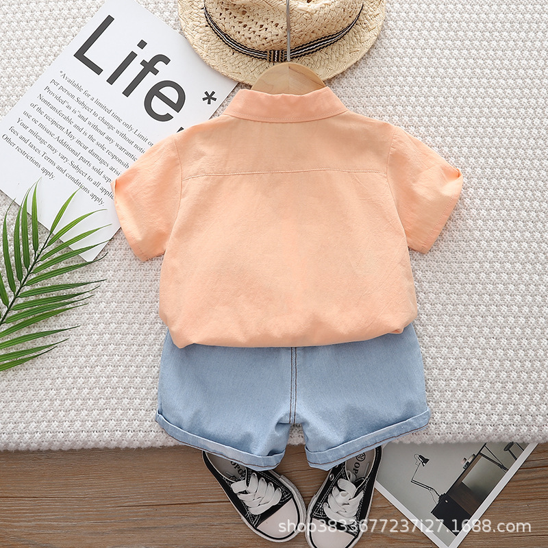 소년 옷깃 셔츠 반팔 세트 2024 여름 새 소년 캐주얼 데님 반바지 투피스 세트스토어 가기