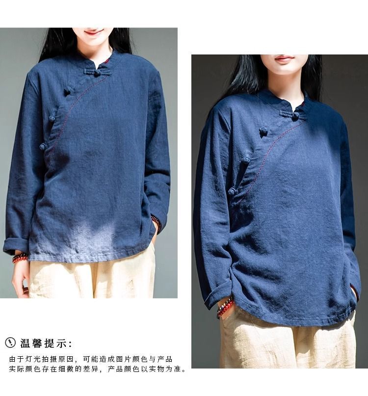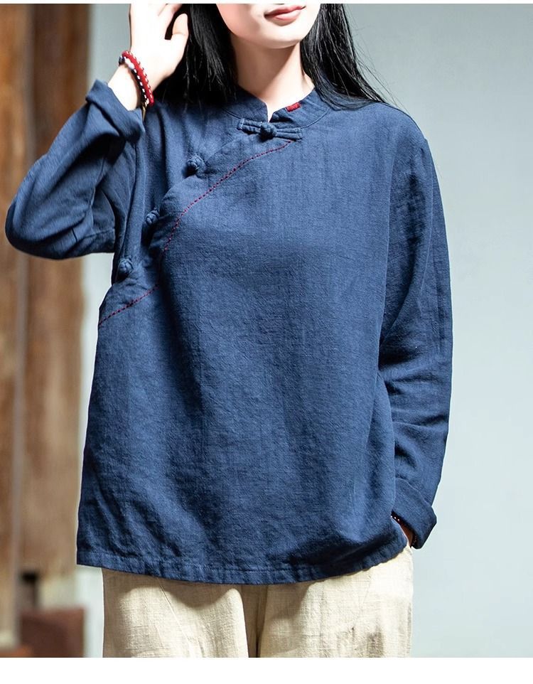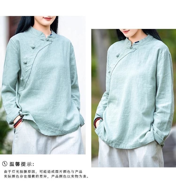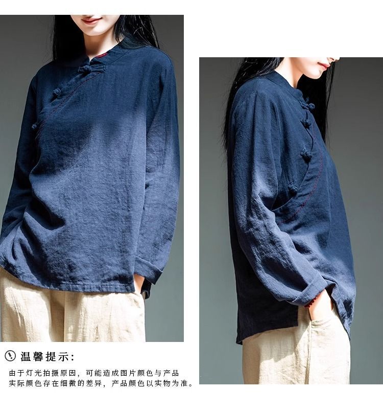 여성 대외 무역 예술적 복고풍 봄/여름 가을면과 린넨 긴 소매 느슨한 슬리밍 탑 스탠드 칼라 대각선 버튼 셔츠