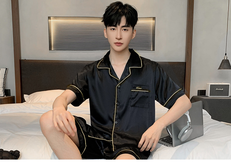 잠옷 남성 여름 여름 아이스 실크 반팔 반바지 실크 홈 착용 여름 남성 인공 실크 얇은 세트스토어 가기