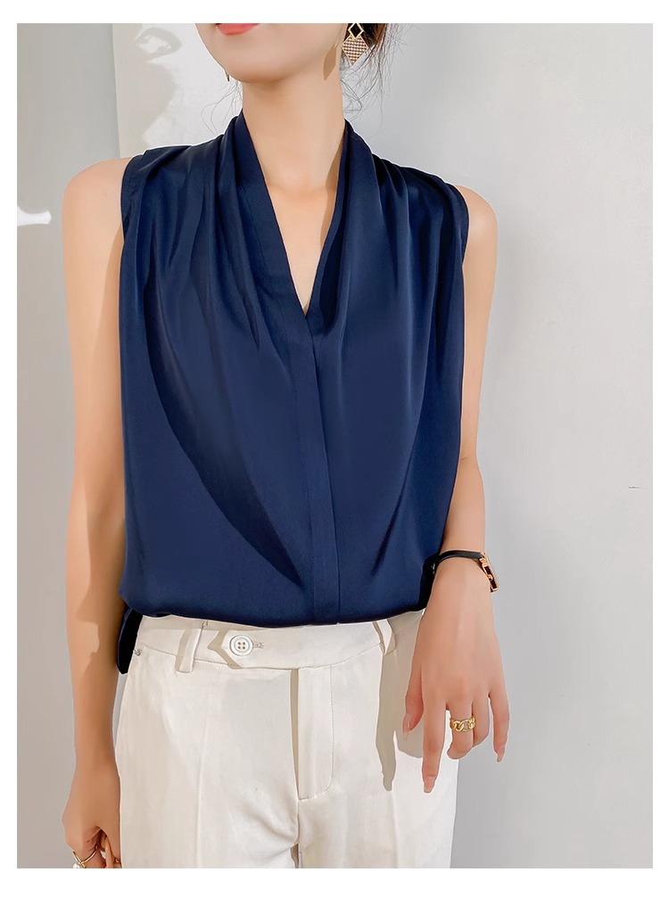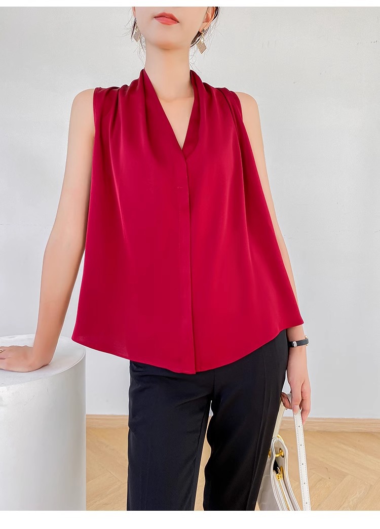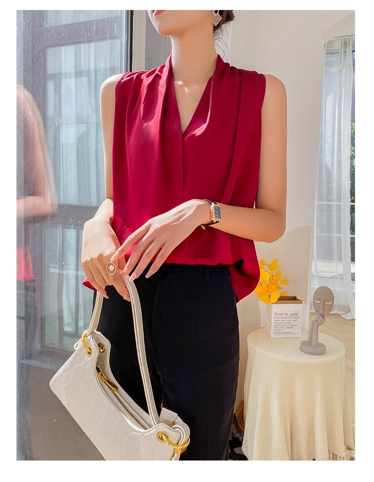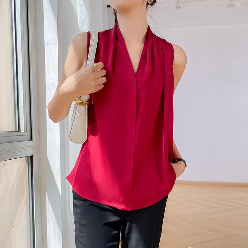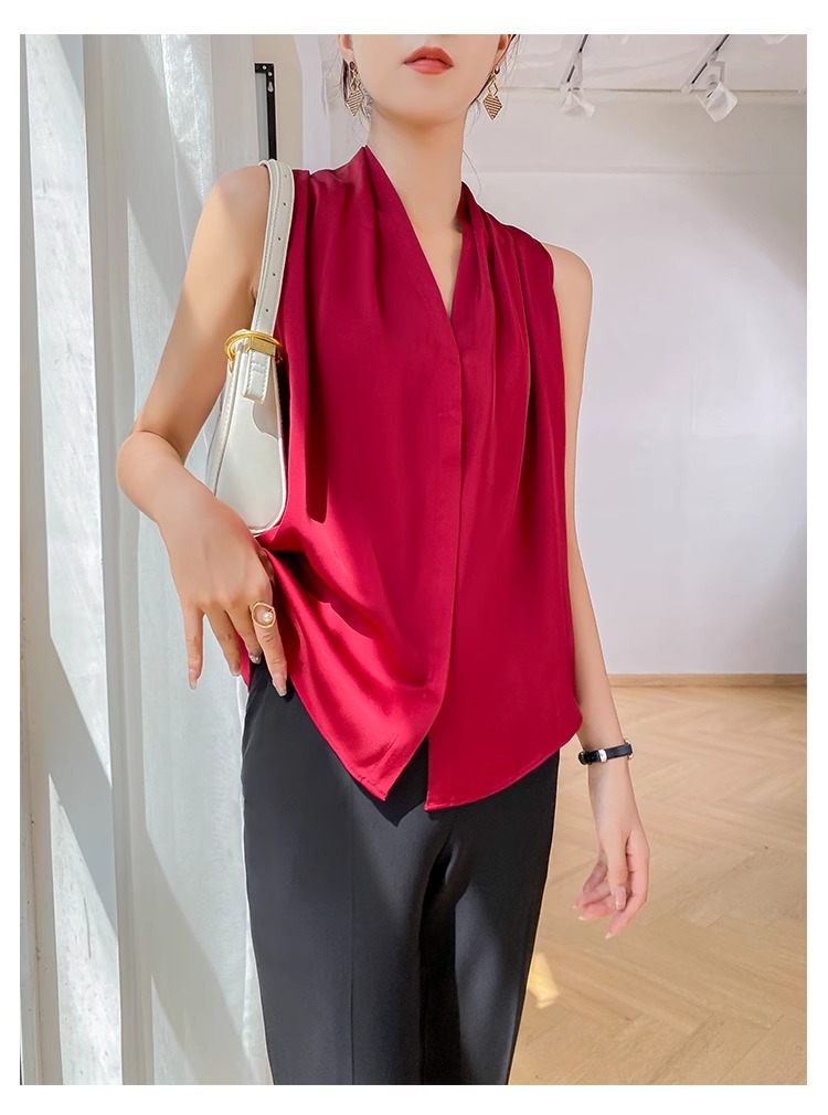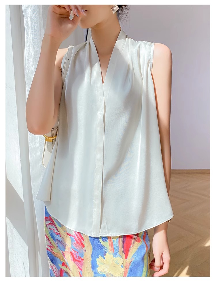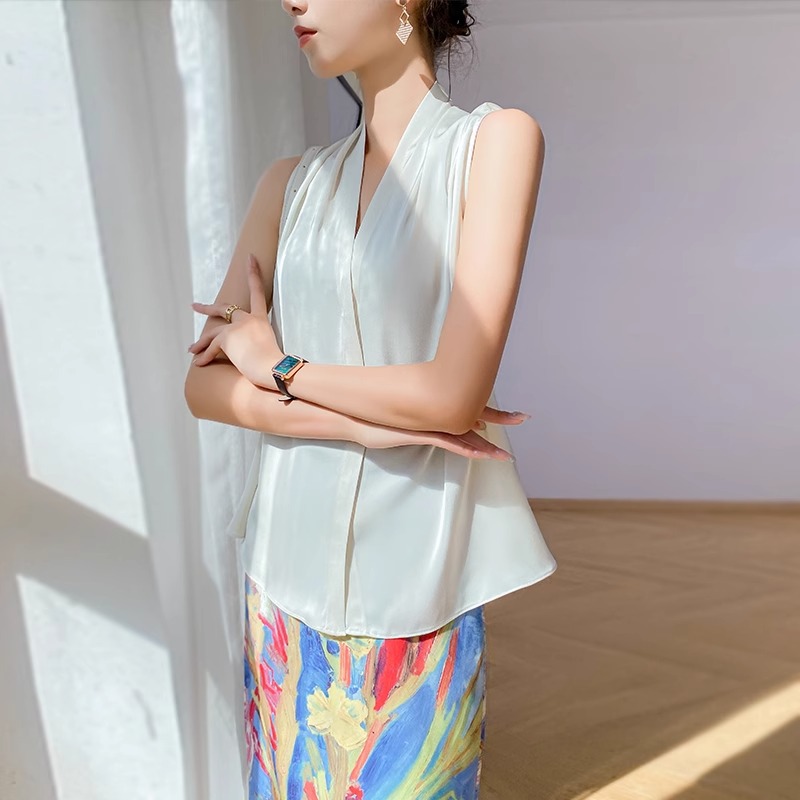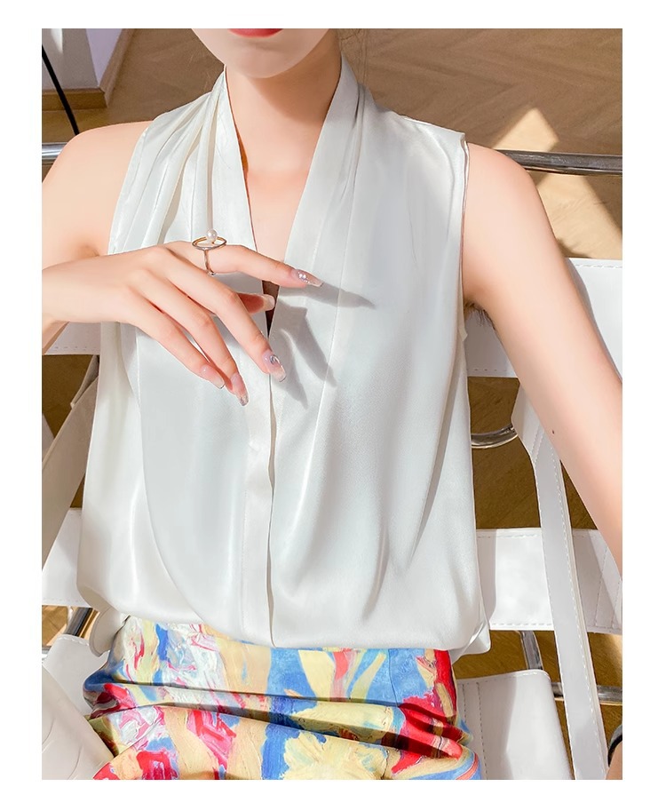 재고 프렌치 스타일 딥 V 민소매 목 탑 여성 여름 하이 엔드 아세테이트 조끼 새틴 칙 쉬폰 어깨 셔츠