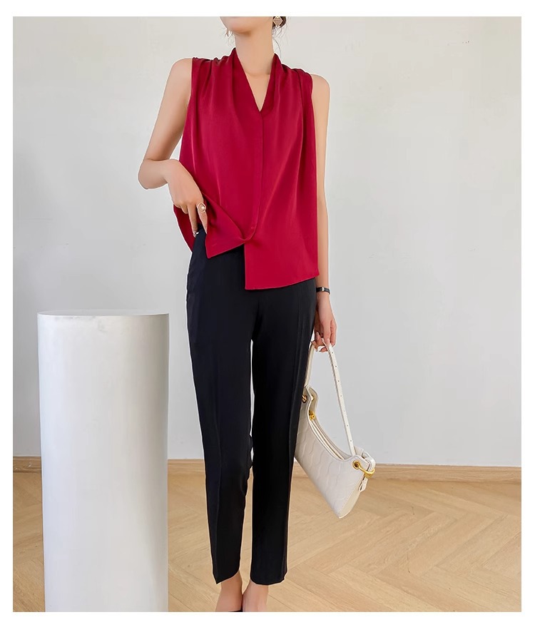 재고 프렌치 스타일 딥 V 민소매 목 탑 여성 여름 하이 엔드 아세테이트 조끼 새틴 칙 쉬폰 어깨 셔츠스토어 가기