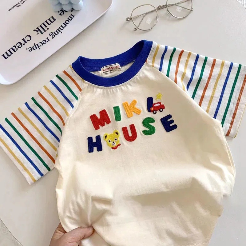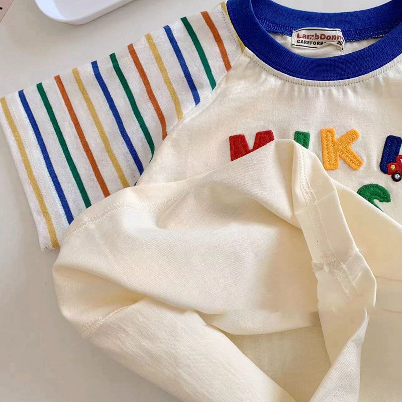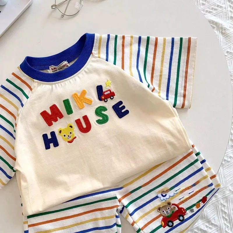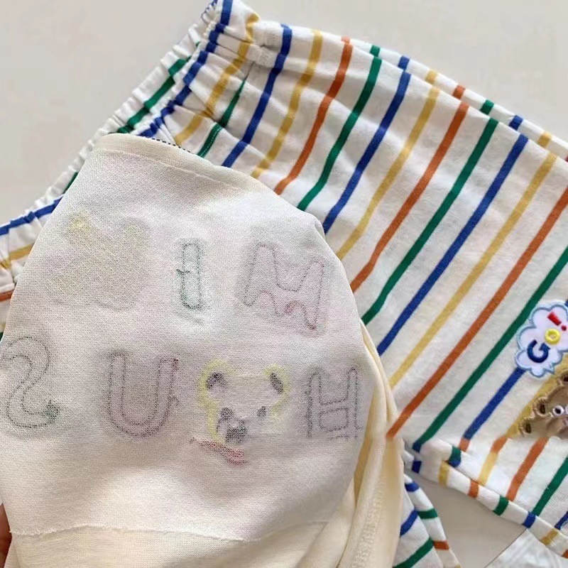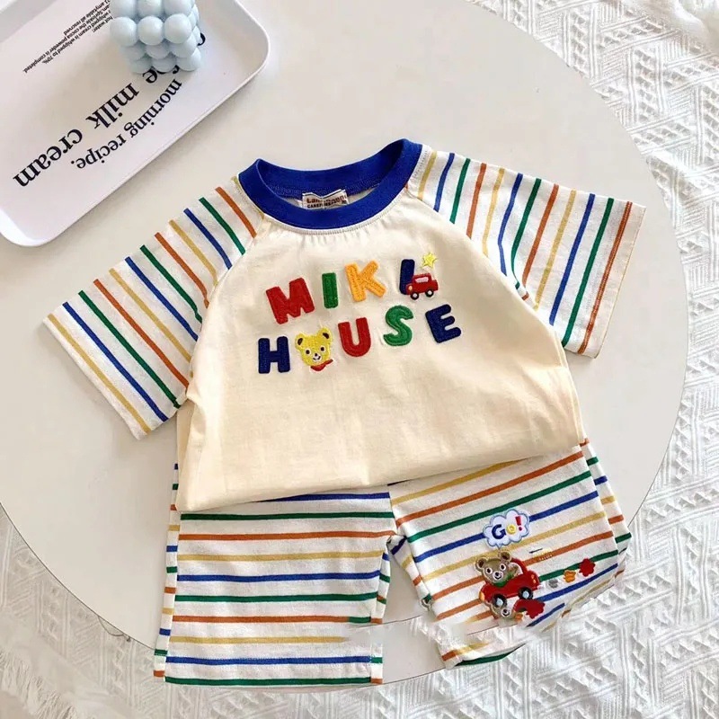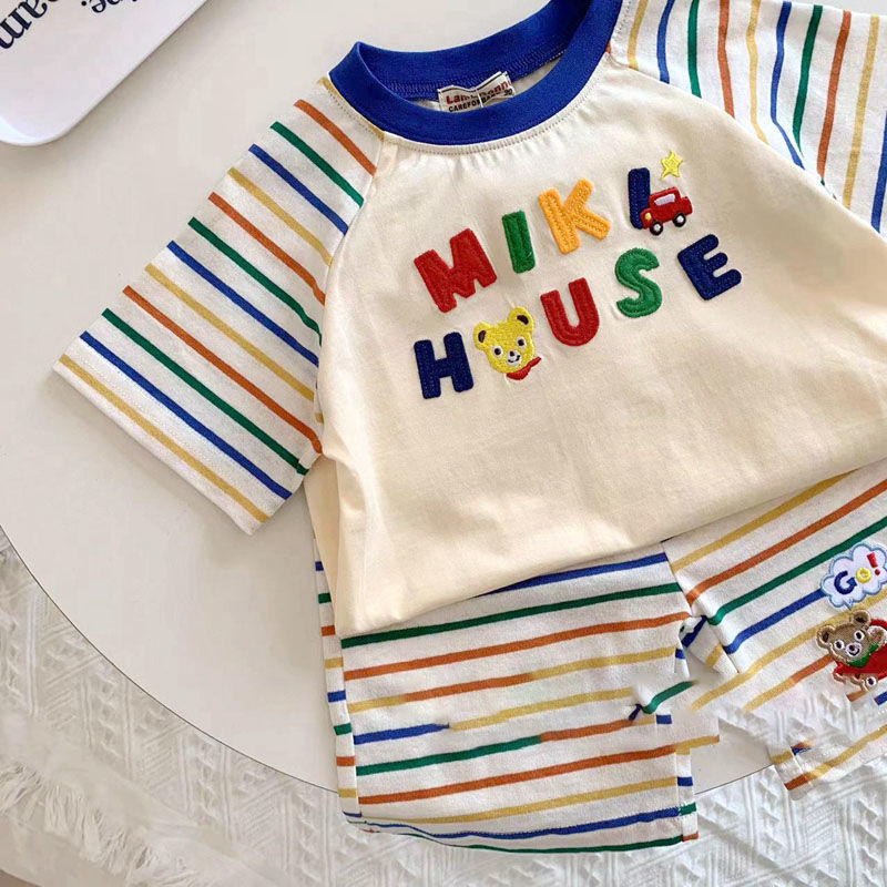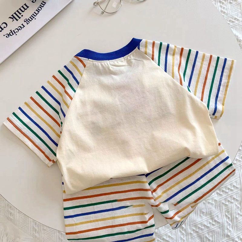 일본의 새로운 아동복 여름 소년 소녀 컬러 스트라이프 스티칭 반팔 반바지 세트 어린이 아기 투피스 세트 패션스토어 가기