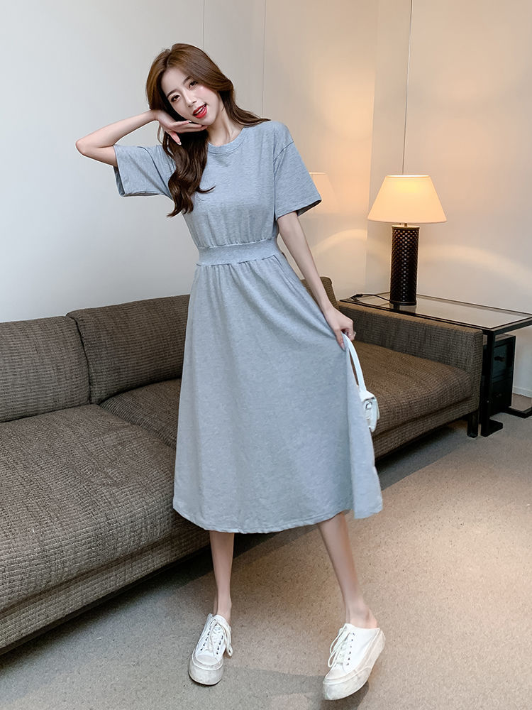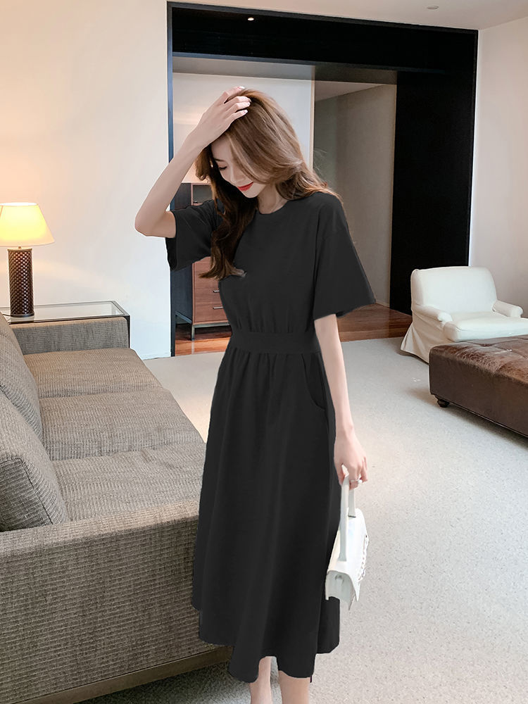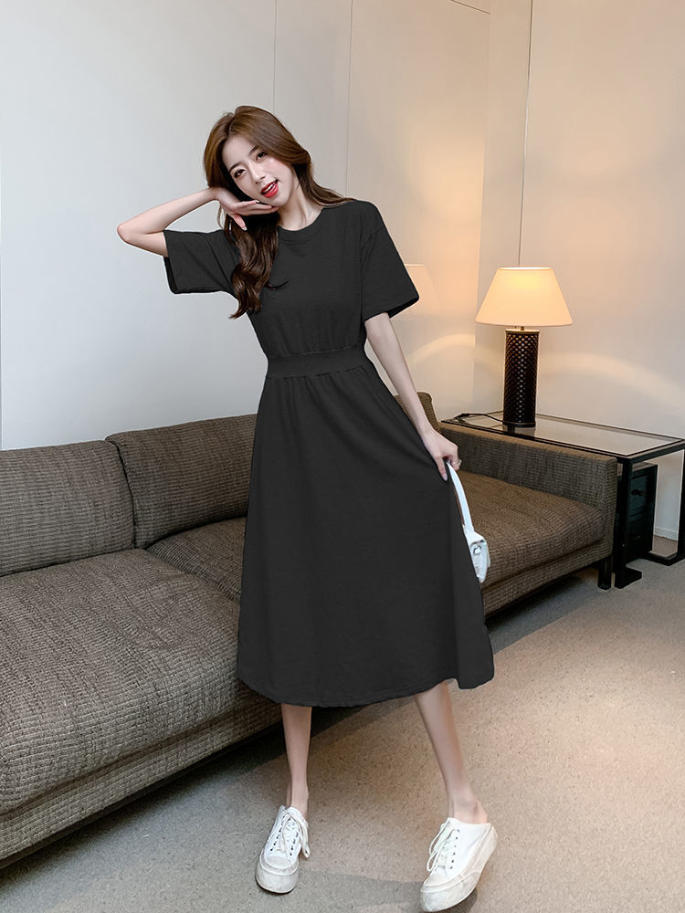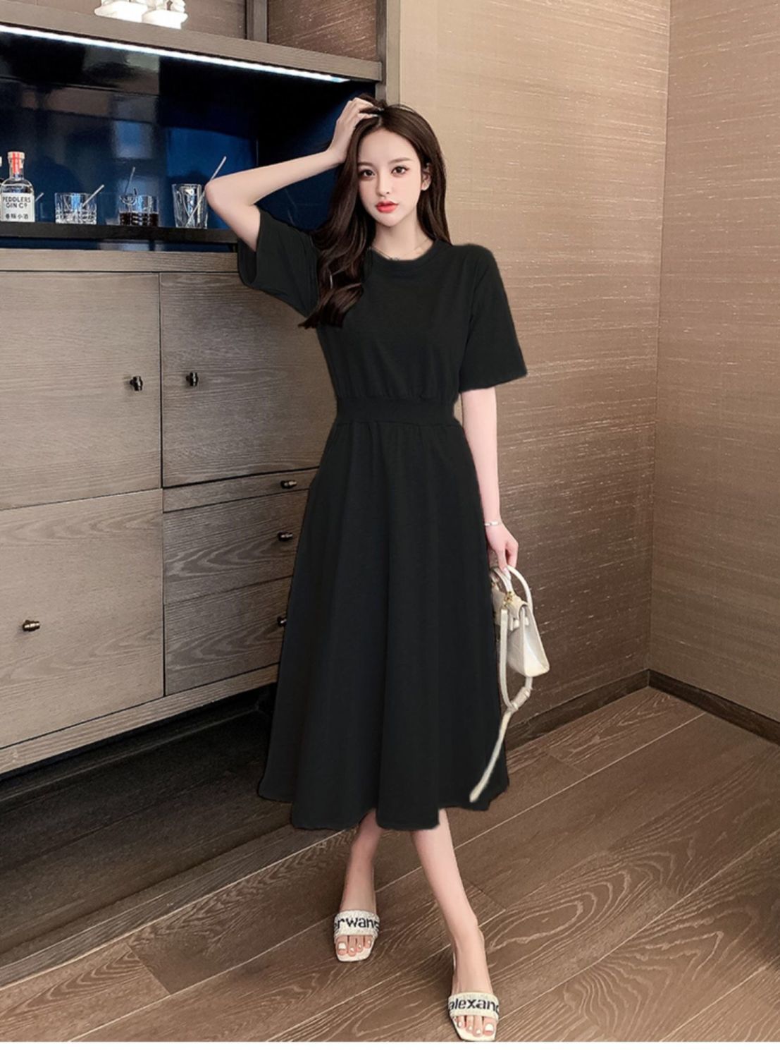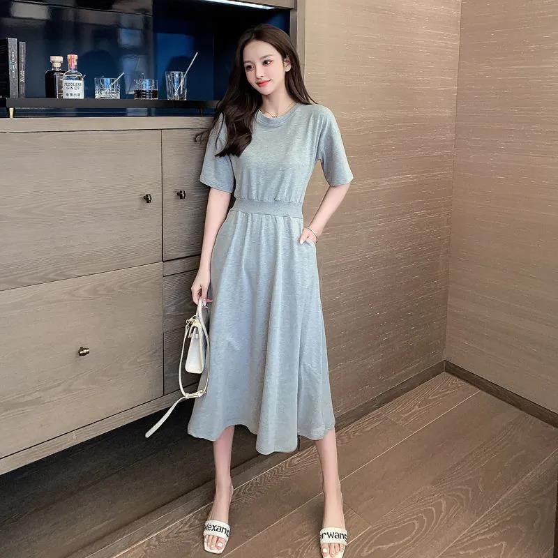 단색 간단한 원피스 큰 스윙 스커트 소녀 2024 한국 스타일 반소매 허리 긴 스커트 높은 허리 라운드 칼라 스커트스토어 가기