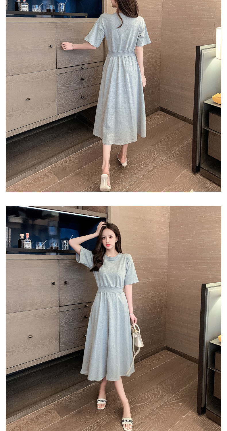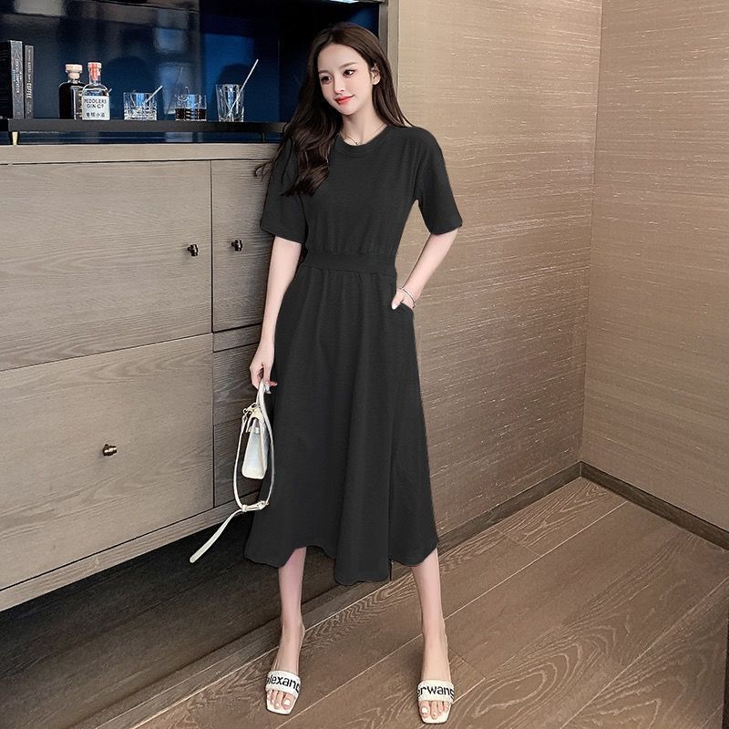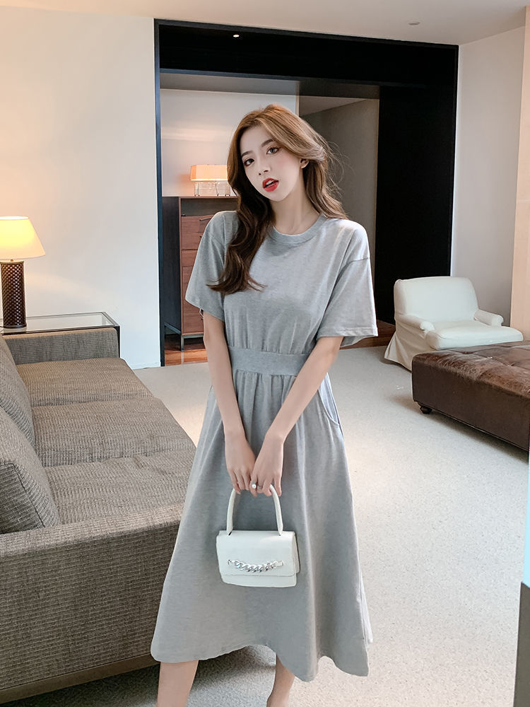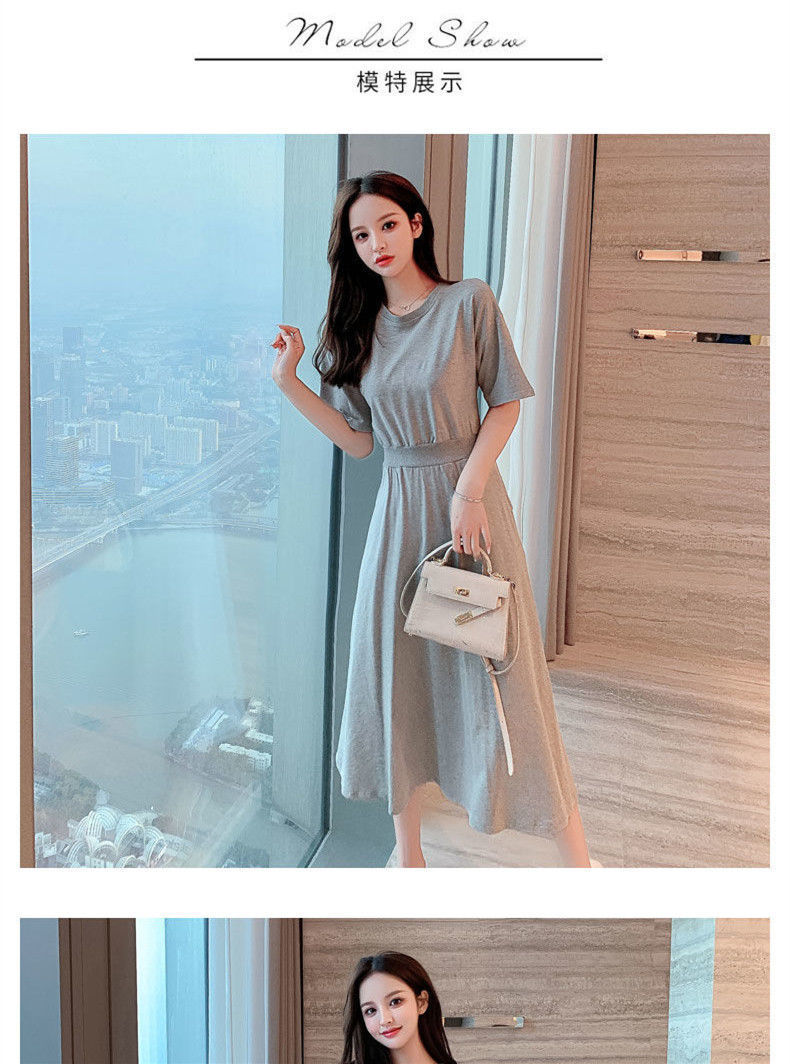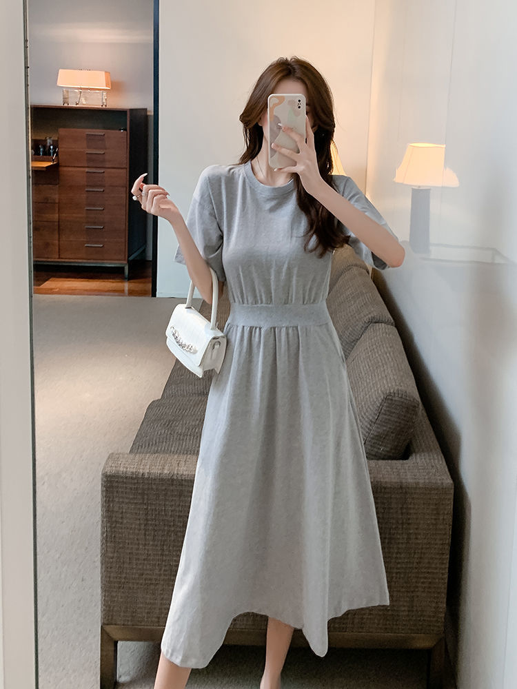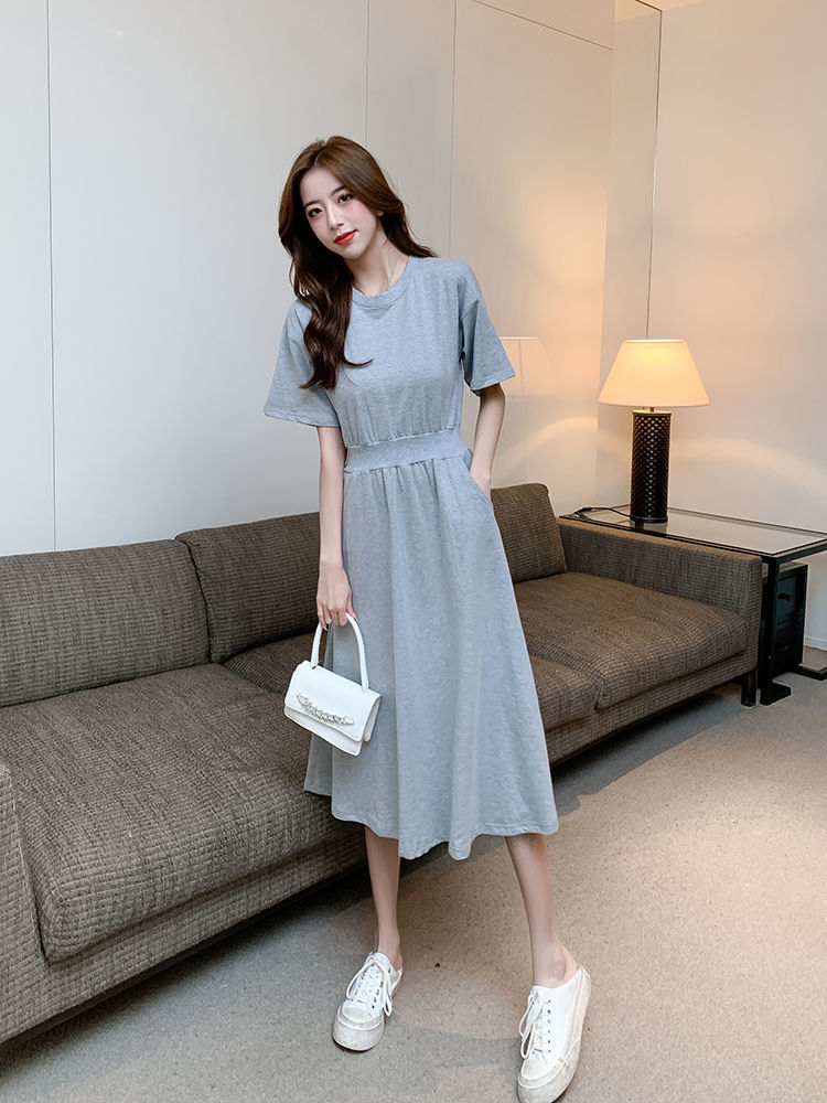 단색 간단한 원피스 큰 스윙 스커트 소녀 2024 한국 스타일 반소매 허리 긴 스커트 높은 허리 라운드 칼라 스커트스토어 가기