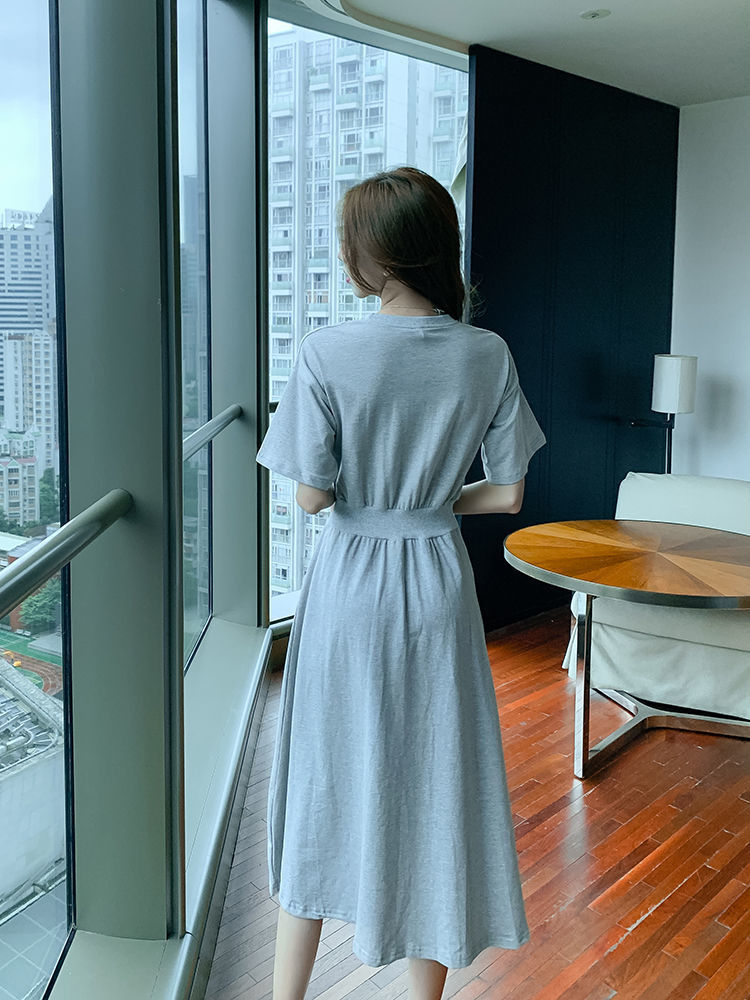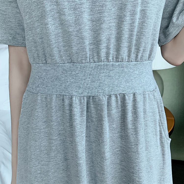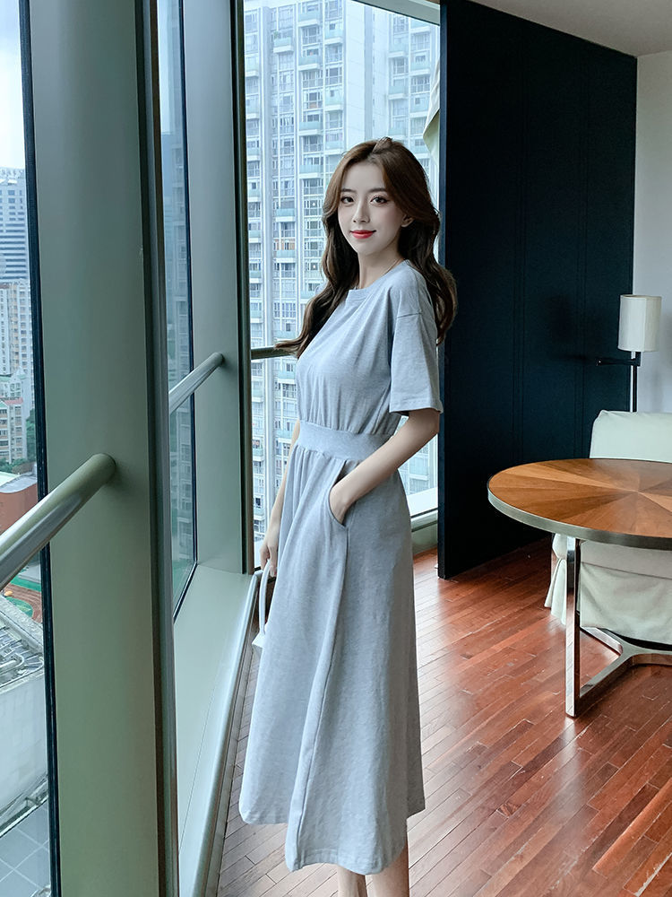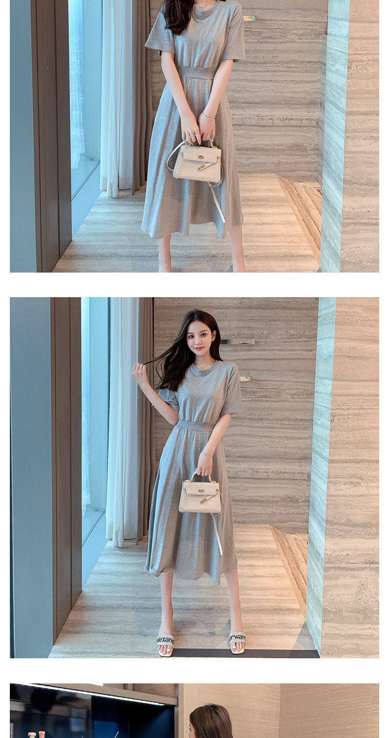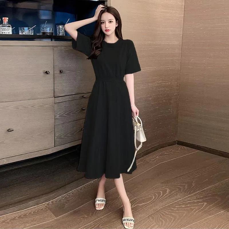 단색 간단한 원피스 큰 스윙 스커트 소녀 2024 한국 스타일 반소매 허리 긴 스커트 높은 허리 라운드 칼라 스커트스토어 가기