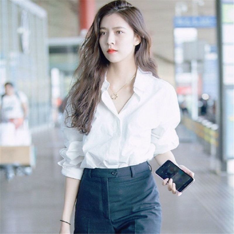 2025 봄, 가을 새로운 느슨한 긴팔 흰색 셔츠 여성 기본 디자인 흰색 셔츠 캐주얼 탑 다목적스토어 가기